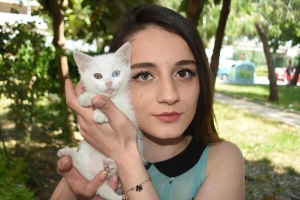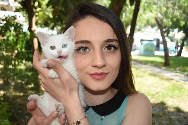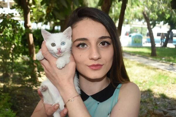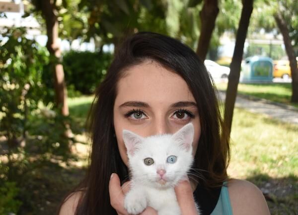İzmir'de, doğuştan bir gözü yeşil, bir gözü kahverengi olan Simay Şen (19) ile beslediği bir gözü mavi diğeri yeşil Van kedisi 'Dombi', ilgi odağı oluyor. Kedisiyle birlikte tüm dikkatleri üzerine çektiğini belirten Şen, "Gözleri benim gibi olan bir hayvana sahip olmak farklı bir duygu. Onunla çok uyumlu bir ikili olduk, görenler inanamıyor" dedi.