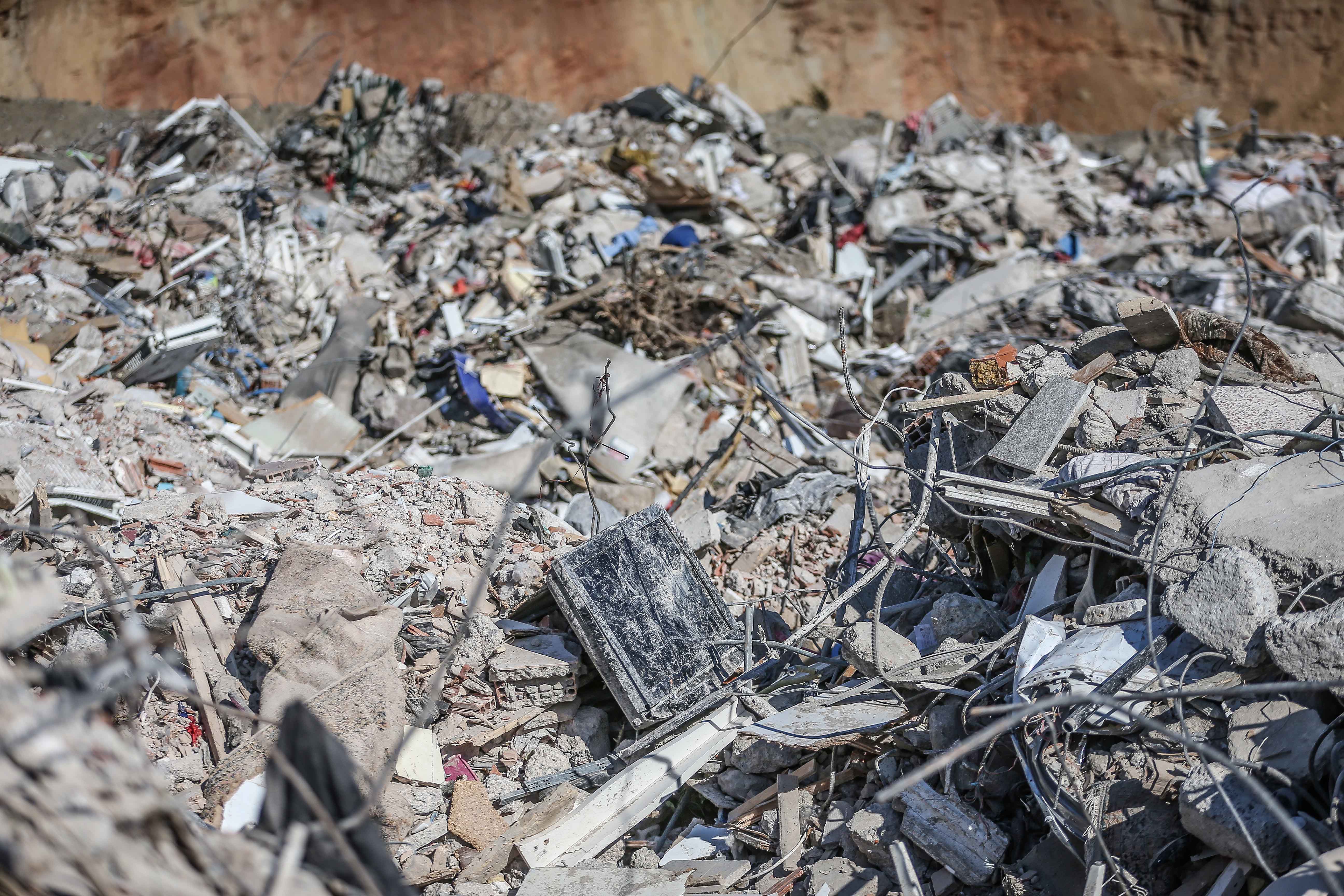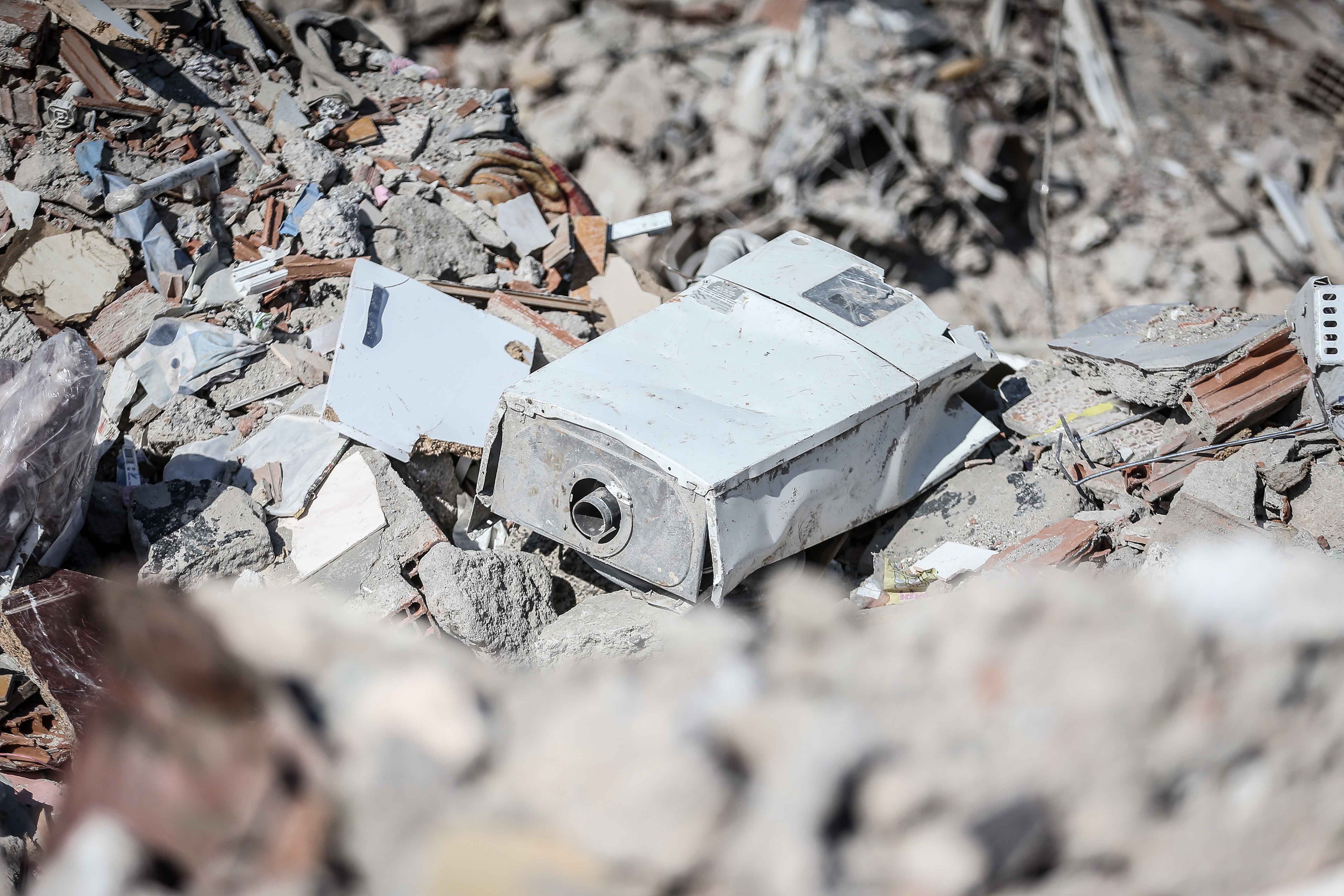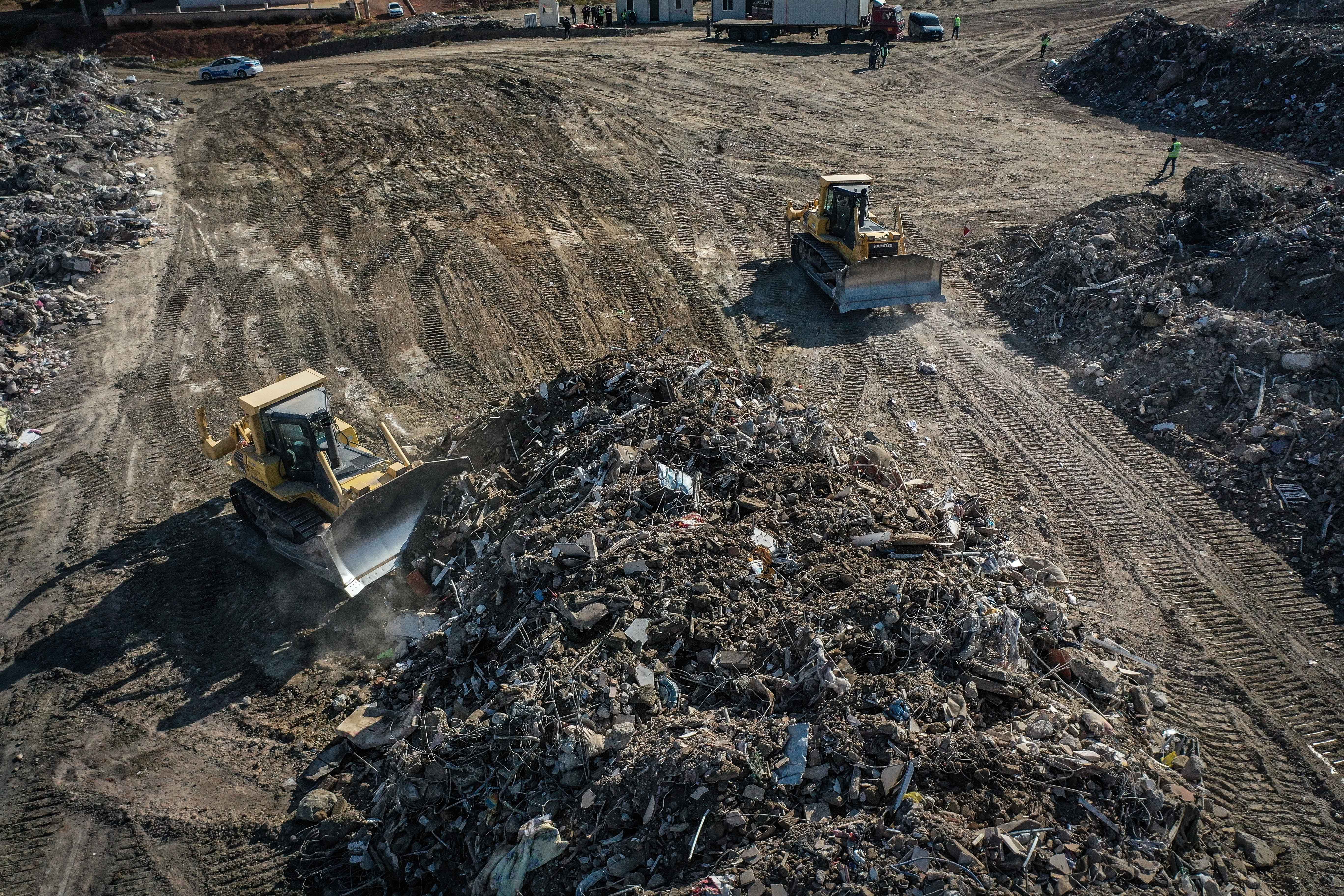 İzmir'de meydana gelen 6,6 büyüklüğündeki depremde yıkılan ve yıkılma tehlikesine karşı kontrollü olarak yıkımı gerçekleştirilen binalardan çıkan molozlar, sahiplerinin incelemesi için güvenli depolama sahasında koruma altına alındı.
