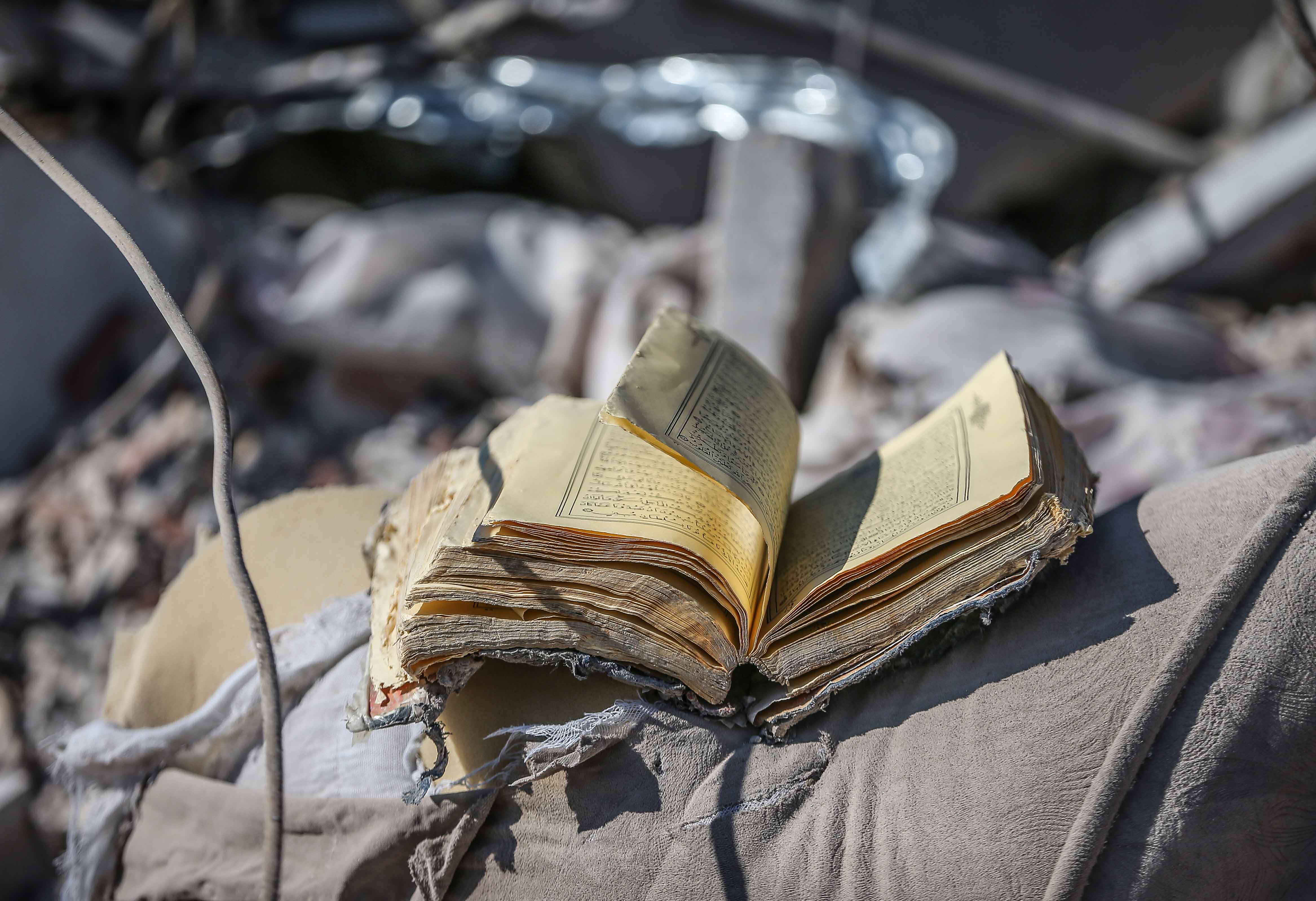 Alana getirilen moloz yıkıntılarının arasında burada görevli bir polis memurunun dikkatiyle Ku'ran-ı Kerim tespit edildi.