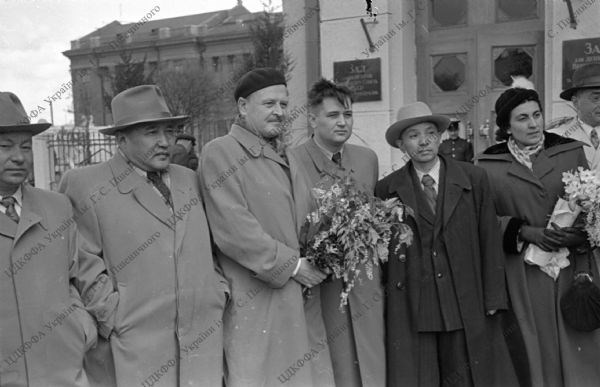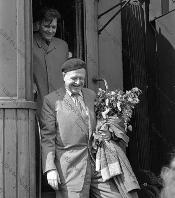 Kiev’deki Ukrayna Devlet Arşivi’nde bulunan fotoğraflarda Nazım Hikmet, Kiev Garı’nda şair ve yazar dostları ve kendisini karşılamaya gelen insanlarla beraber görülüyor.