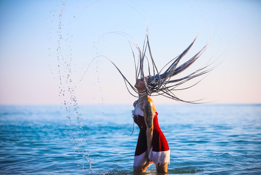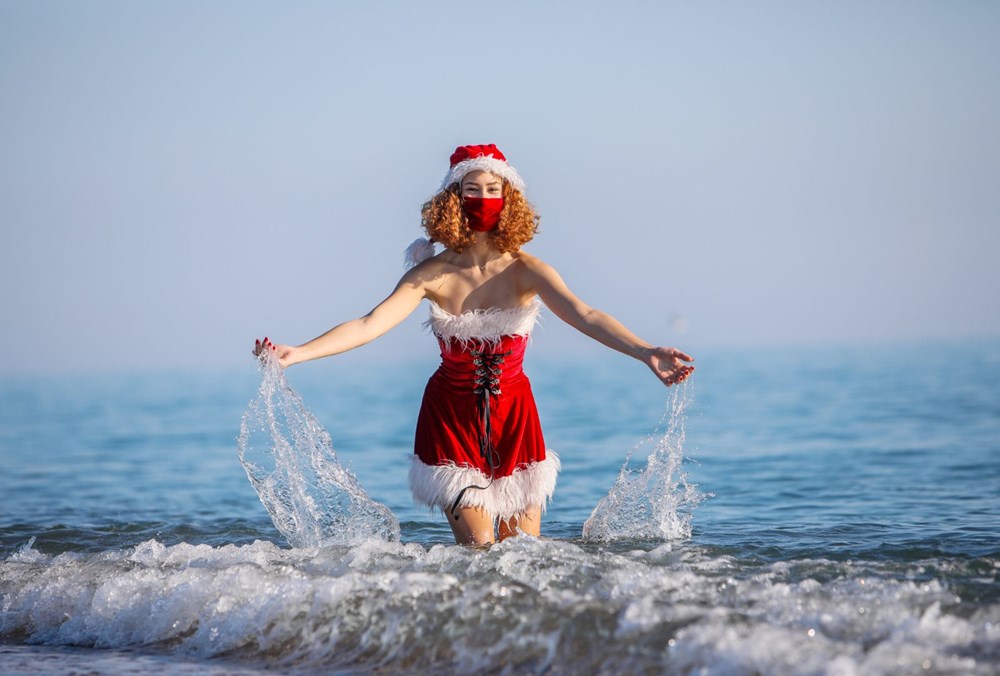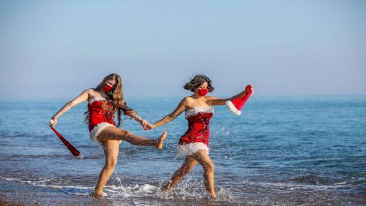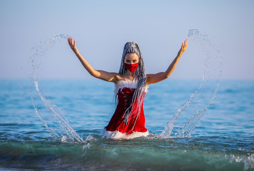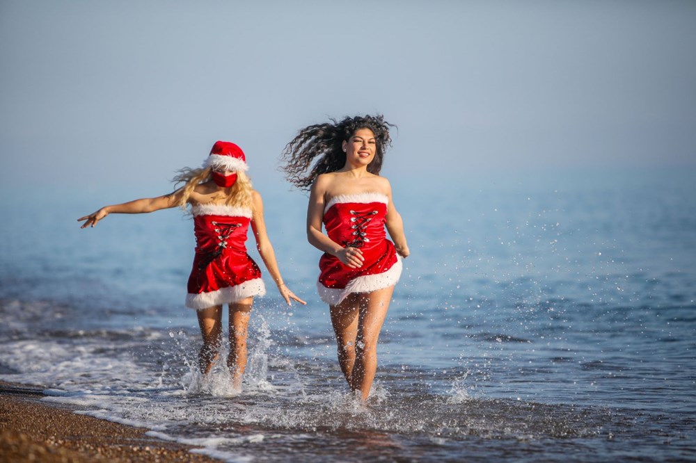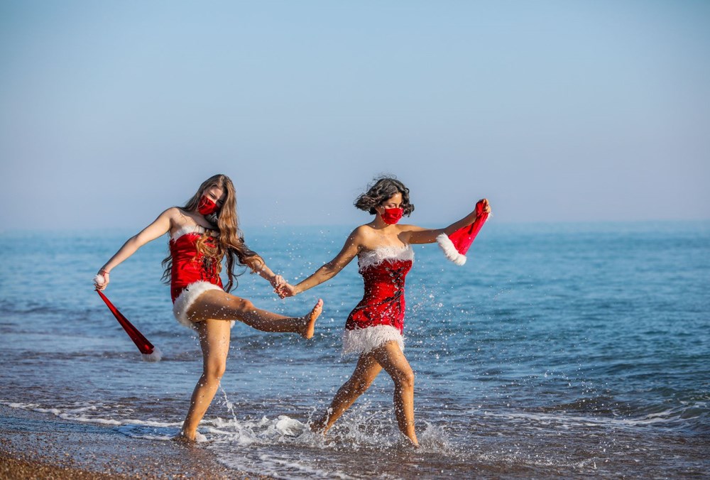 Yılbaşına sayılı gün kala bir araya gelen mankenler, kırmızı noel anne kostümü giyip maske takarak kamera önüne geçti. Çekimler, bu yıl kumsalda gerçekleşti.