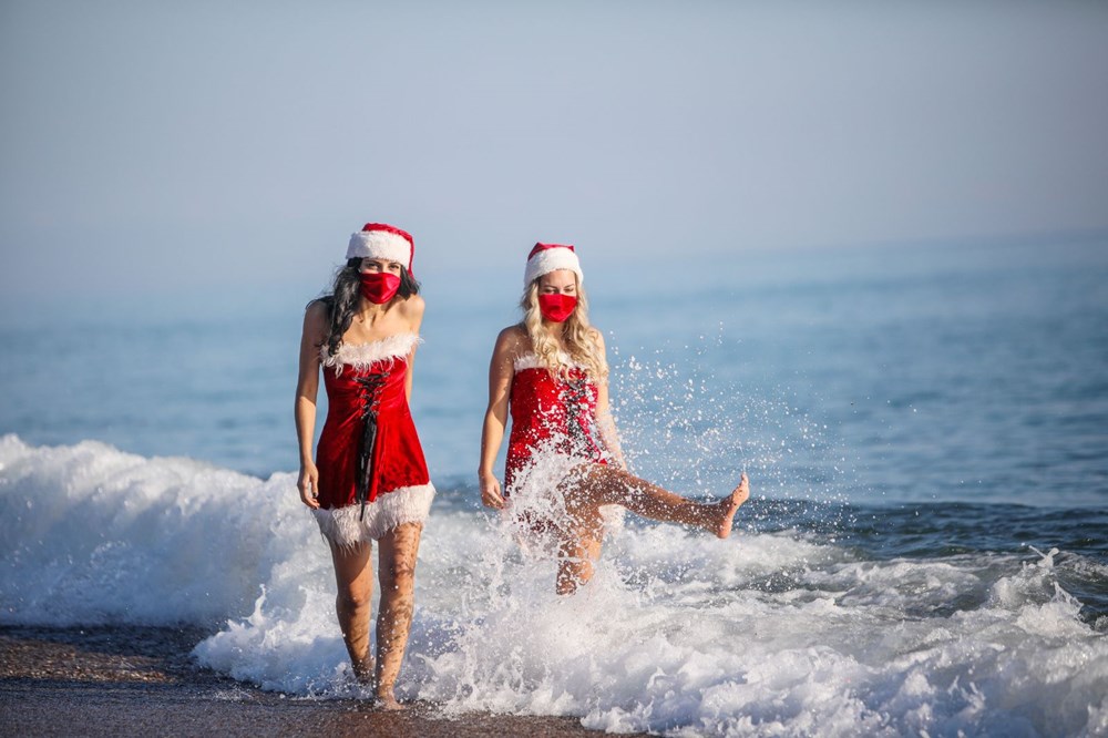 Oluşturdukları kalp şekli ve taktıkları kırmızı maskelerle dünyaya 'sağlık ve barış' mesajı veren noel anneler, denize girmeyi de ihmal etmedi.