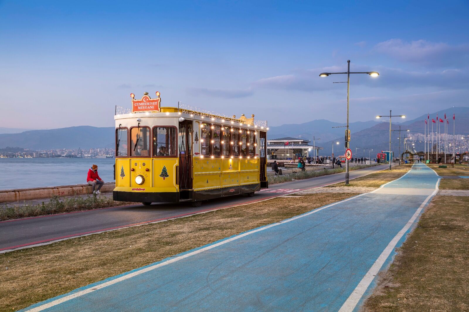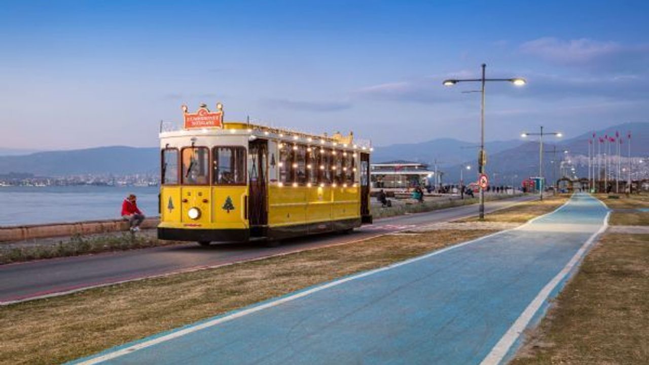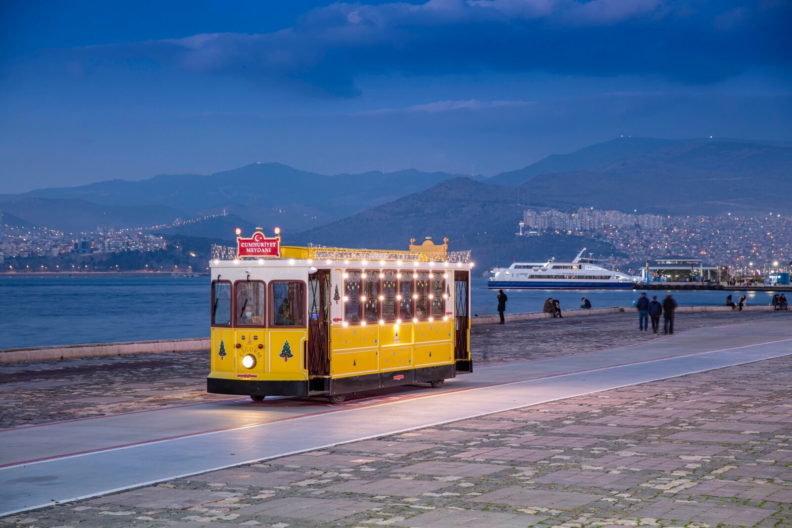 İzmir Büyükşehir Belediyesi’nin kente armağanı nostaljik tramvaylardan Çiğdem, yılbaşı öncesi led ışıklarla donatılarak süslendi. Birinci Kordon’a canlılık getiren araç yeni yıla dair umutları ve olumlu beklentileri de temsil ediyor.