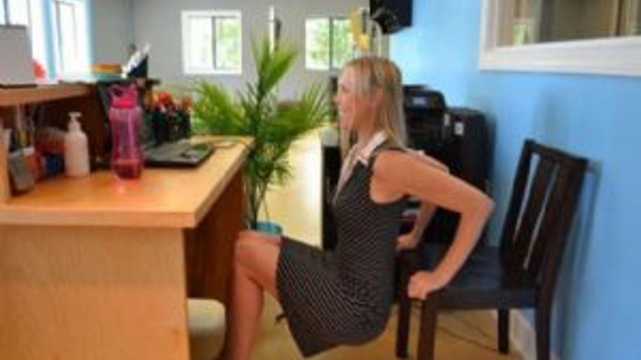5-İzometrik sandalye squatı: Kalçanızı sandalyeden yaklaşık 2,5 santim yukarı kaldırın ve 30-60 saniye arası öyle durun.