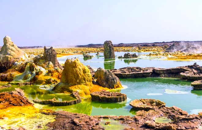 Hidrotermal bir arazi olan Etiyopya Dallol'da ölçülen ortalama hava sıcaklığı 40 derecenin altına hiç düşmüyor.