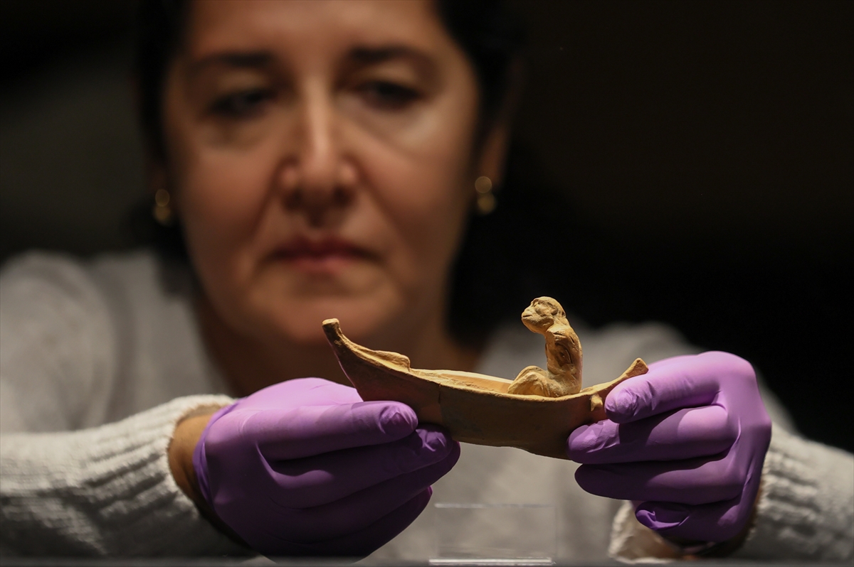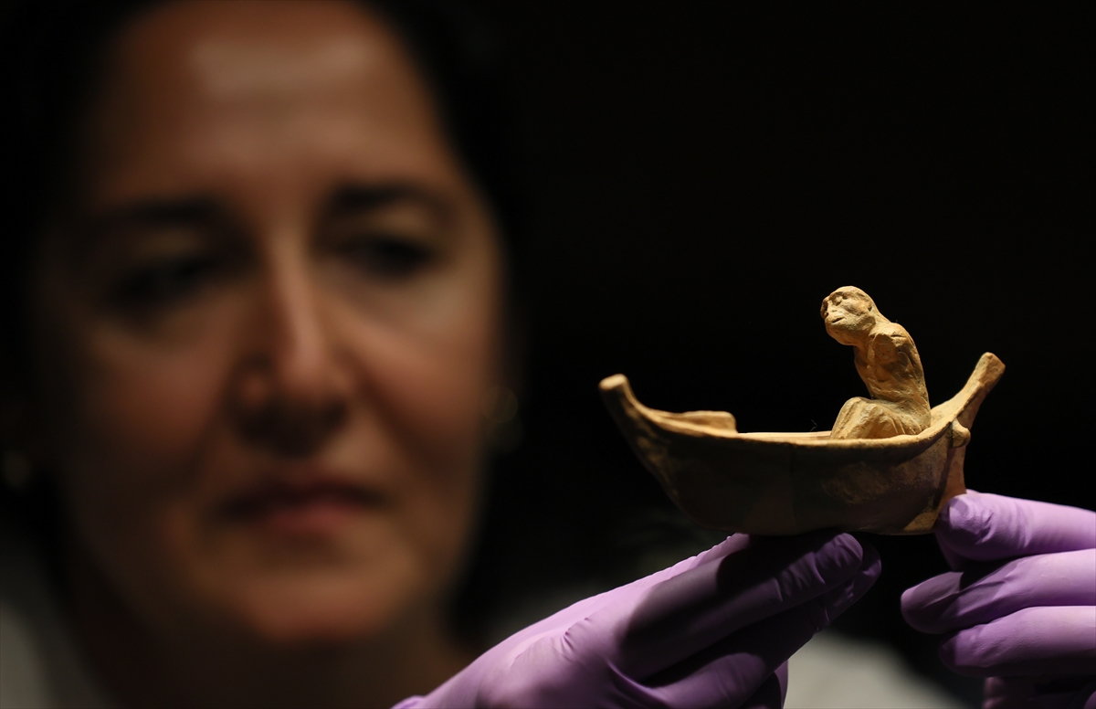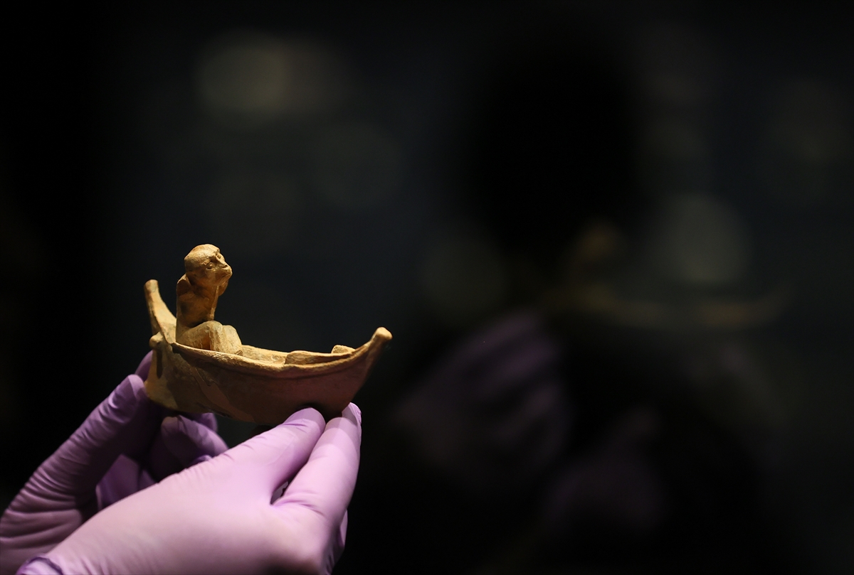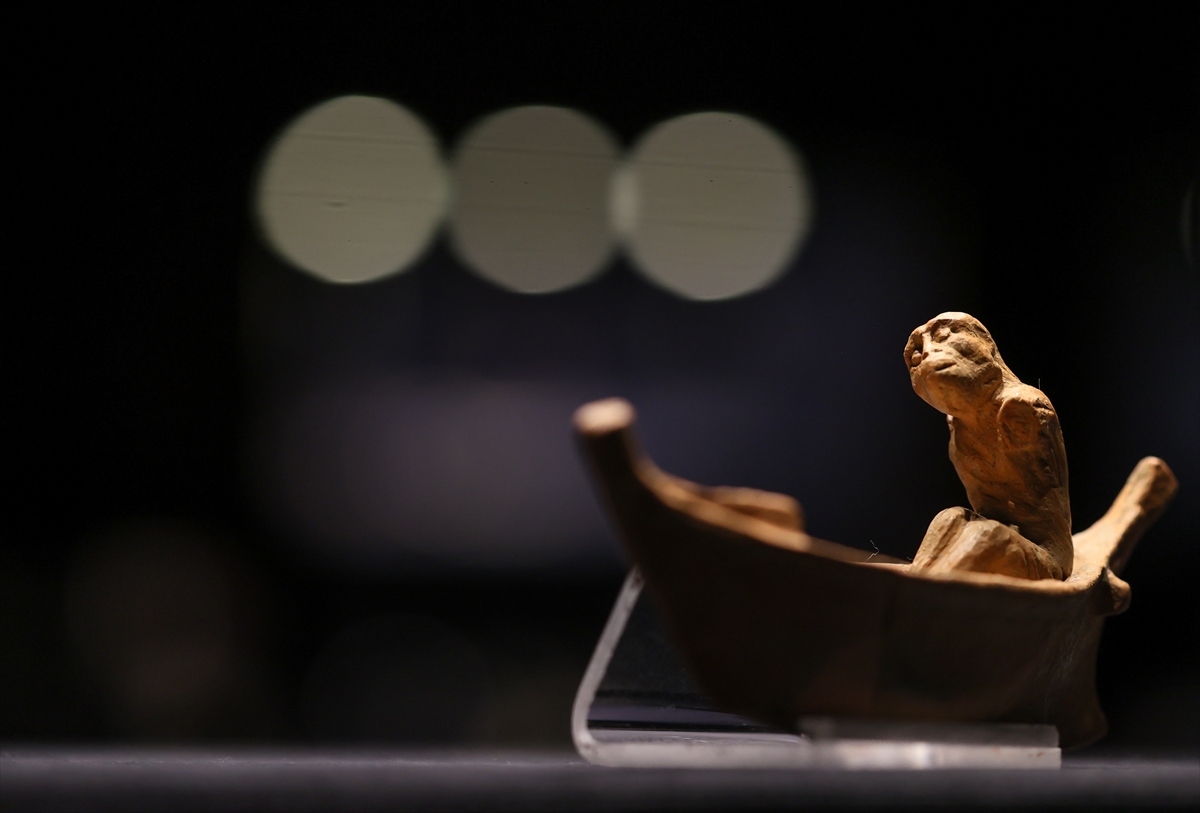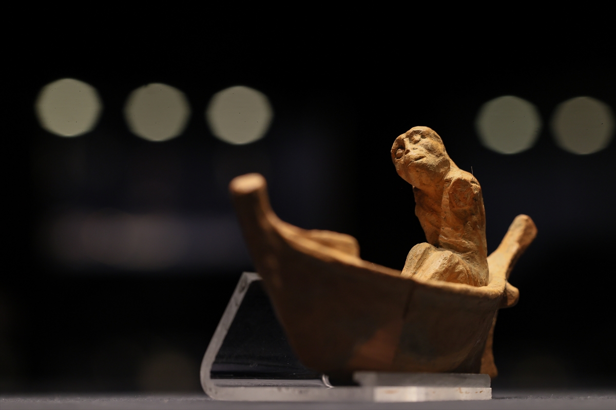 Urla'daki Klazomenai Antik Kenti kazısından 2014 yılında çıkarılan sandal ve içindeki kayıkçının pişmiş topraktan heykelciği de serginin parçaları arasında yer aldı.
