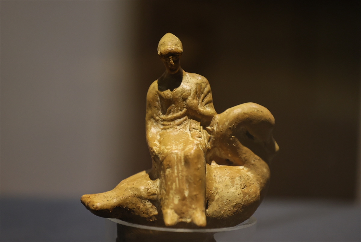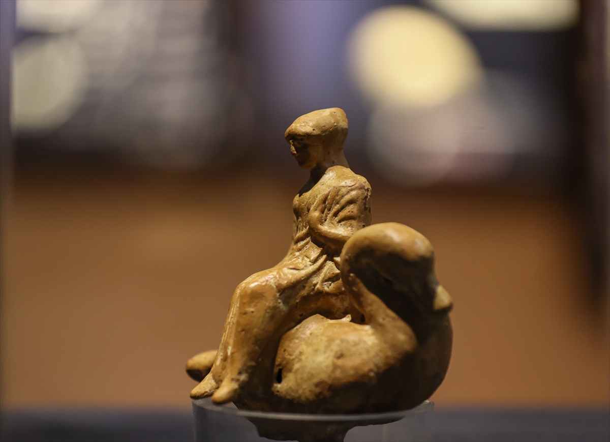 Aliağa ilçesindeki Kyme Antik Kenti'ndeki mezar kazılarından çıkarılan Helenistik Dönem'den kalma bir kuğunun taşıdığı Sparta kraliçesi Leda'nın heykelciği de serginin eserleri arasında bulunuyor.
