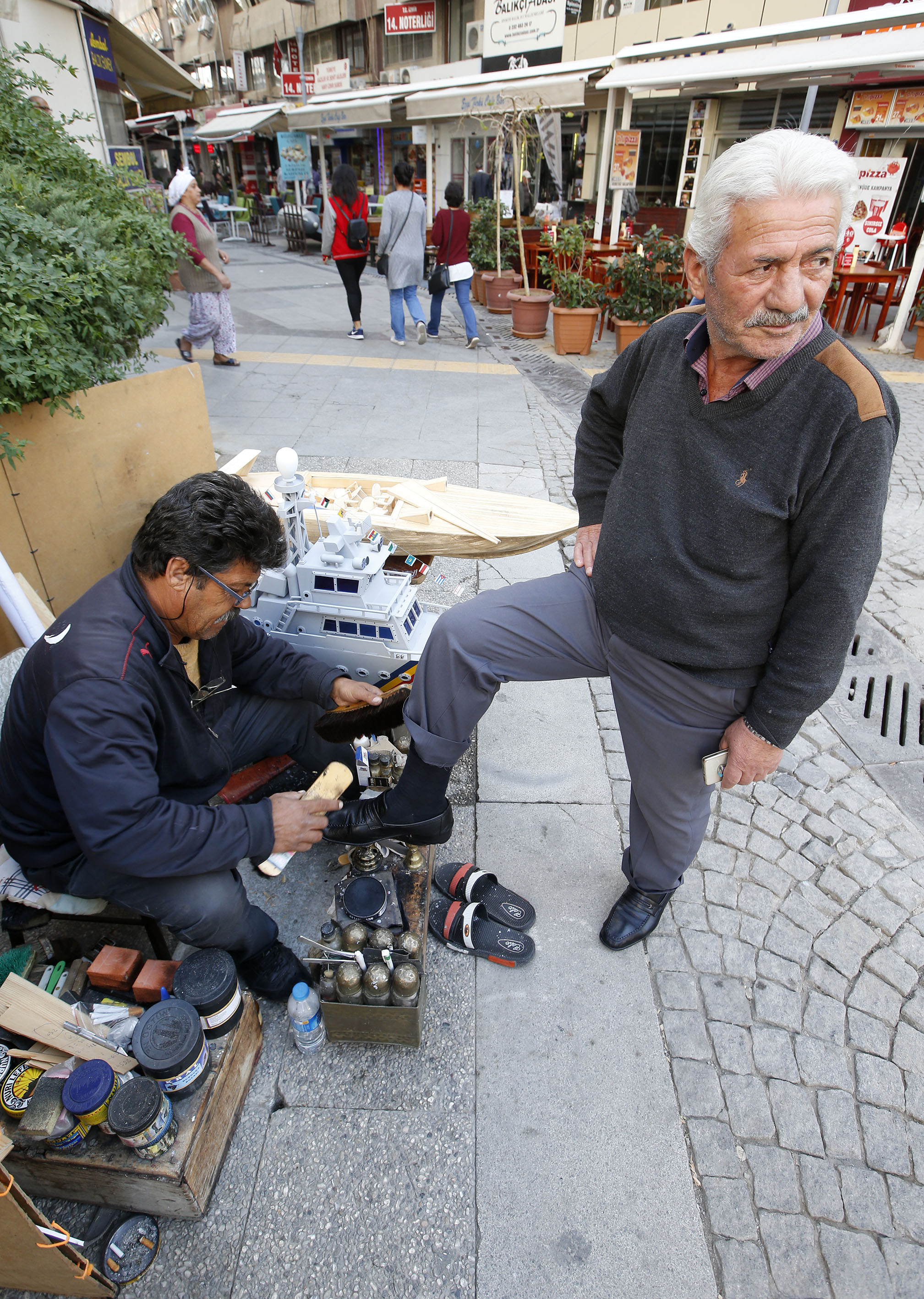 Geçimini 35 yıldır ayakkabı boyayarak sağlayan Ümit Sarımsı'nın Konak Meydanı'nda müşteri beklerken yaptığı maket tekneler, görenlerin ilgisini çekiyor.