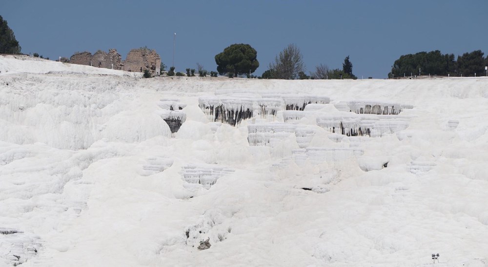 UNESCO Dünya Kültür Mirası Listesi'nde yer alan ve 19 Mart'tan bu yana corona virüs tedbirleri kapsamında ziyaretçi alınmayan Pamukkale, uzun süredir kapalı kalması nedeniyle bembeyaz olan görüntüsüyle dikkat çekiyor.