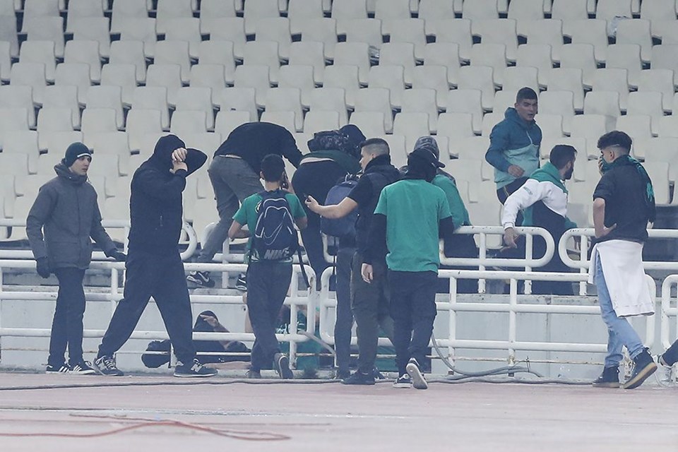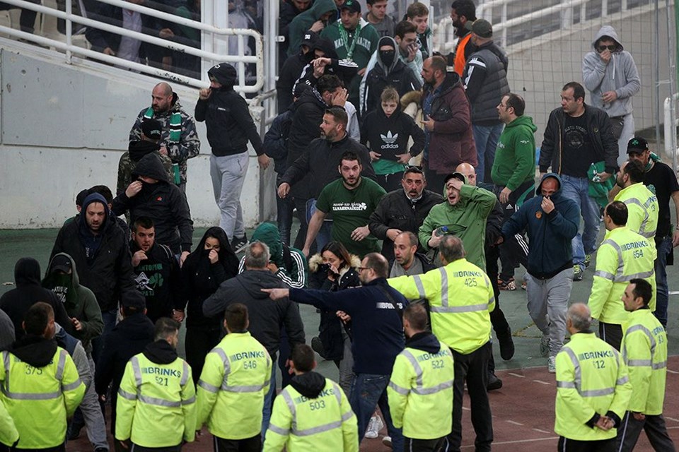 Stat ve çevresinde çıkan olaylar nedeniyle sahada görevli Yunan polisi göz yaşartıcı gaz kullandı. Olaylar sırasında bazı taraftarların sahaya girmesinin ardından oyuncuları soyunma odasına yollayan maçın Alman hakemi Marco Fritz maçı tatil etti.