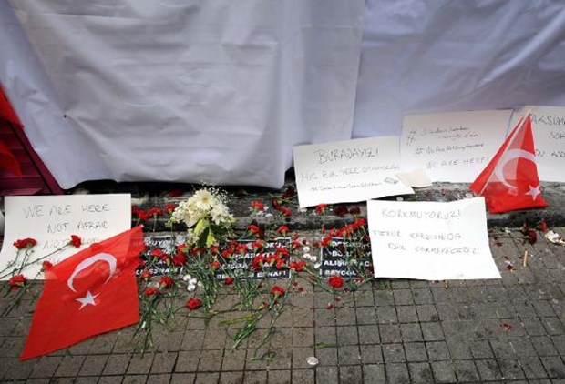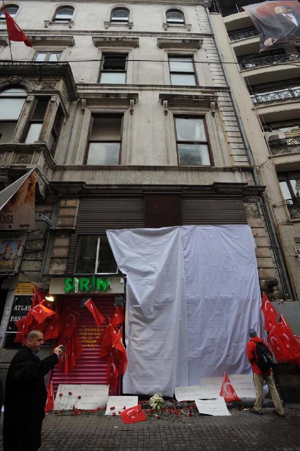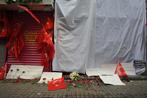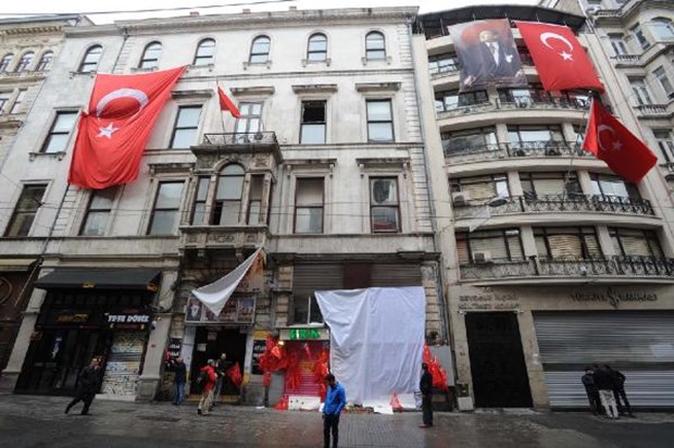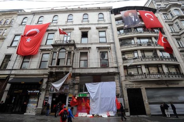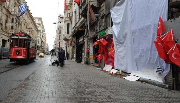 İstanbul Beyoğlu'da bulunan İstiklal Caddesi'nde dün canlı bomba saldırısının gerçekleştiği yere Türk bayrakları asıldı.