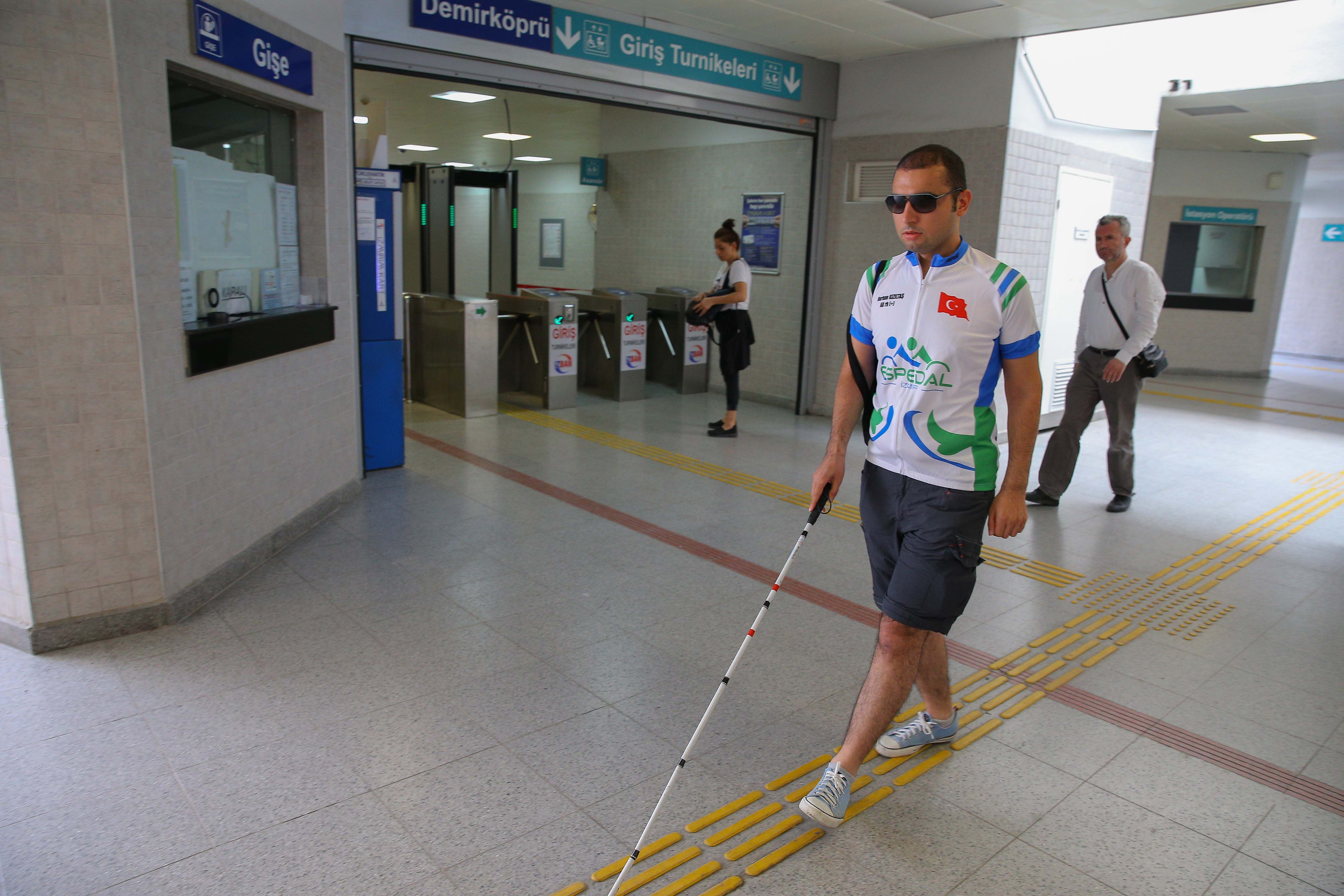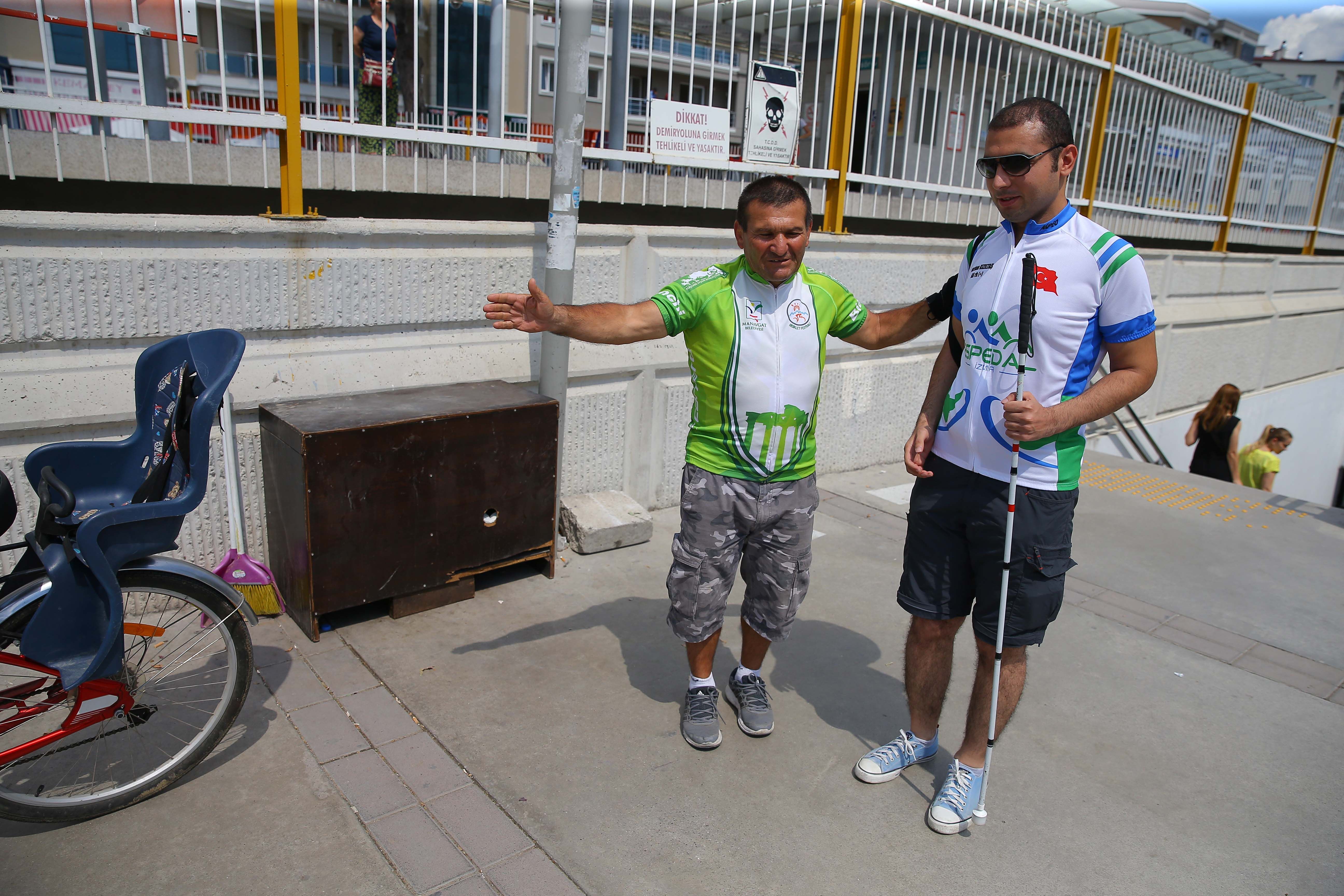Derneğe ulaşan görme engelli öğretmen Burhan Kızıltaş, İZBAN ile bisiklete bineceği buluşma noktasına geldi.