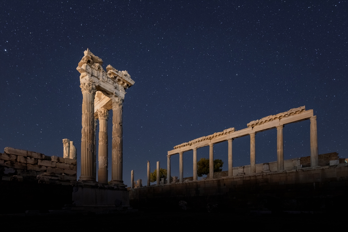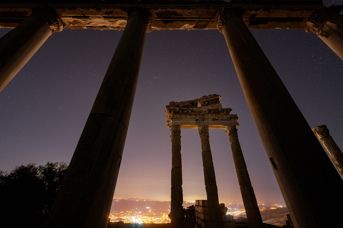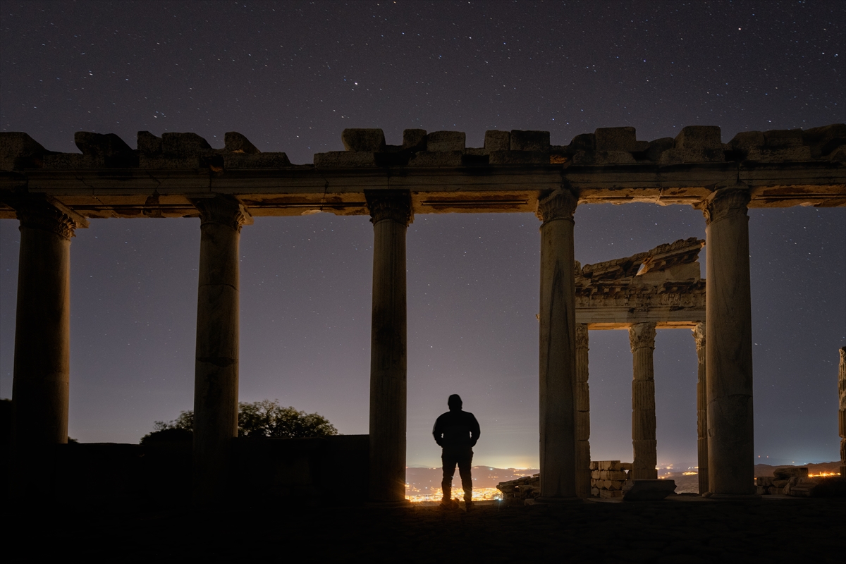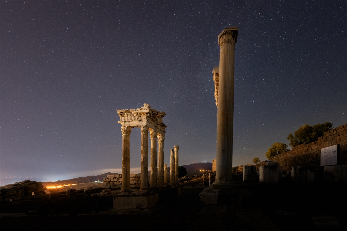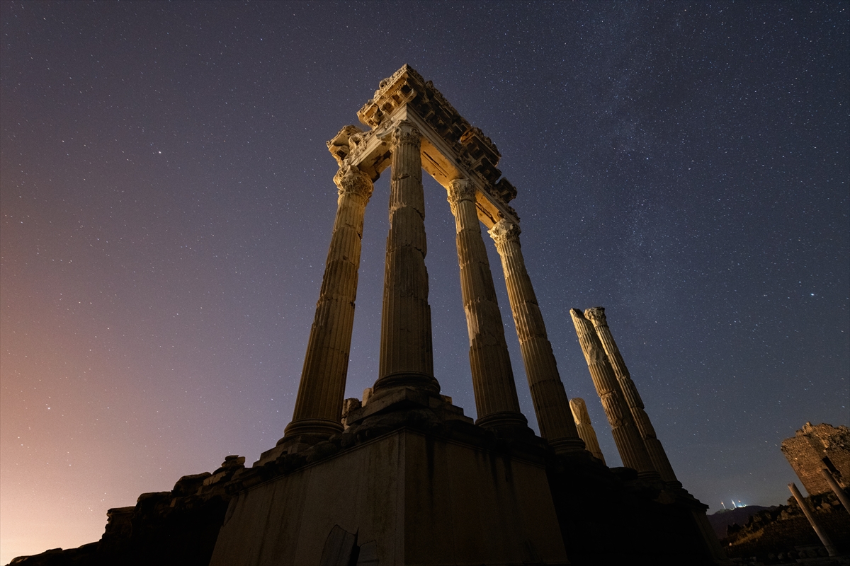 İzmir’in Bergama ilçesinde yer alan ve UNESCO Dünya Mirası Listesi’nde bulunan Pergamon Antik Kenti'ndeki yapılar ve yıldızlar, uzun pozlama tekniğiyle görüntülendi. Tarihi yapılar, yıldızlarla birlikte güzel görüntü oluşturdu.