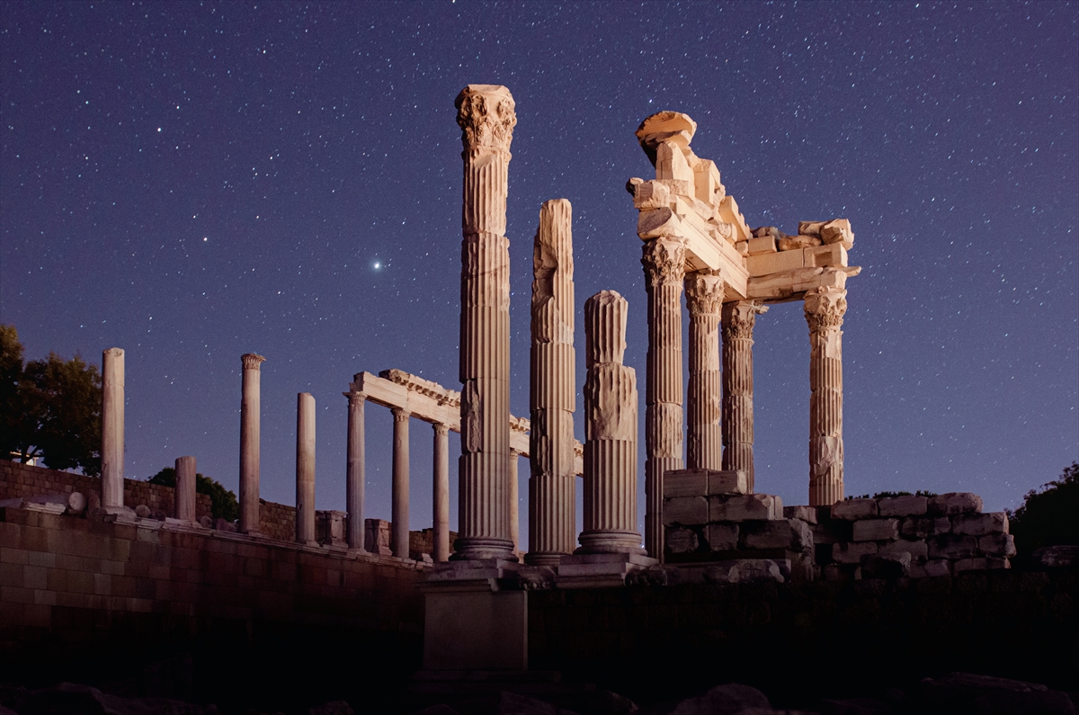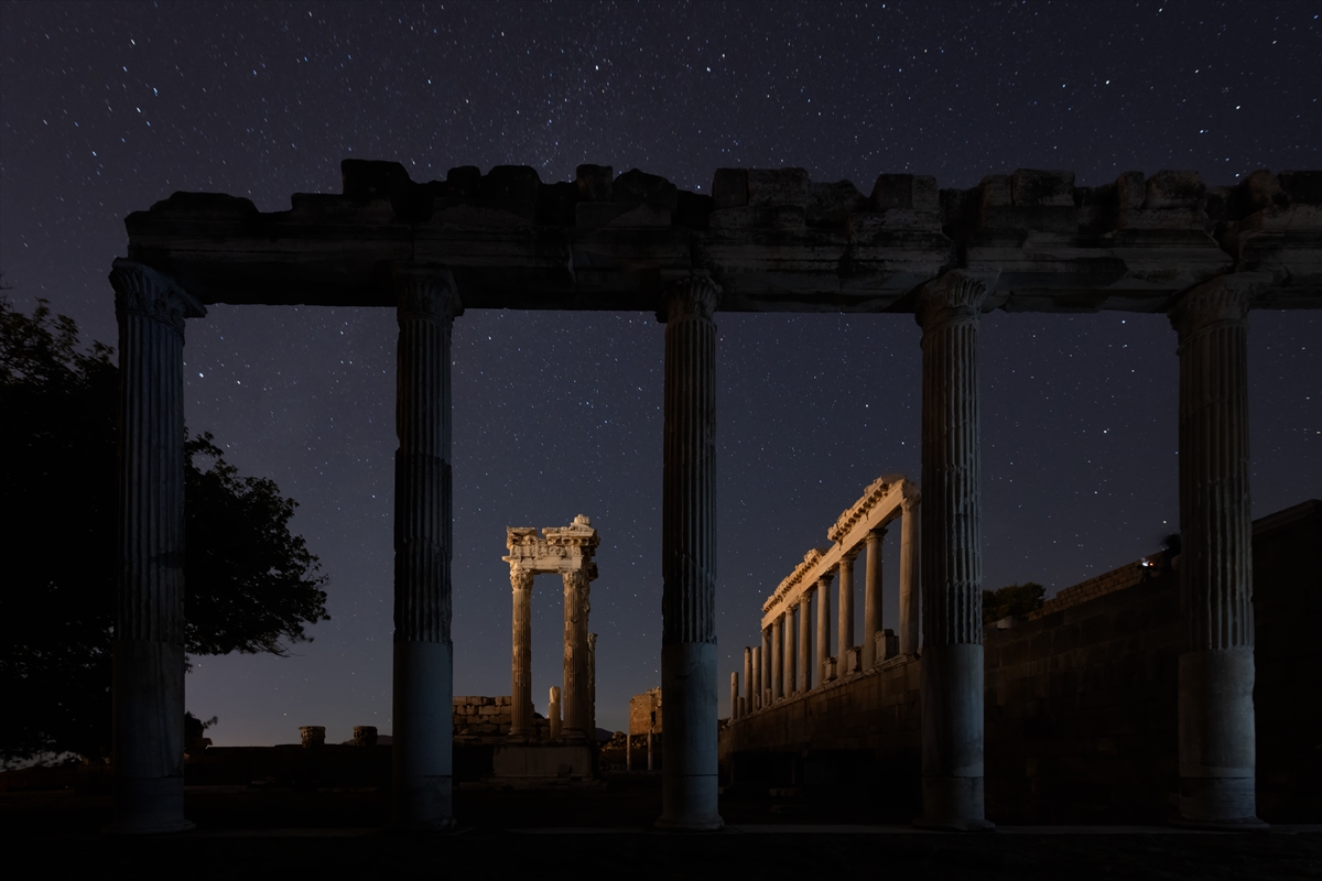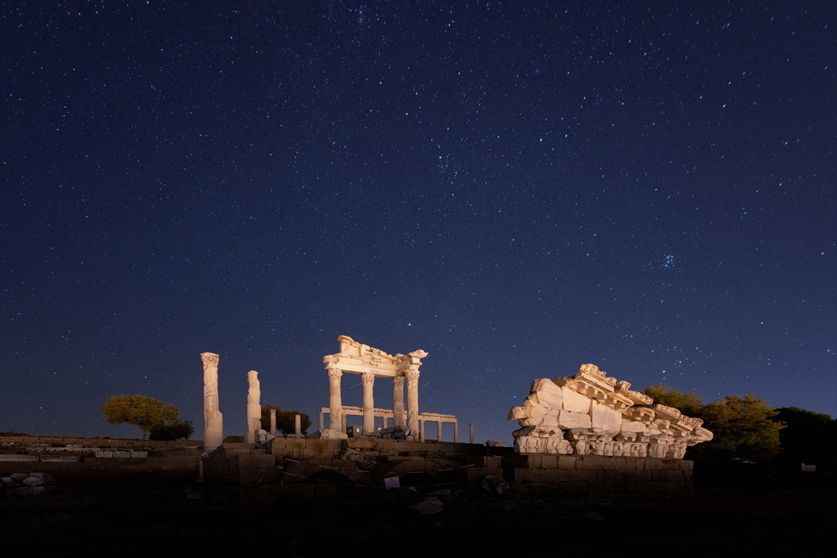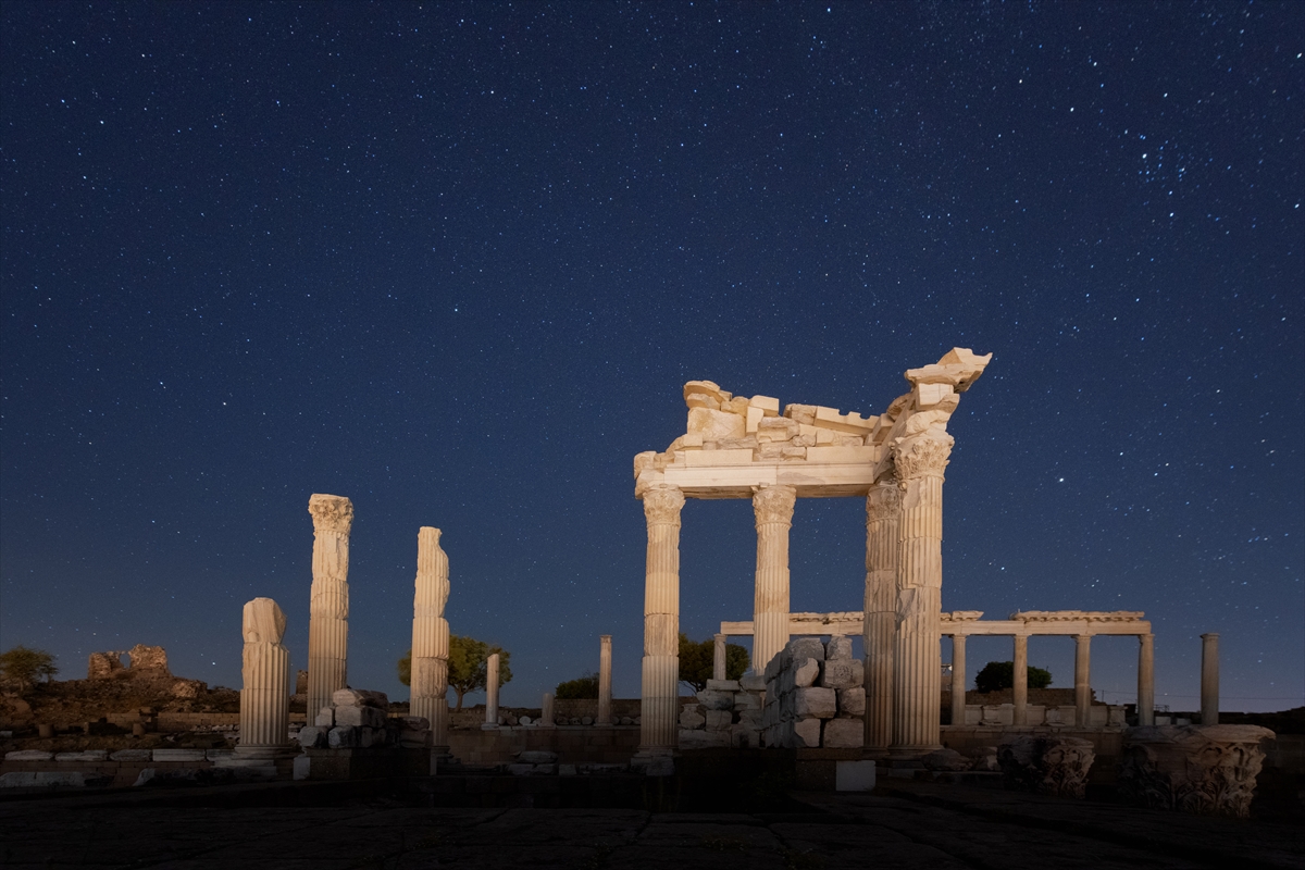 İzmir’in Bergama ilçesinde yer alan ve UNESCO Dünya Mirası Listesi’nde bulunan Pergamon Antik Kenti'ndeki yapılar ve yıldızlar, uzun pozlama tekniğiyle görüntülendi. Tarihi yapılar, yıldızlarla birlikte güzel görüntü oluşturdu.