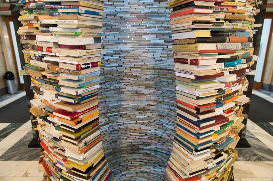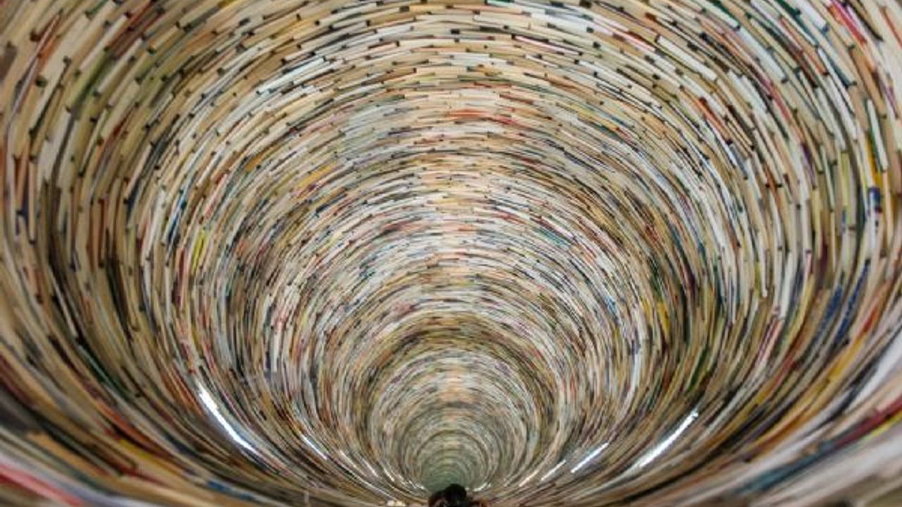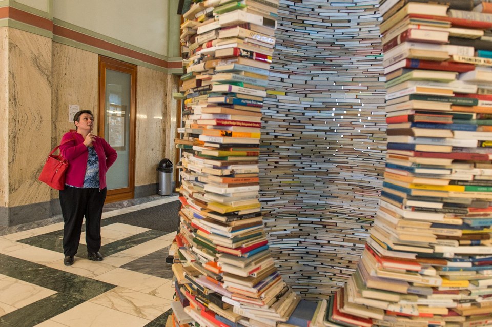 Kule yüzlerce kitabın üst üste dizilmesi ile oluşturulmuş.