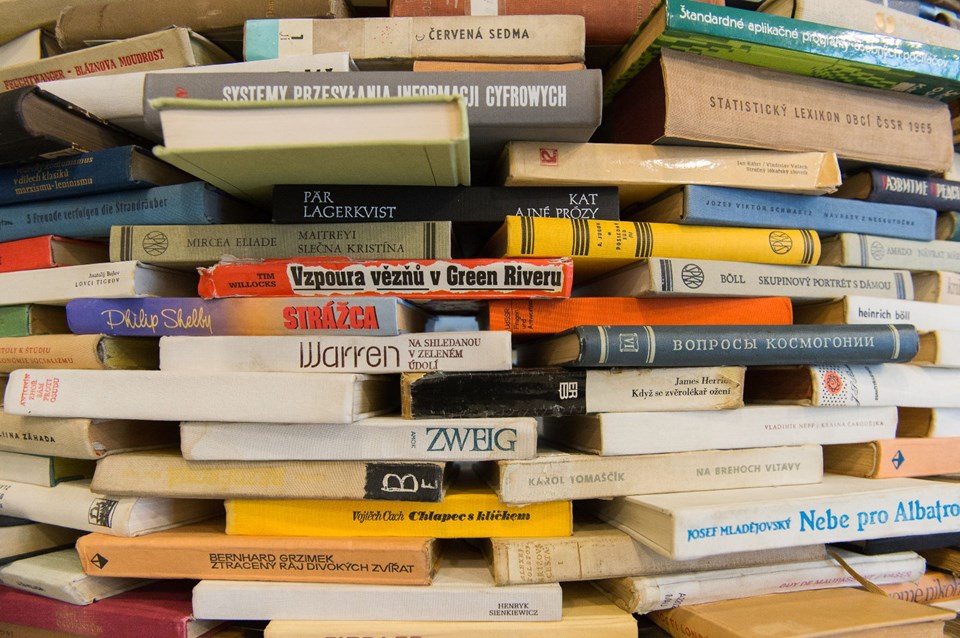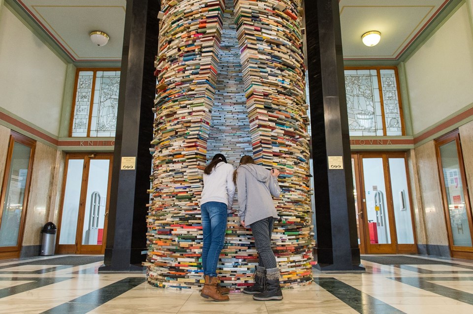 Çekya'nın başkenti Prag'daki Belediye Kütüphanesi'nde Slovak asıllı sanatçı Matej Kren'in "Idiom" isimli kitap kulesi tasarımı ziyaretçiler tarafından ilgi görüyor.