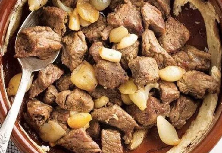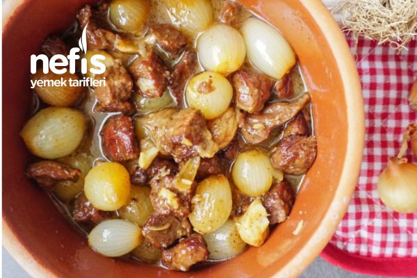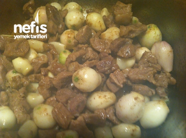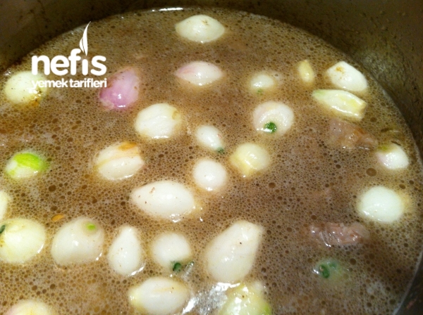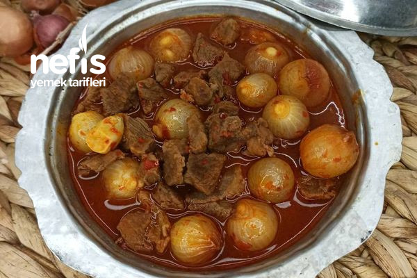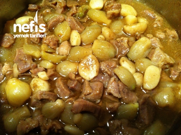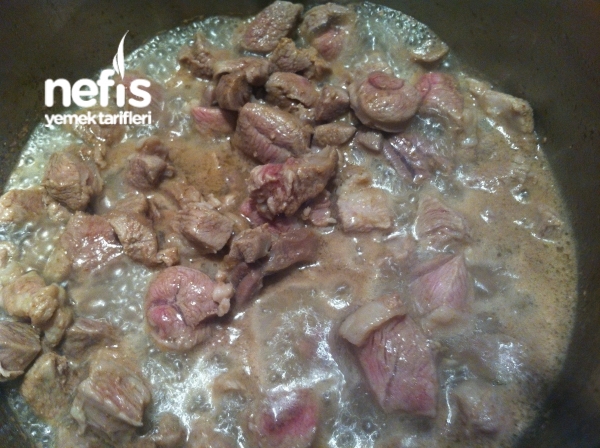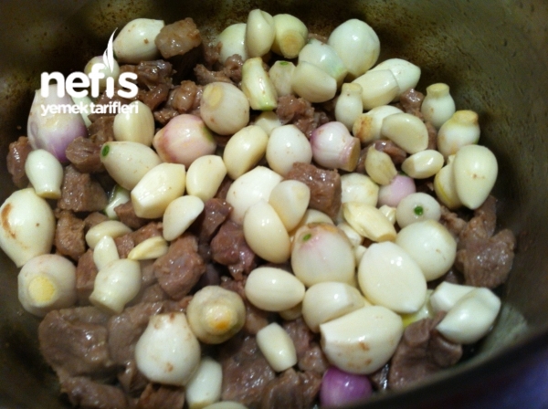 Not : Yemek dana eti ile de olur ama koyun -kuzu eti ile daha lezzetli olur. Dana eti daha geç pişecektir. Yemeğin suyunu ona göre ekleyin. Yemek tencere de pişecekse kontrol sizde etlerin, yemeğin kıvamını siz ayarlayacaksınız. Tencere de pişirecekseniz yemeği pişerken gelip gidip karıştırmayın soğanı sarımsağı ezersiniz dağıtırsınız tencereyi elinize alıp sallaya sallaya ,sağa sola eğerek yemeğin pişmesini kontrol edebilirsiniz… Bizim yemeğimiz etlerimiz soğanlarımız güzelce pişti….hatta çok bile pişti denilebilir buna rağmen dağılmadı parçalanmadı…Yemek cıbıl cıbıl sulu olmamalı yemeğin suyu kararında olmalı. Resimlerden pişen yemeğin tencerede kalan suyunu görebilirsiniz. Lütfen ! Yemek ocakta pişerken yemeğe biraz daha su eklemeniz gerekirse kaynar su ekleyin..pişen yemeğe soğuk su eklenmez…..
