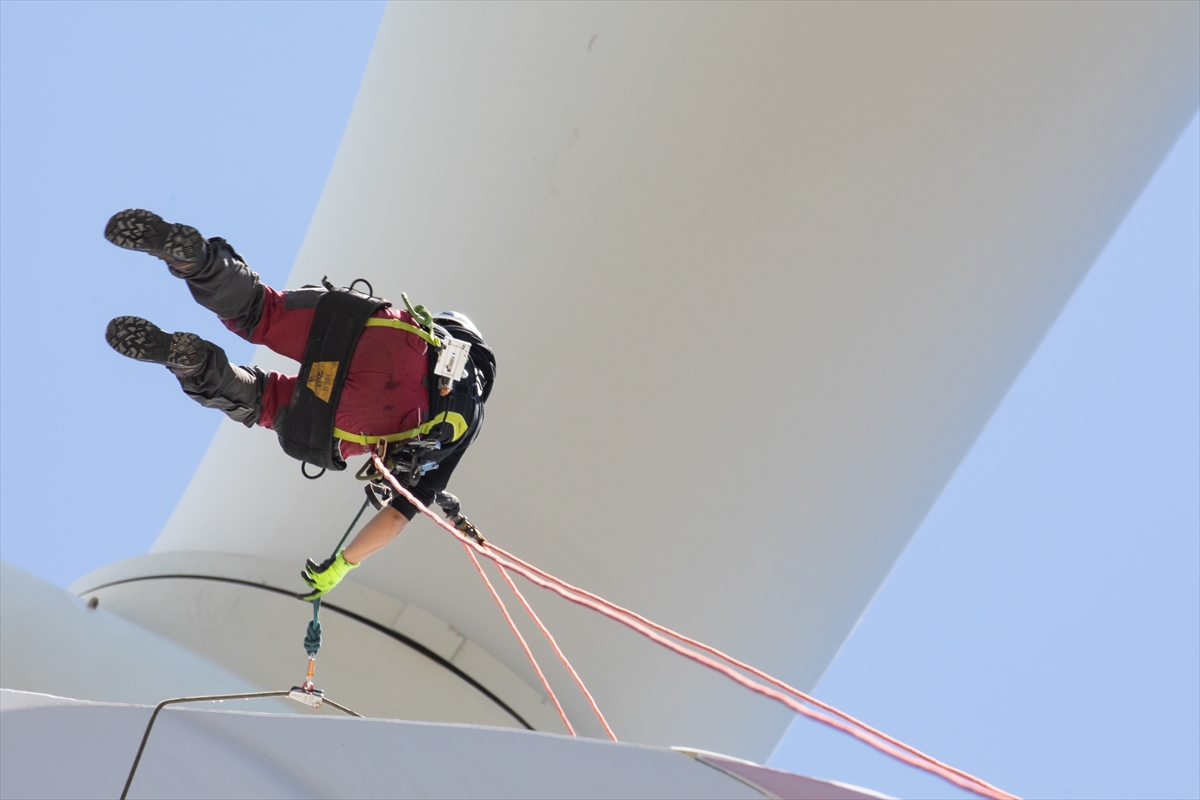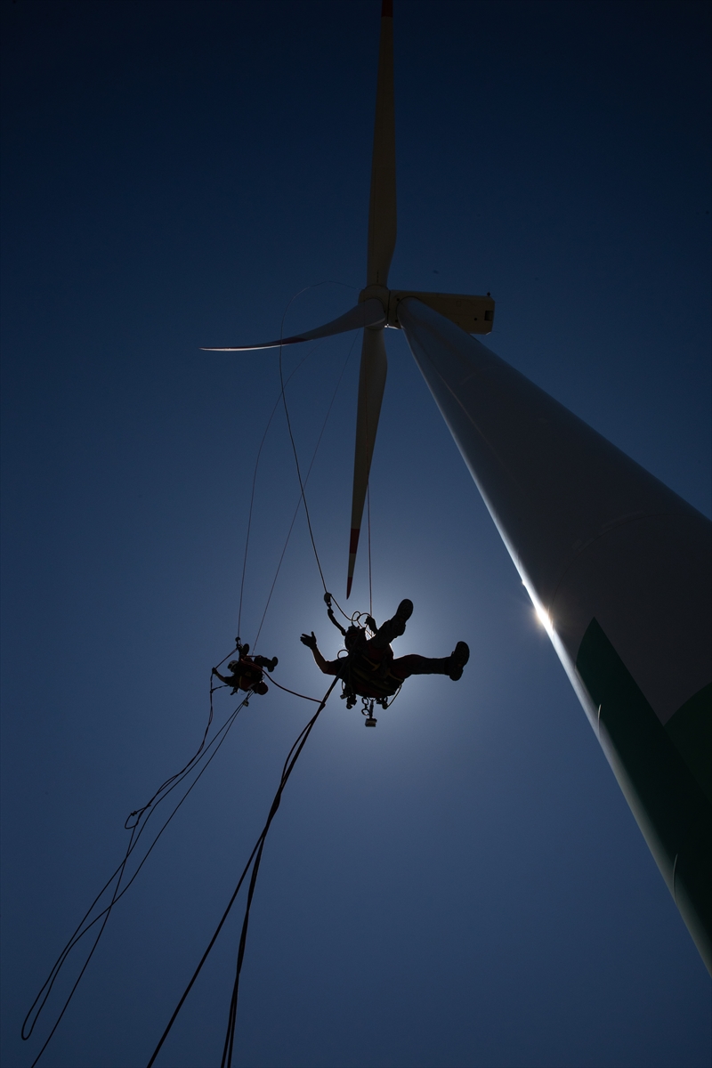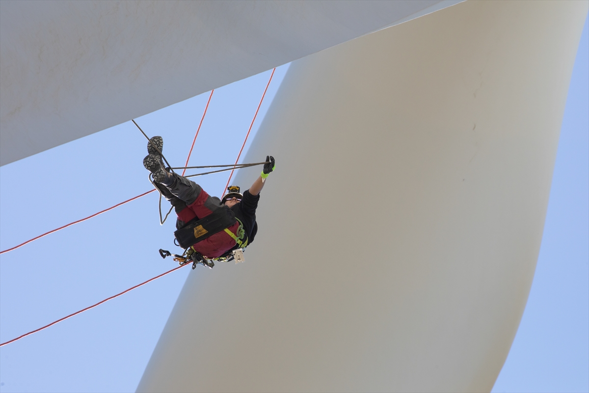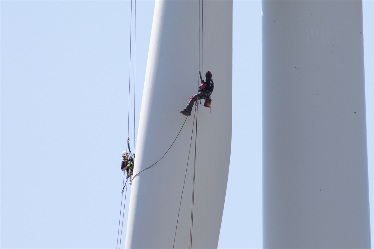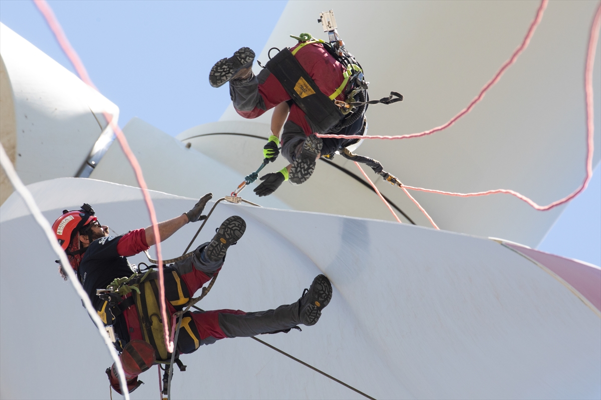 "Türbin içindeki asansör yardımıyla yukarıya çıkıyoruz. Asansör arızalı ise türbindeki merdivenden tırmanıyoruz. Vinç yardımı ile ekipmanları türbinin kule üstündeki kısımlarından biri olan nacelleye (makine bölümü) çıkartıyoruz. Kanat uygun pozisyona geldiğinde türbin içindeki kilit sistemini kullanarak türbini istediğimiz pozisyonda sabitliyoruz. Sonra ipleri nacelle içindeki istasyon noktasına sabitleyerek kanattan aşağı atıyoruz. Naccellenin üstünden iniş noktasına ulaşmak için güvenlik amacıyla yerdeki noktalara bağlanarak yürüyoruz. İplere vardığımızda aşağı inmek için hazırlığımızı tamamlıyoruz ve işe koyuluyoruz."