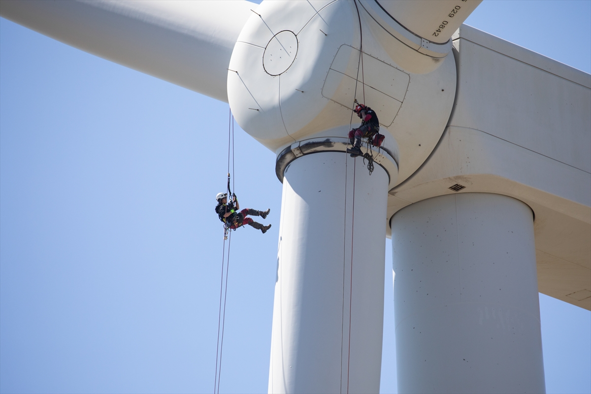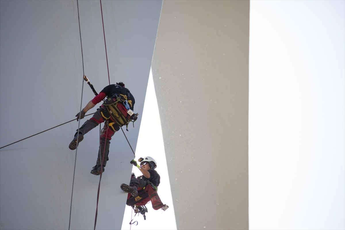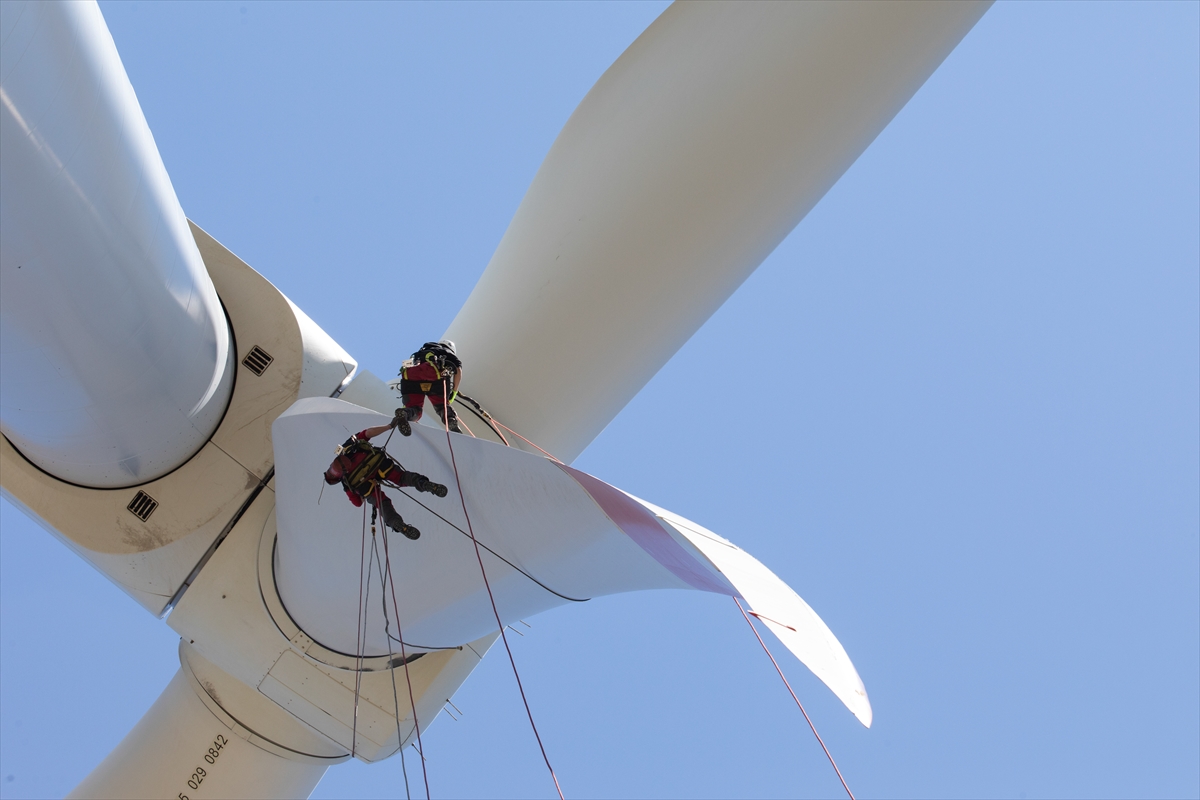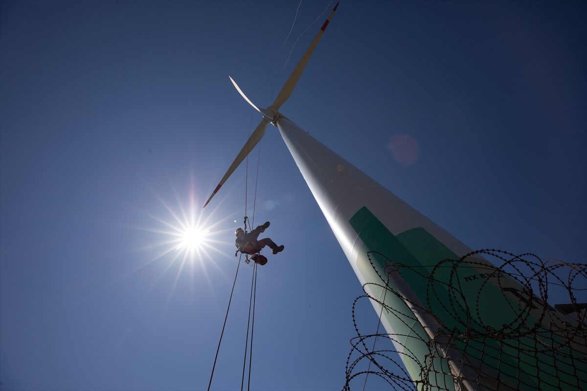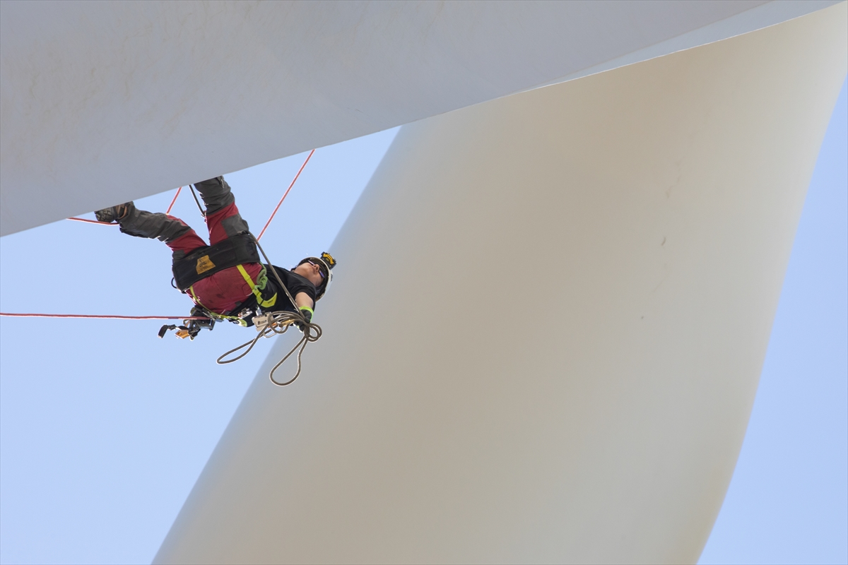"Türbin içindeki asansör yardımıyla yukarıya çıkıyoruz. Asansör arızalı ise türbindeki merdivenden tırmanıyoruz. Vinç yardımı ile ekipmanları türbinin kule üstündeki kısımlarından biri olan nacelleye (makine bölümü) çıkartıyoruz. Kanat uygun pozisyona geldiğinde türbin içindeki kilit sistemini kullanarak türbini istediğimiz pozisyonda sabitliyoruz. Sonra ipleri nacelle içindeki istasyon noktasına sabitleyerek kanattan aşağı atıyoruz. Naccellenin üstünden iniş noktasına ulaşmak için güvenlik amacıyla yerdeki noktalara bağlanarak yürüyoruz. İplere vardığımızda aşağı inmek için hazırlığımızı tamamlıyoruz ve işe koyuluyoruz."