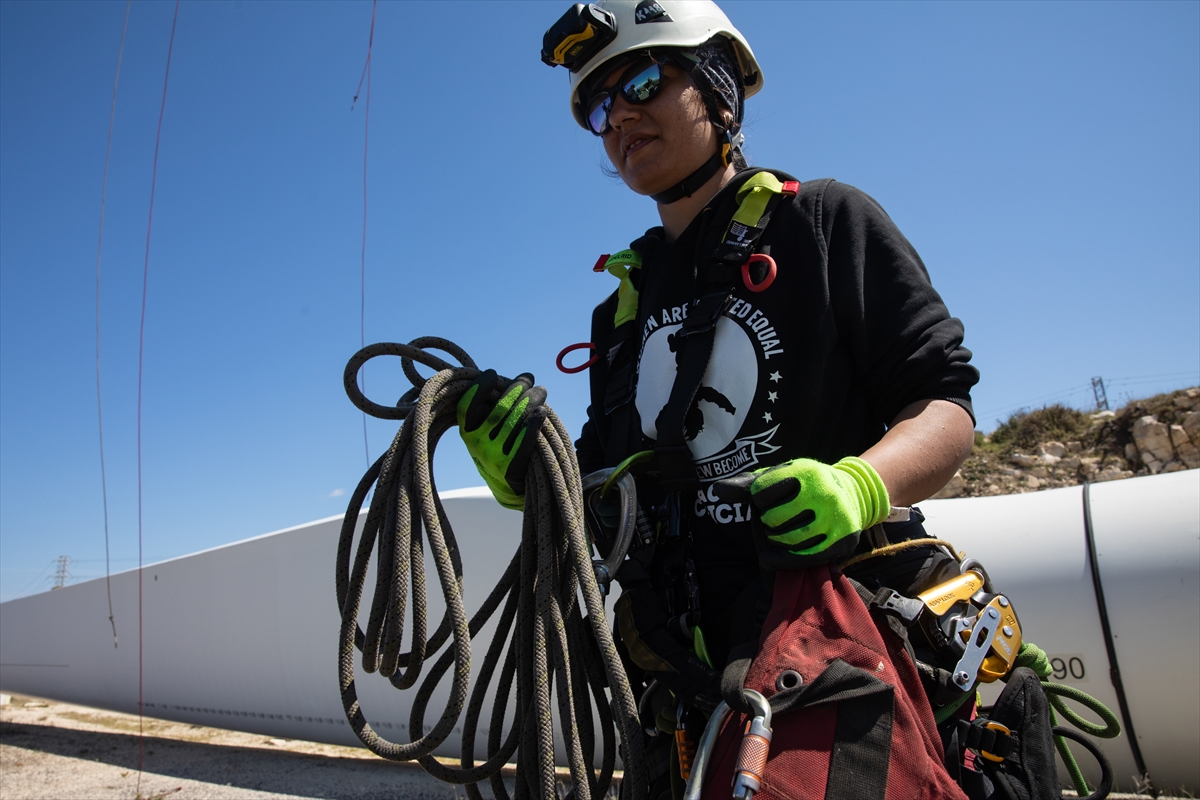 İzmir'de yaşayan adrenalin tutkunu Hazel Kaya, rüzgar türbini ve gökdelen gibi onlarca metre yükseklikteki yapılarda çalışmayı gerektiren mesleğini yükseklik korkusuna rağmen başarıyla yürütüyor.