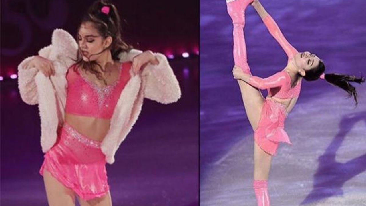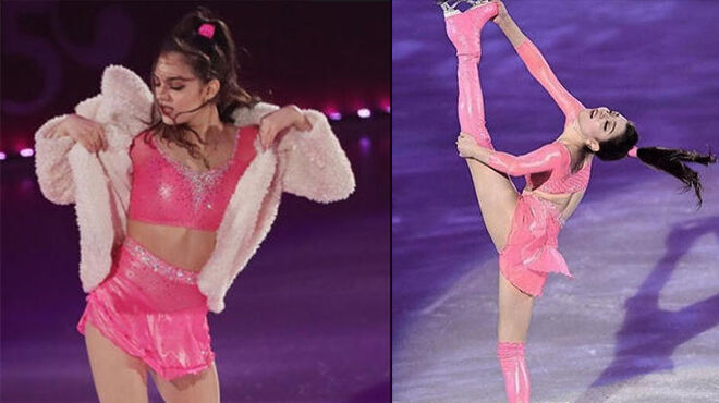 İki defa dünya şampiyonu olan Evgenia Medvedeva, Ariana Grande'nin 7 rings şarkısıyla sergilediği performansı sırasında kauçuktan üretilmiş pembe bir kıyafet tercih etti.