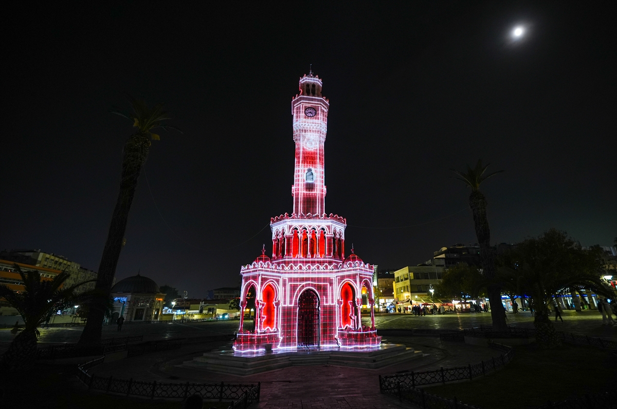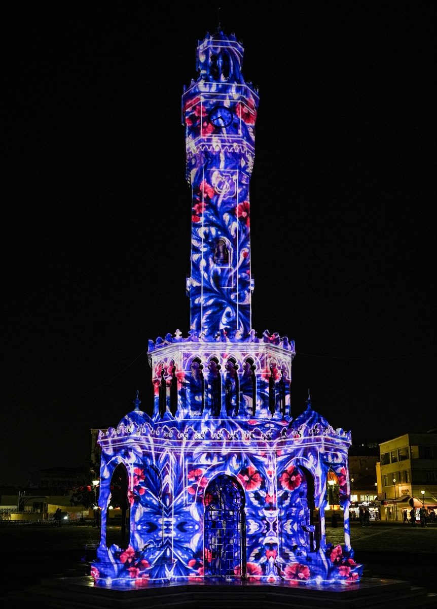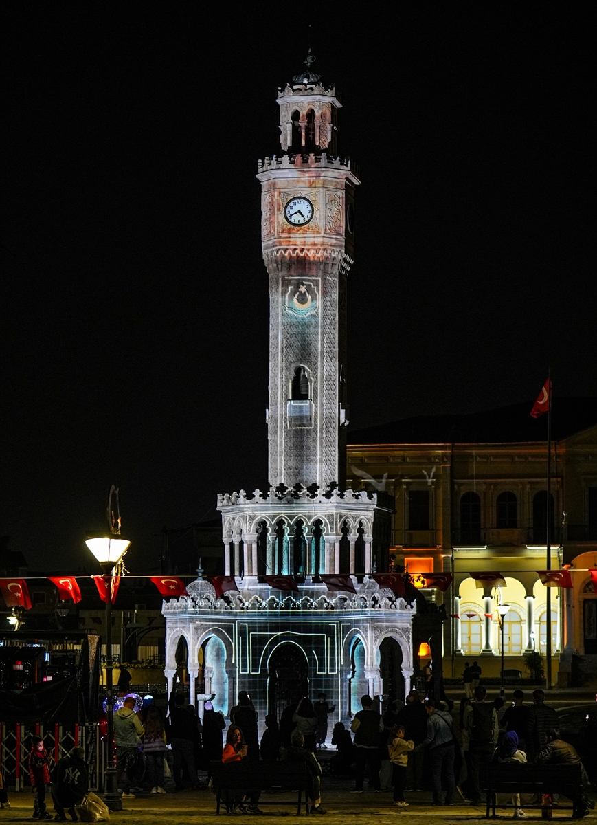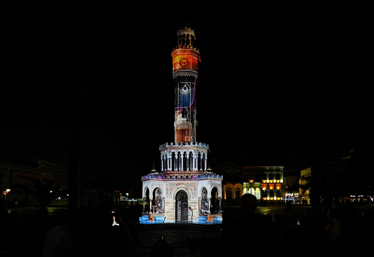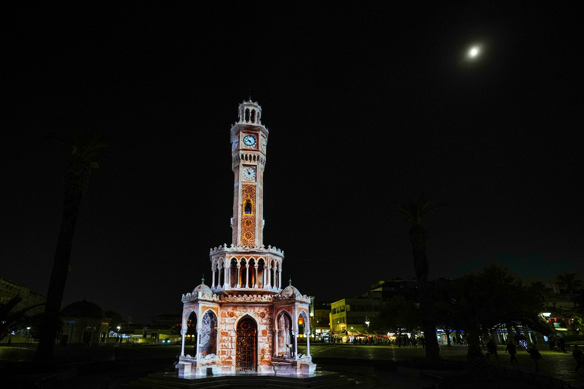 Konak Atatürk Meydanı'ndaki saat kulesine, zamanın akışını ve sonsuzluk temasını işleyen "Zamanın Hüneri" adlı dijital eser "mapping" tekniği kullanılarak yansıtıldı.
