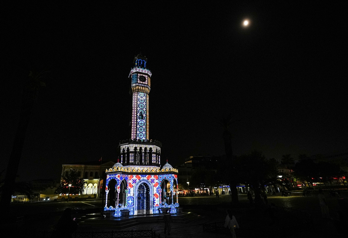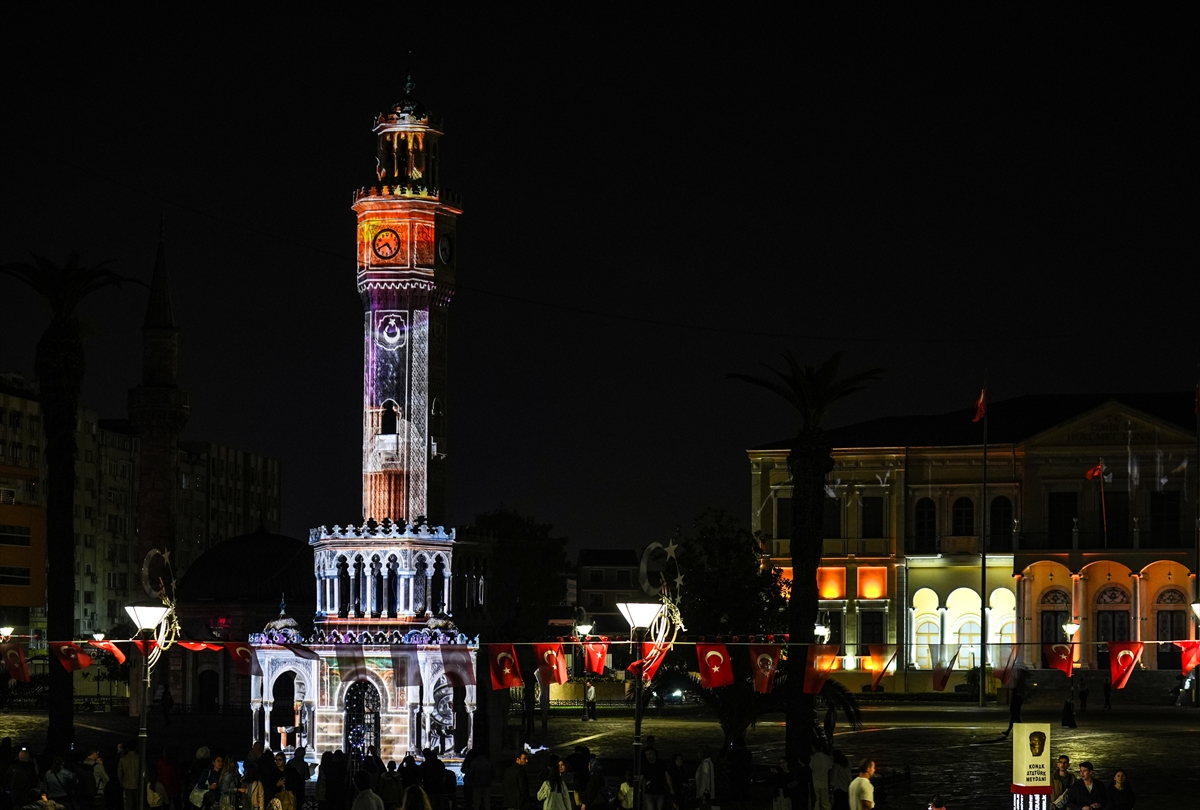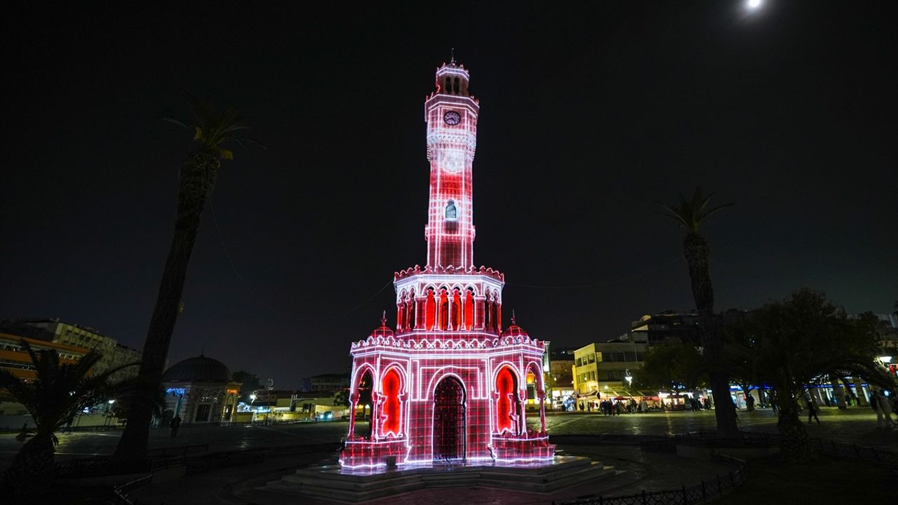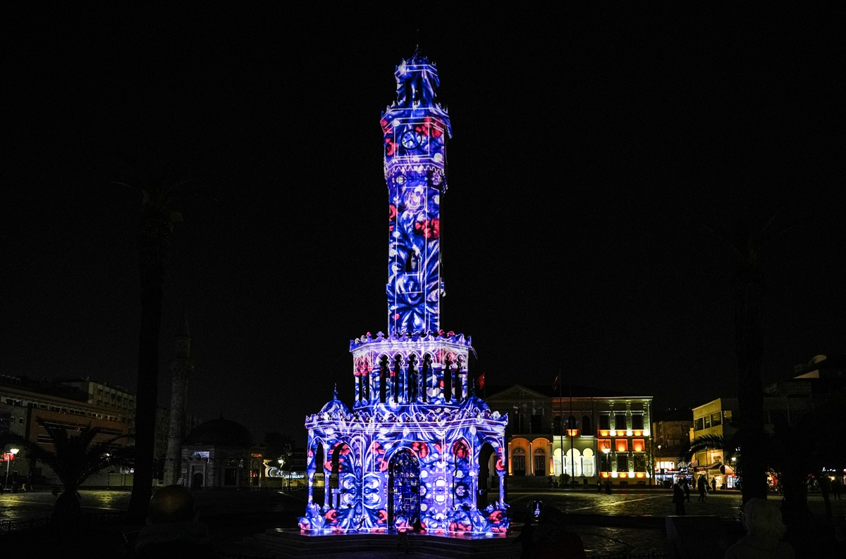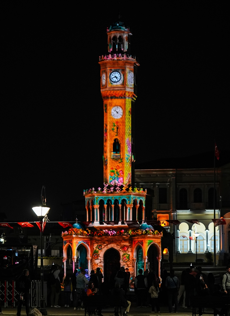 Konak Atatürk Meydanı'ndaki saat kulesine, zamanın akışını ve sonsuzluk temasını işleyen "Zamanın Hüneri" adlı dijital eser "mapping" tekniği kullanılarak yansıtıldı.