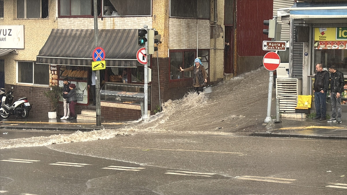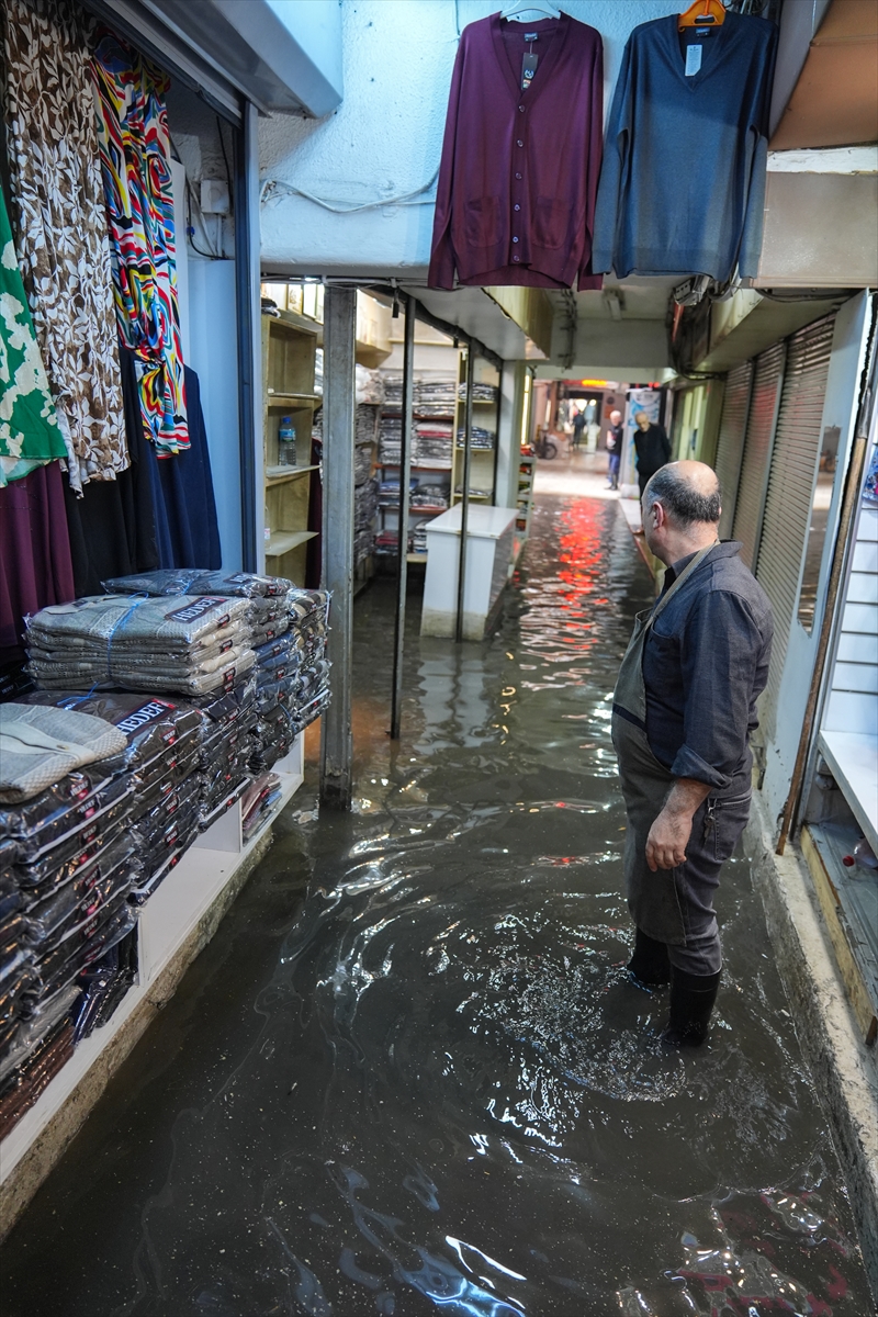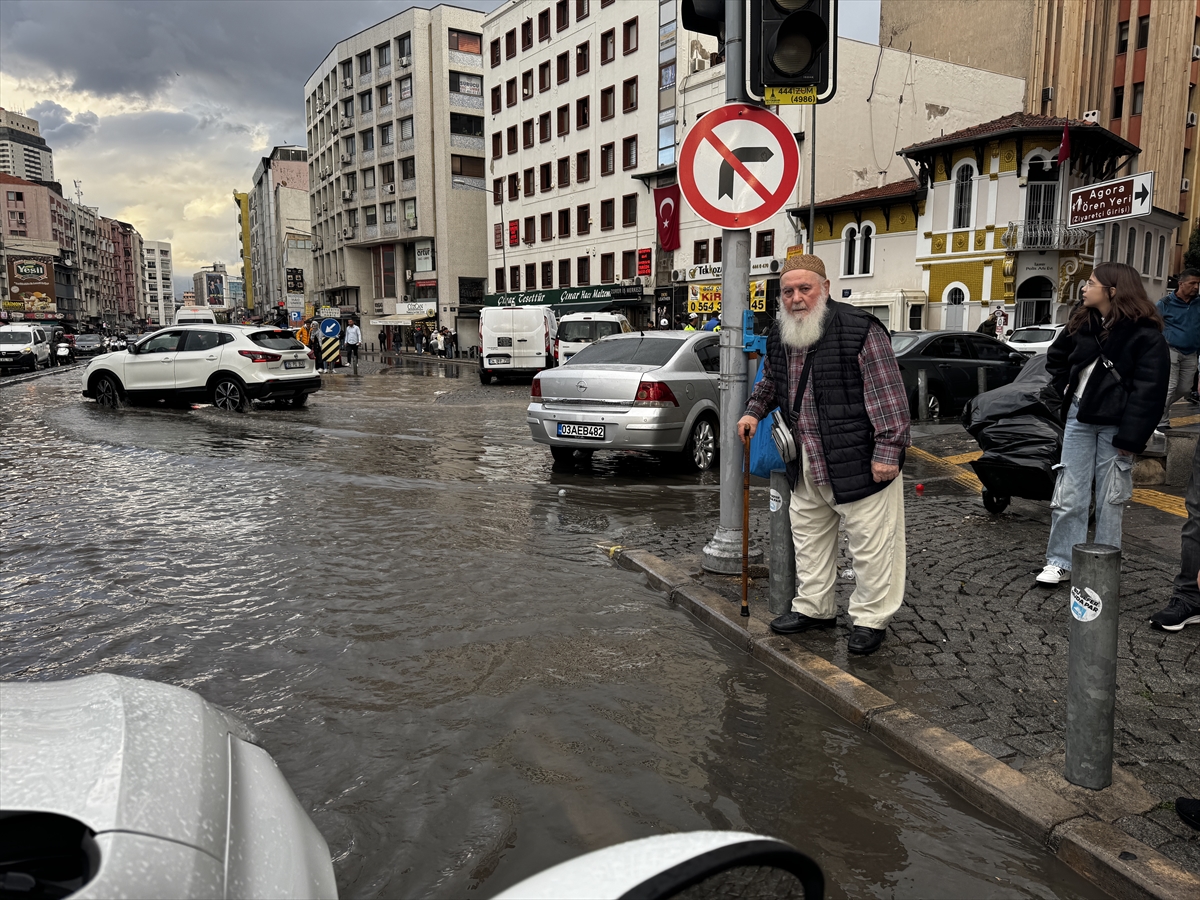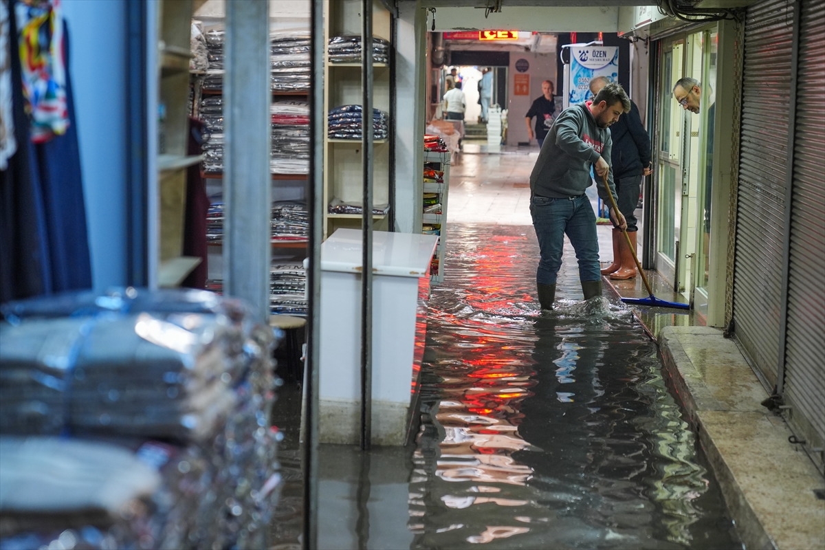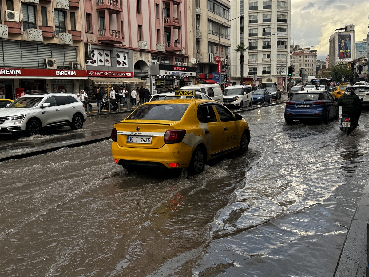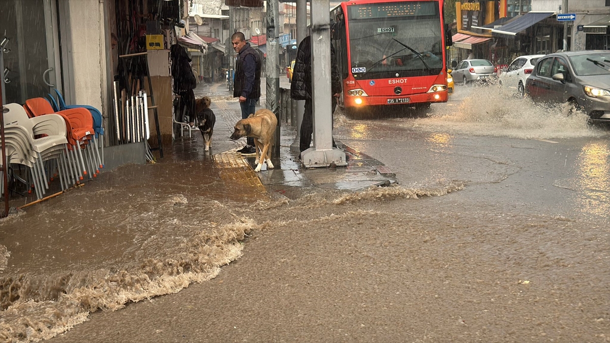 İzmir'de aralıklarla etkili olan kuvvetli sağanak nedeniyle bazı iş yerlerini su bastı, ulaşımda aksamalar yaşandı.