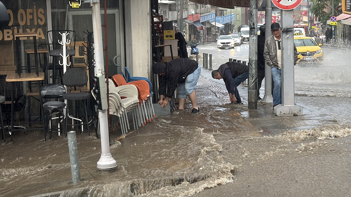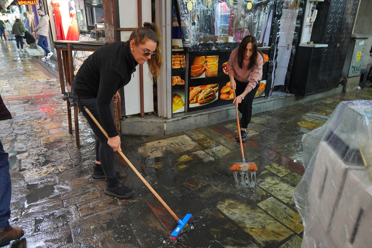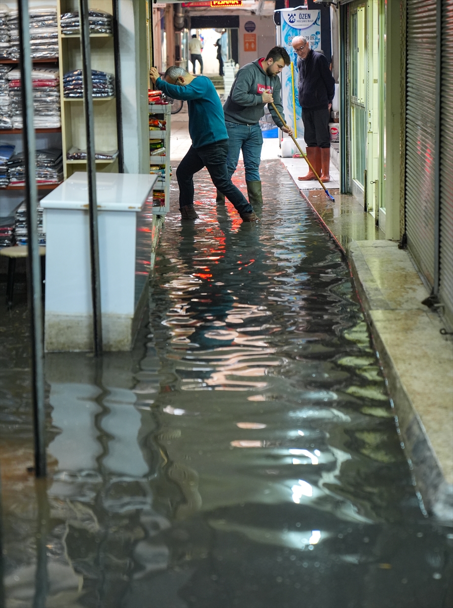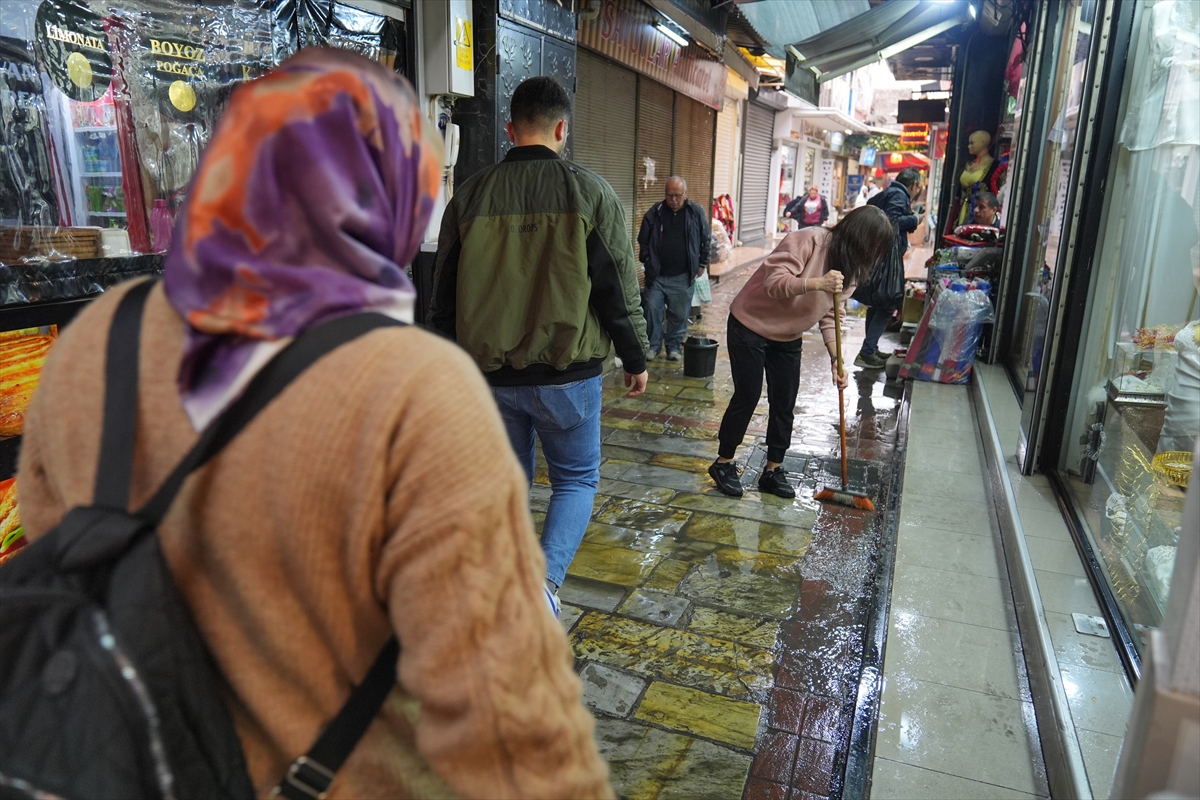 Üçyol yönünden akan su, bazı iş yerlerini bastı. Esnafın su baskınına karşı önlem almaya çalıştığı görülürken sağanağa sokakta yakalanan vatandaşlar zor anlar yaşadı.