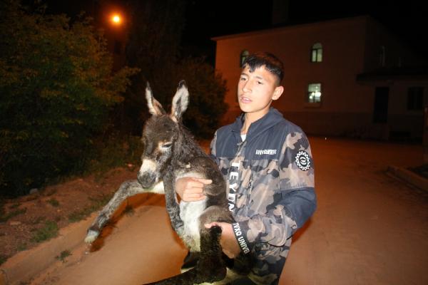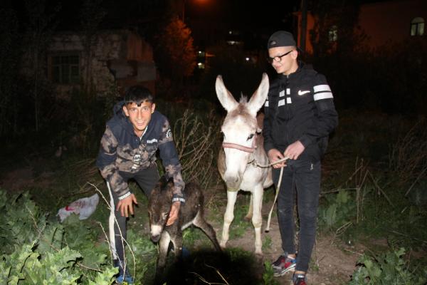 Cumhuriyet Ortaokulu 8'inci sınıf öğrencisi Emirhan Tanyeli (13) ve arkadaşları kollarına poşet geçirerek eşeğin doğumuna yardımcı oldu.
