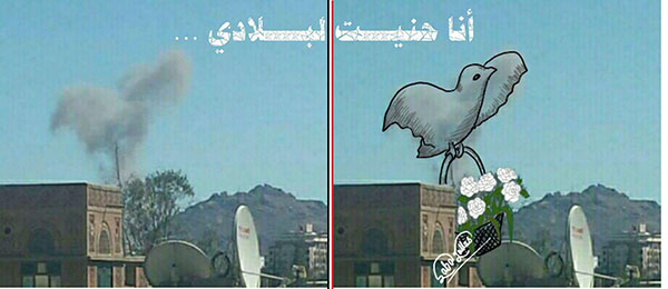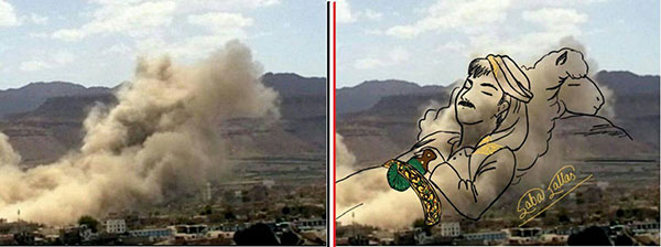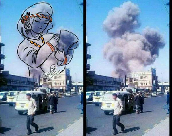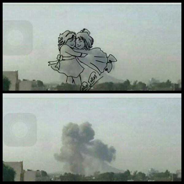 Suudi Arabistan’ın geçen yılın Mart ayından bu yana bombardımanlar düzenlediği Yemen’de sanatçı Saba Jallas, hava saldırılarında çekilen fotoğrafları barış ve sevgi temalı resimlere dönüştürüyor. Jallas, bu şekilde ülkesinde yaşananlara karşı yaşadığı şoktan kaçış noktası bulmaya çalıştığını söylüyor.