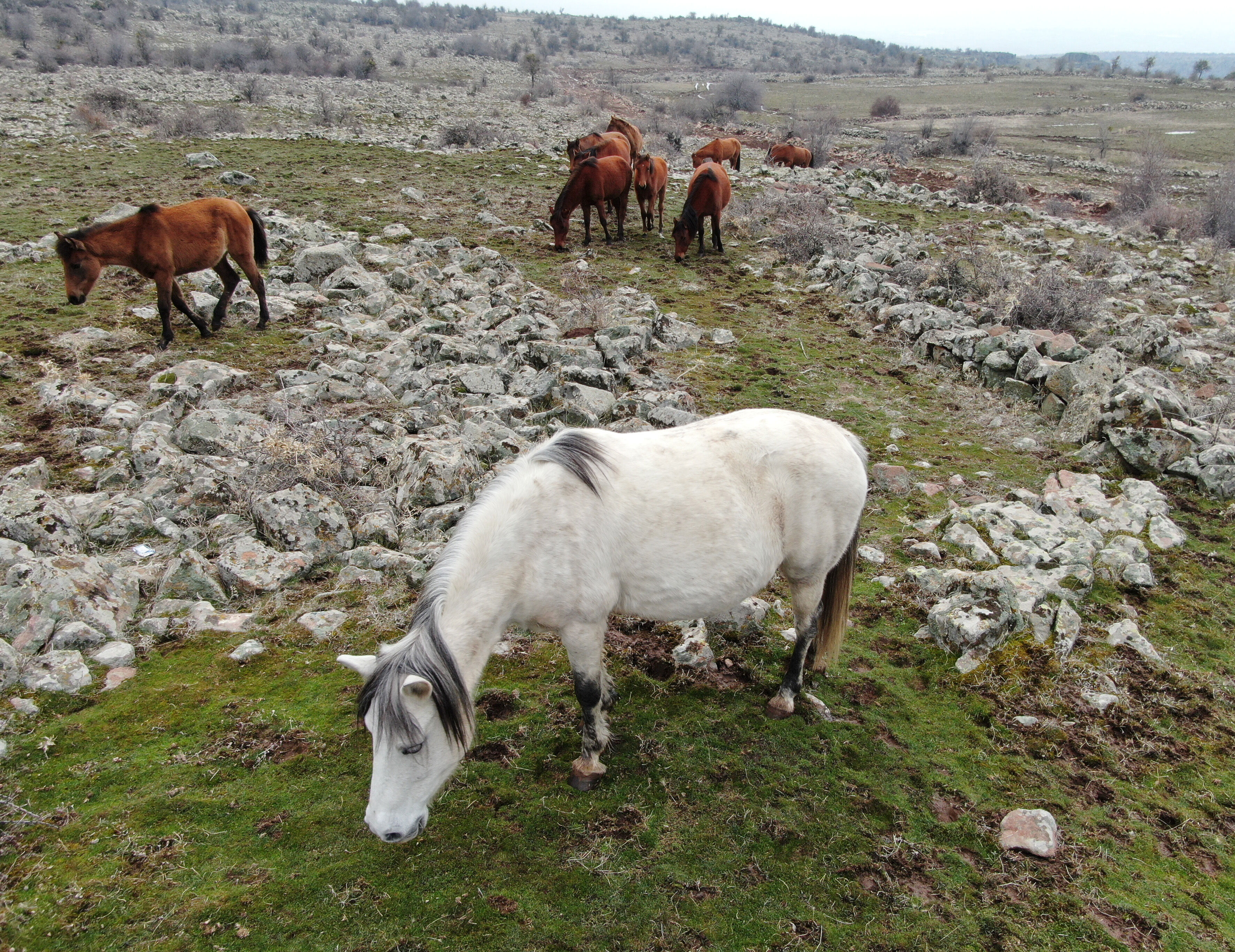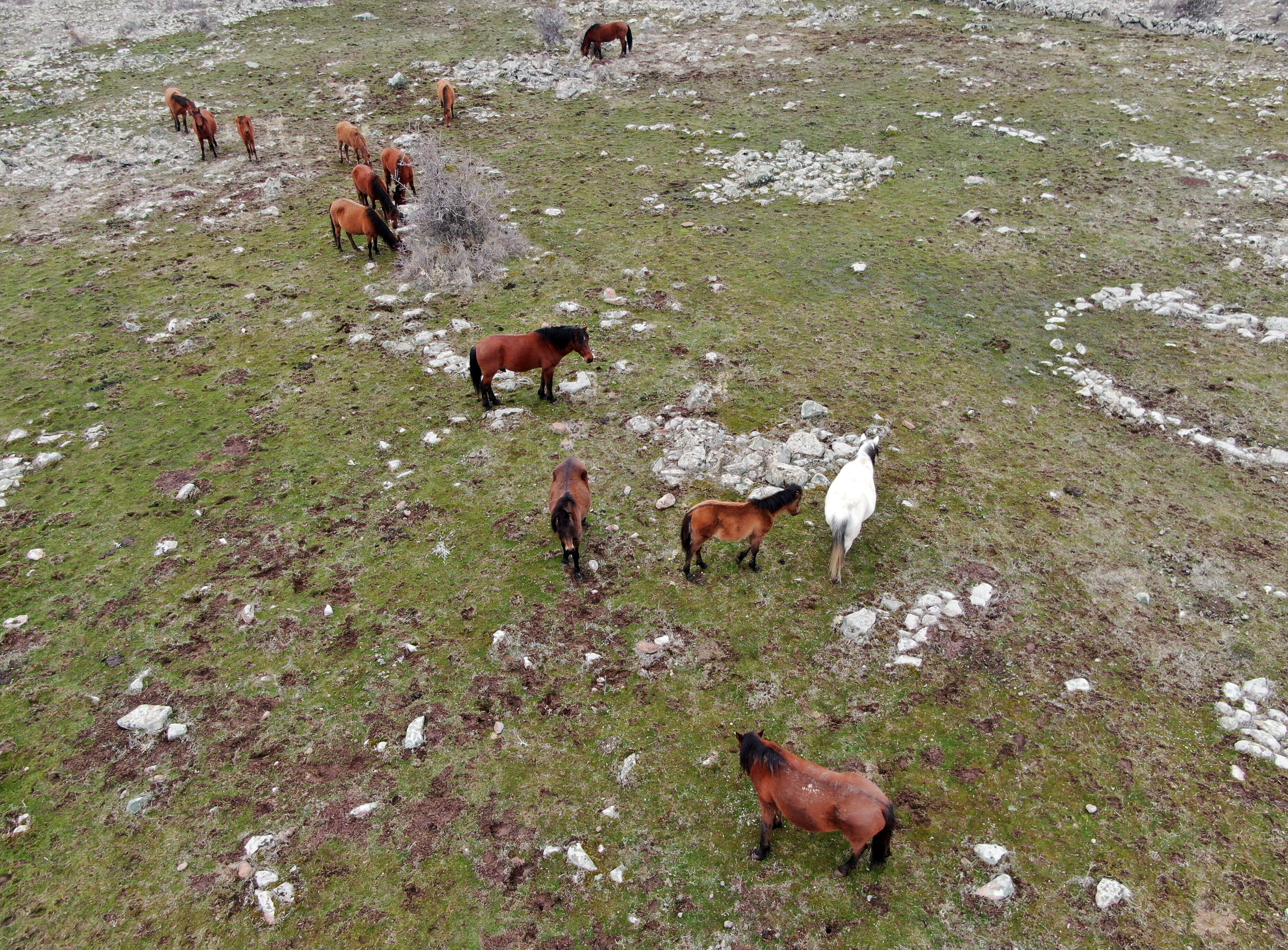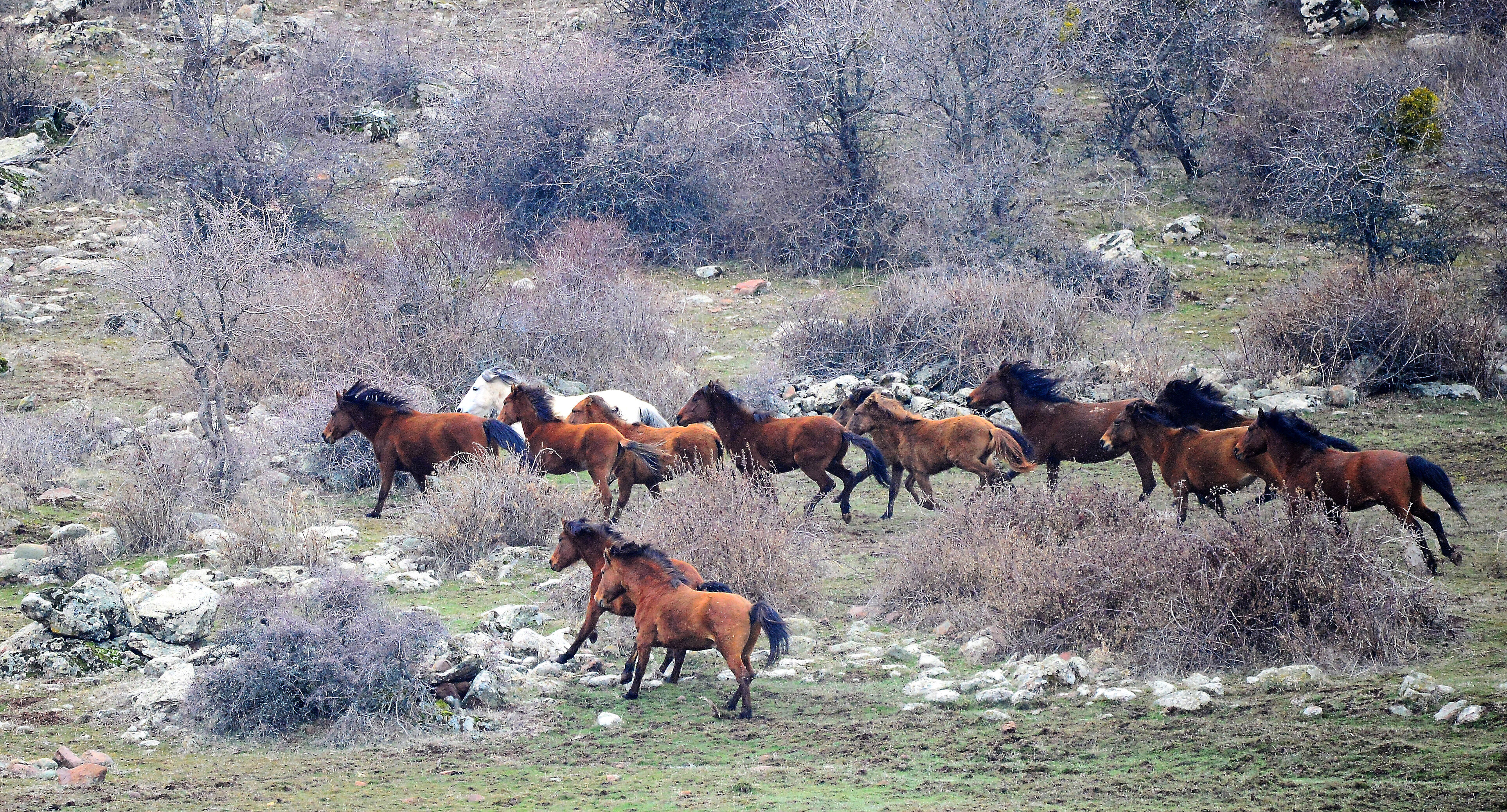 Murat Dağı eteklerinde üç ayrı sürü halinde yaşayan atlar, aşırı soğuklar nedeniyle daha korunaklı vadilerde yaşamlarını sürdürüyor. Yılkılar, taze otların bulunduğu alanlarda baharın gelişini bekliyor.
