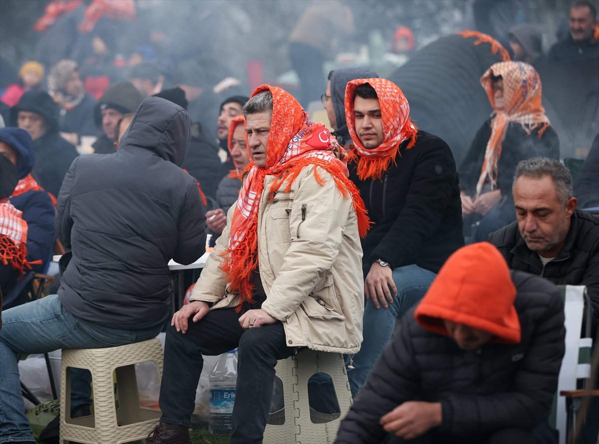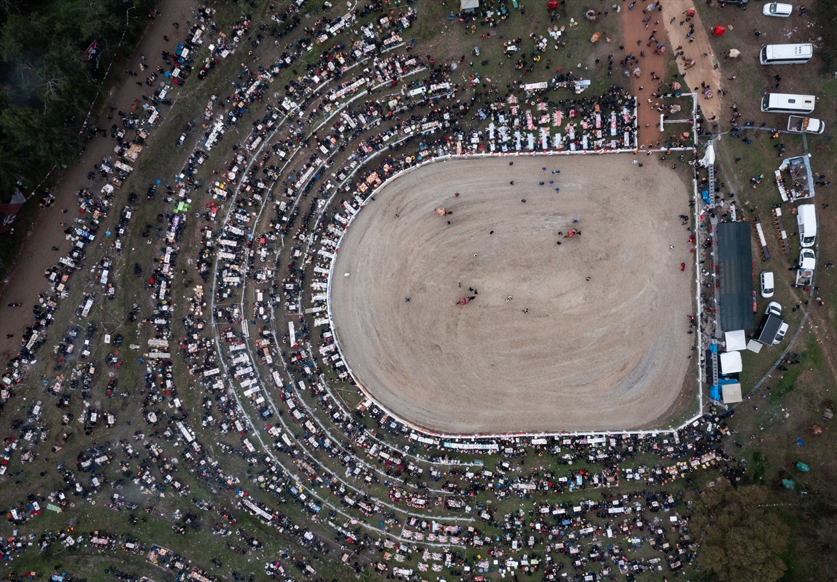 Çok sayıda deve güreşi meraklısı, soğuk havaya rağmen sahayı çevreleyen yamaçları erken saatlerden itibaren doldurdu.