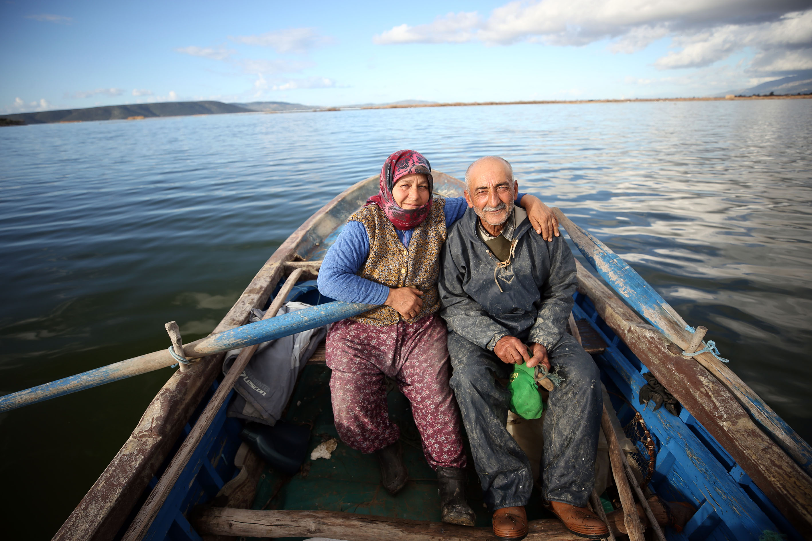 Aydın-Muğla sınırları arasında kalan Bafa Gölü'nün eşsiz manzarası eşliğinde ava çıkan balıkçılar arasında, 64 yaşındaki Ayşe Özbaşı ve eşi 65 yaşındaki Mehmet Özbaşı da bulunuyor. Çalışkanlıkları ve birbirlerine olan sevgilerini ortaya koyan tavırlarıyla dikkati çeken çift, 40 yıldır birlikte kürek çekiyor.