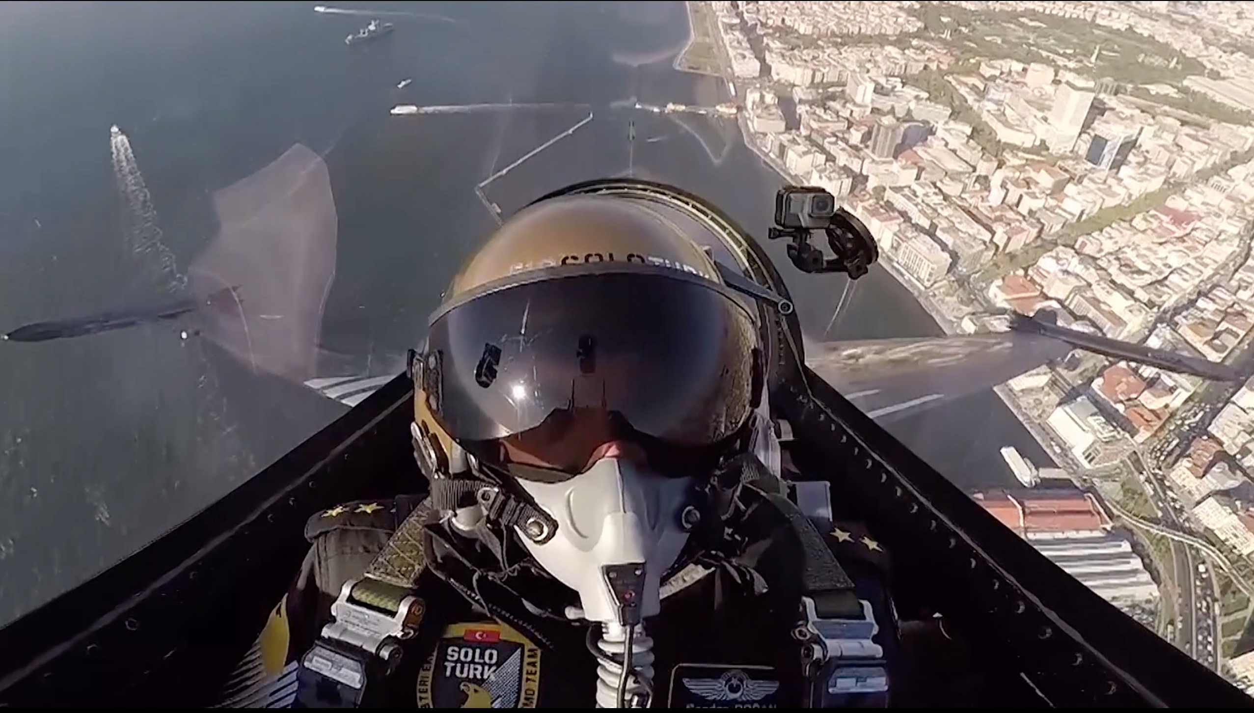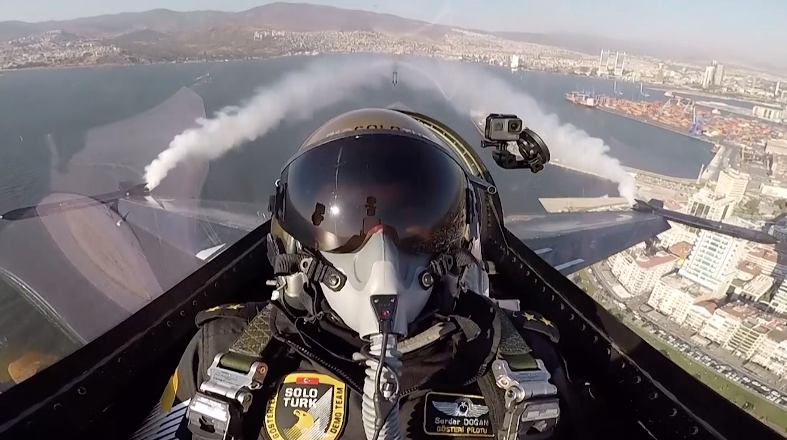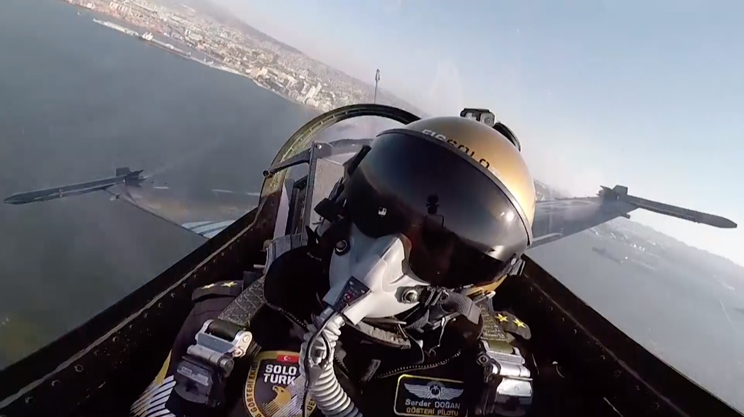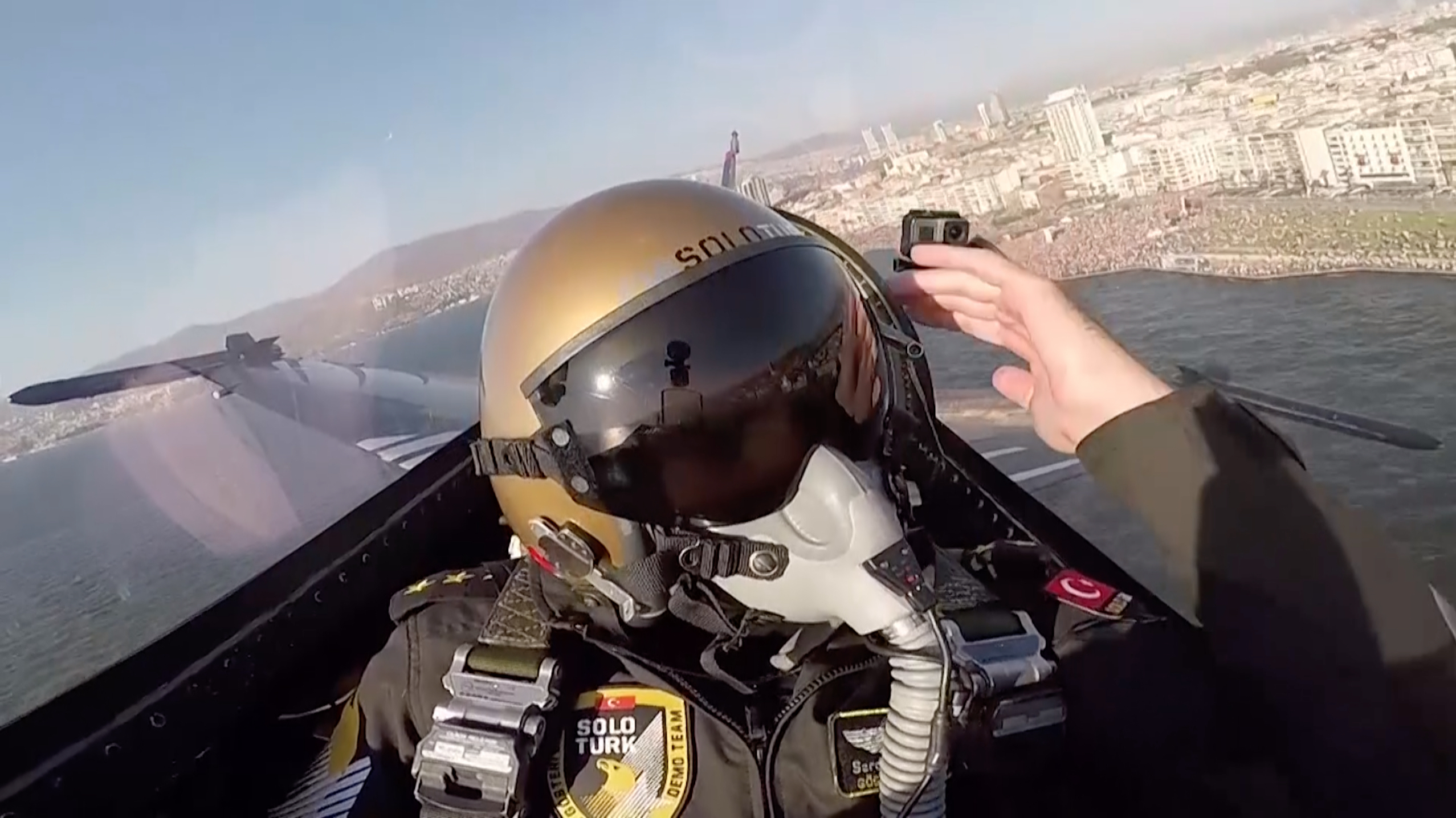 Türk Hava Kuvvetlerinin akrobasi timi SOLOTÜRK'ün, İzmir'in düşman işgalinden kurtuluşunun yıl dönümünde gerçekleştirdiği özel akrobasi gösterisinin kokpit içi görüntüsü yayınlandı.