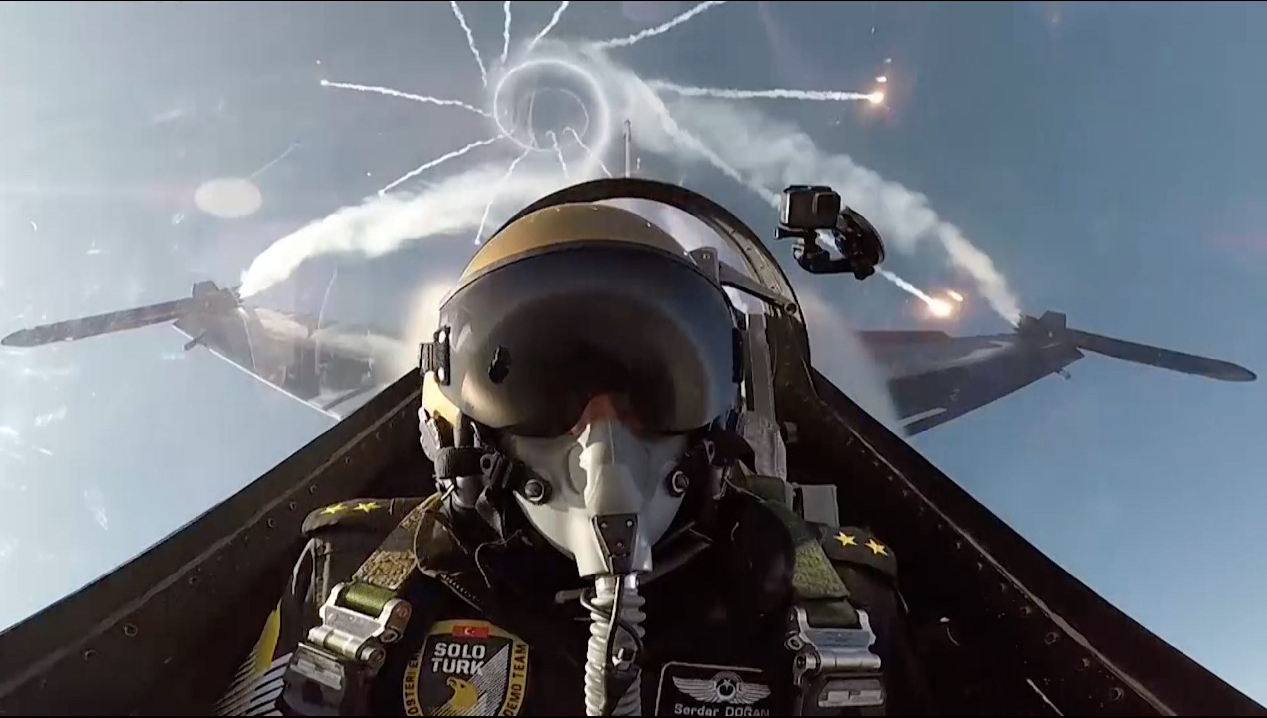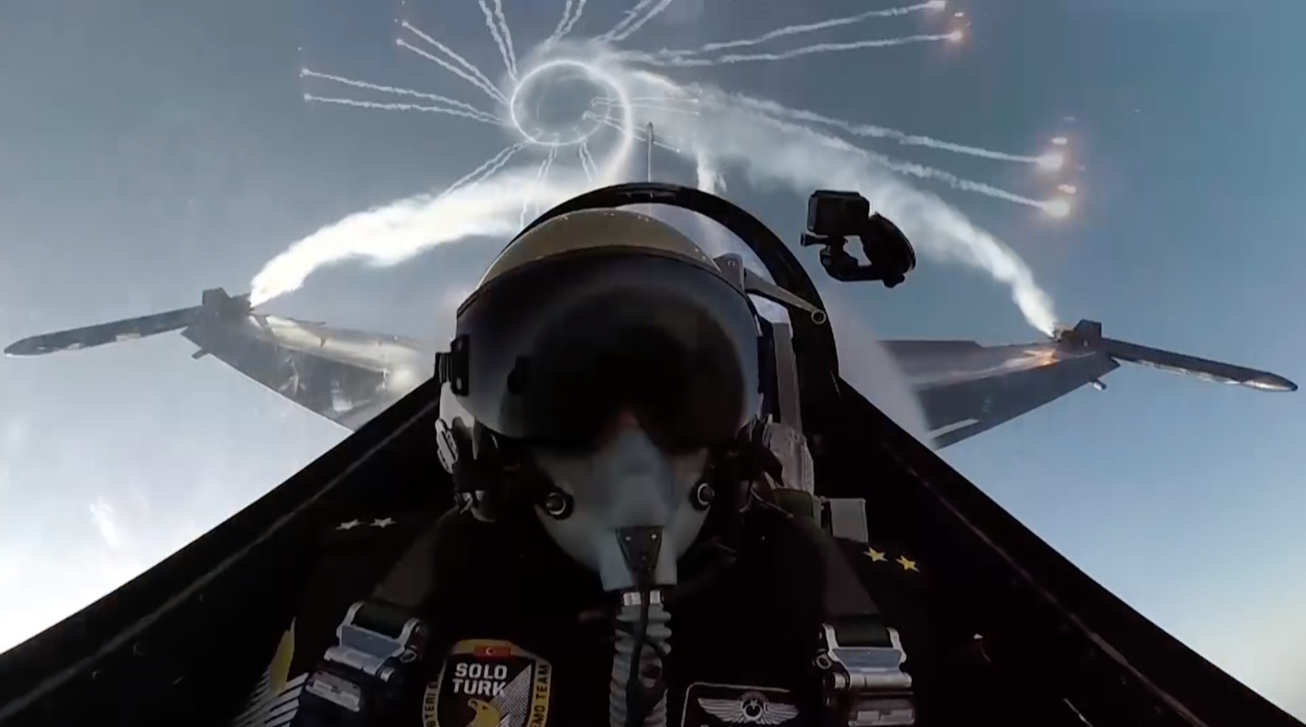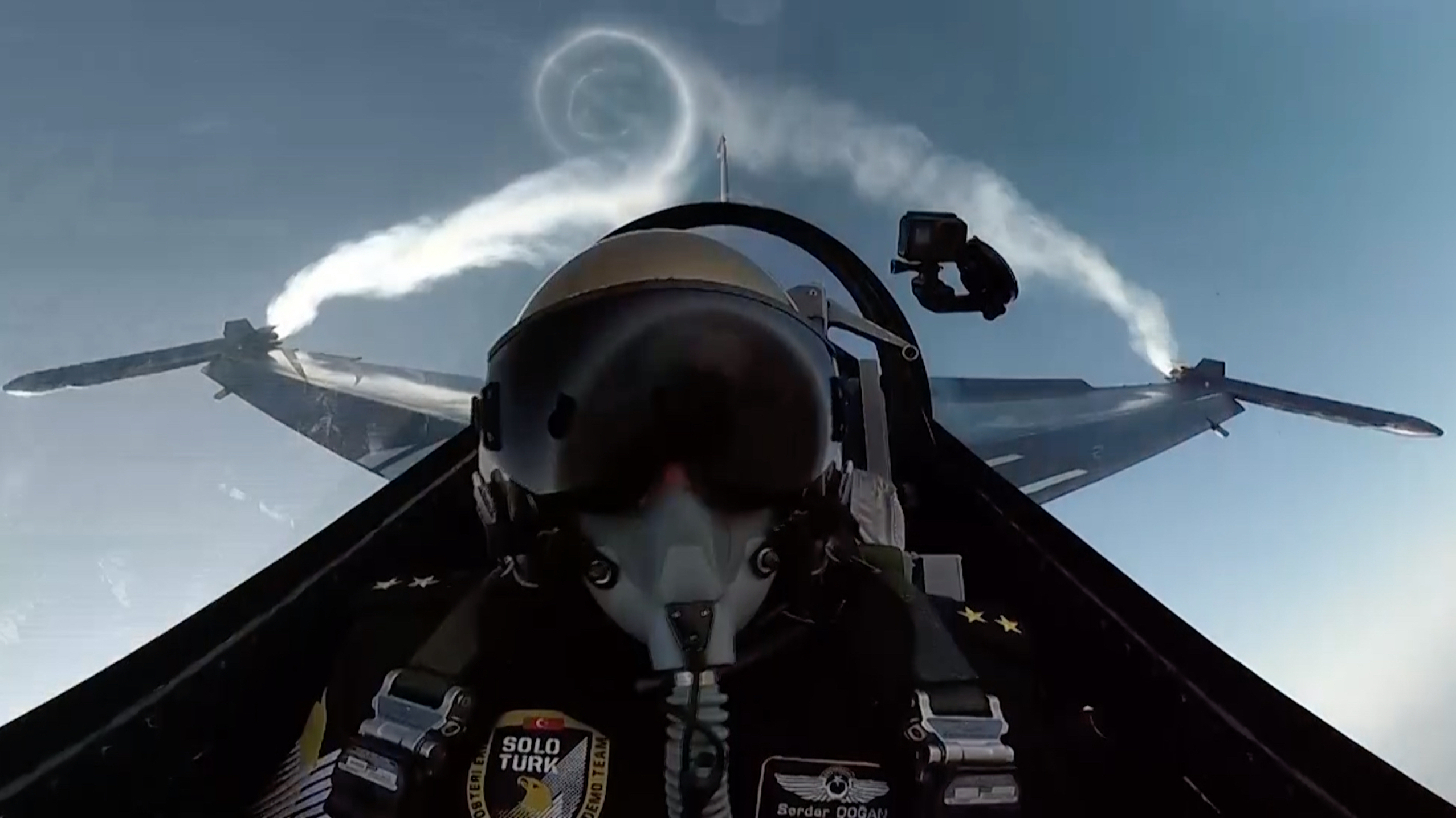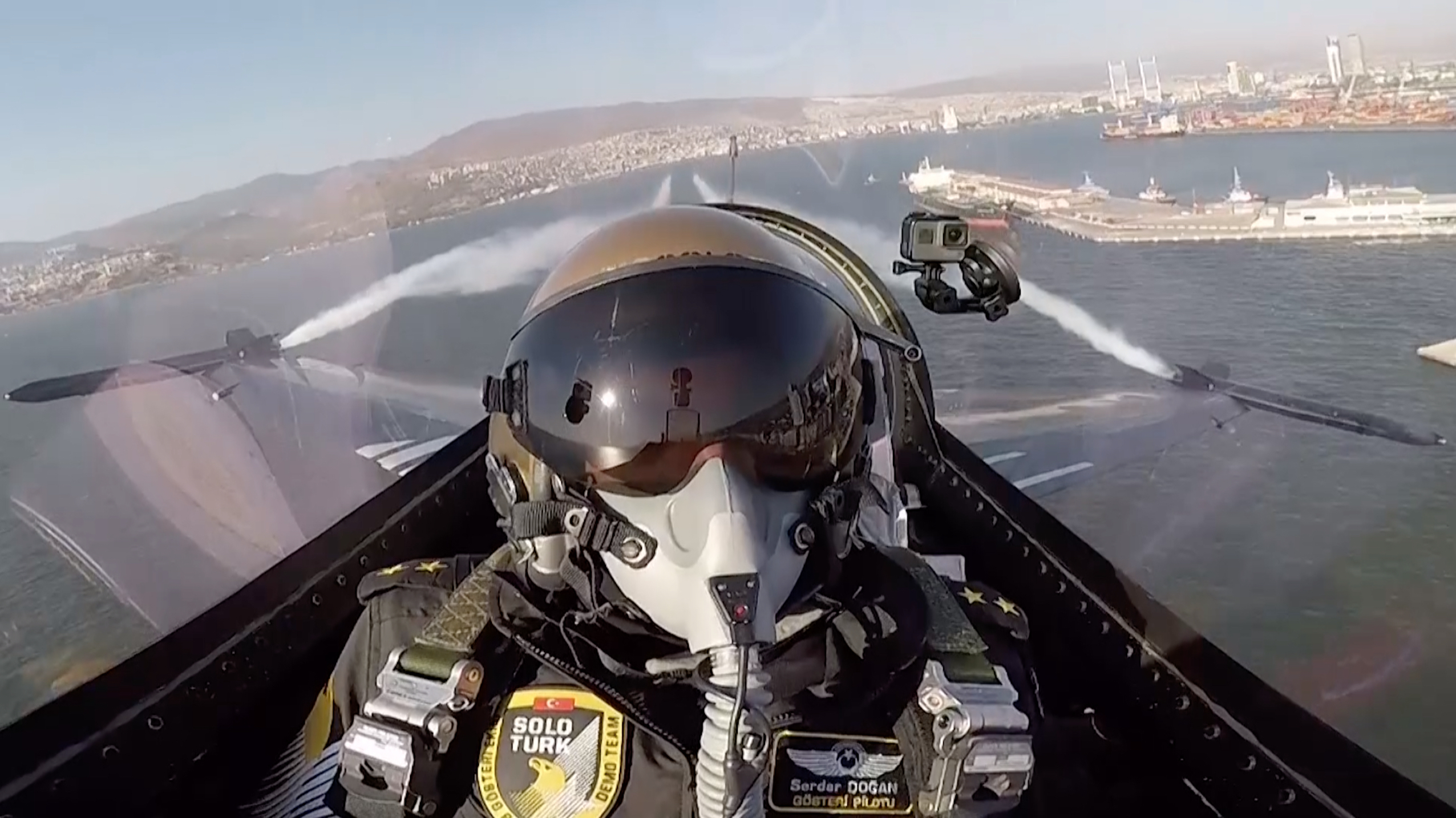 Türk Hava Kuvvetlerinin akrobasi timi SOLOTÜRK'ün, İzmir'in düşman işgalinden kurtuluşunun yıl dönümünde gerçekleştirdiği özel akrobasi gösterisinin kokpit içi görüntüsü yayınlandı.