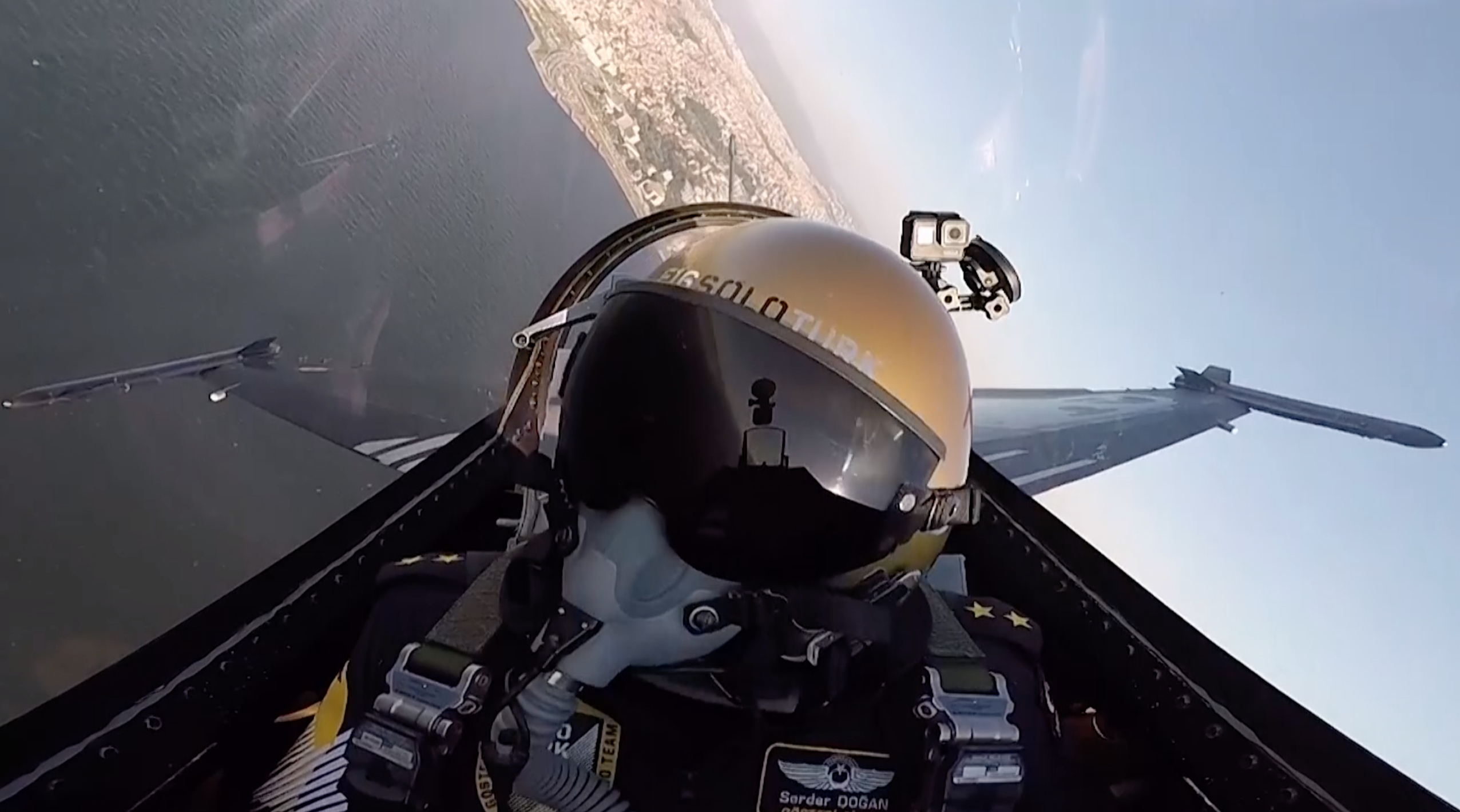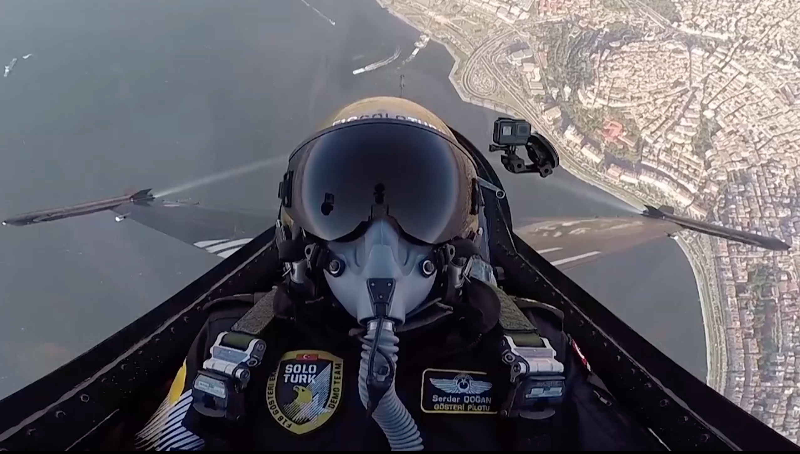 Hava Pilot Yüzbaşı Serdar Doğan komutasında havalanan SOLOTÜRK'ün, gökyüzündeki cesur hareketleri kokpit içindeki kameraya yansıdı.