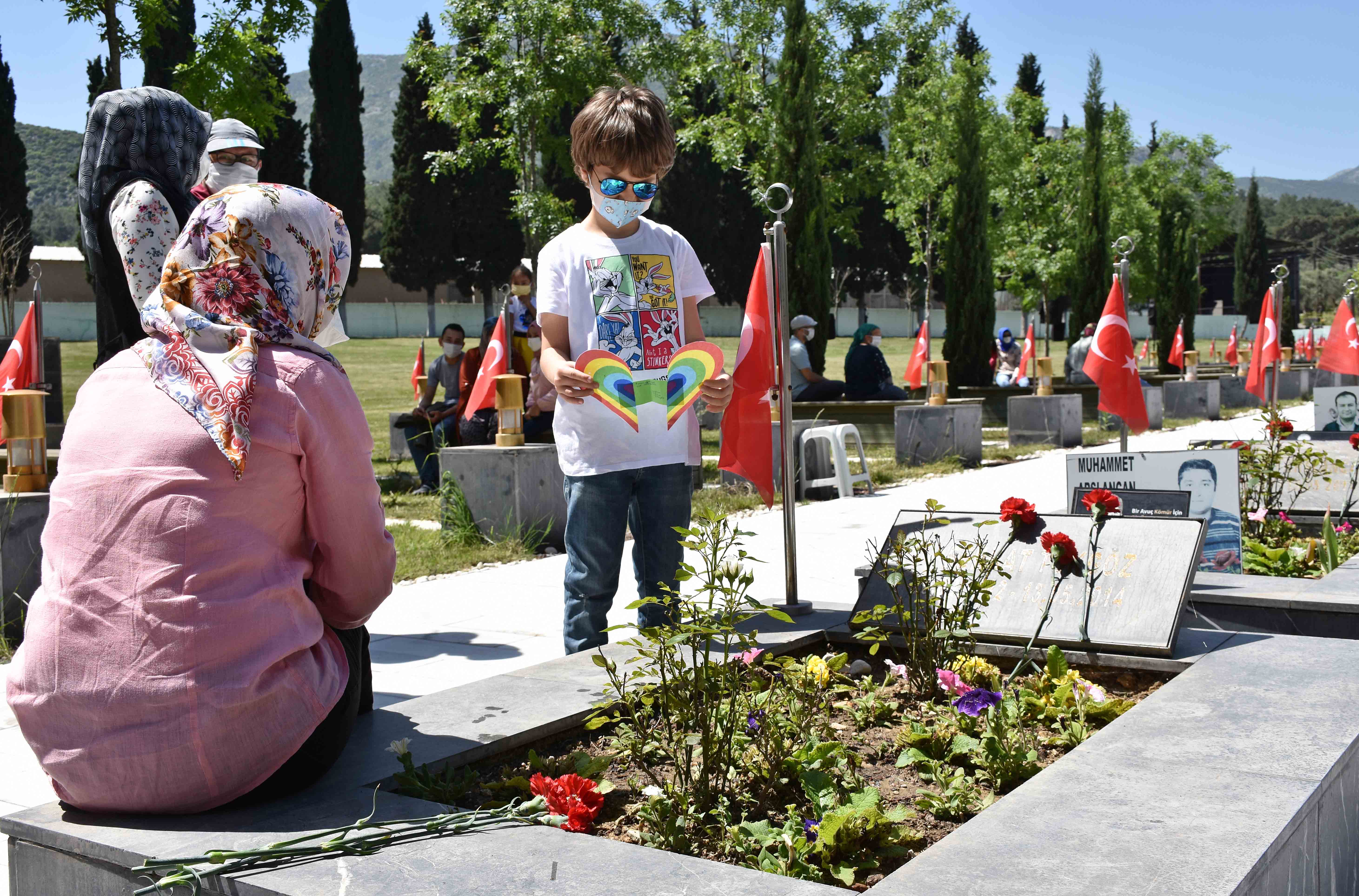 Babalarının mezarları başında dua eden madenci çocuklarından bazıları, babaları için çizdikleri resimleri babalarının kabrine bıraktı.
