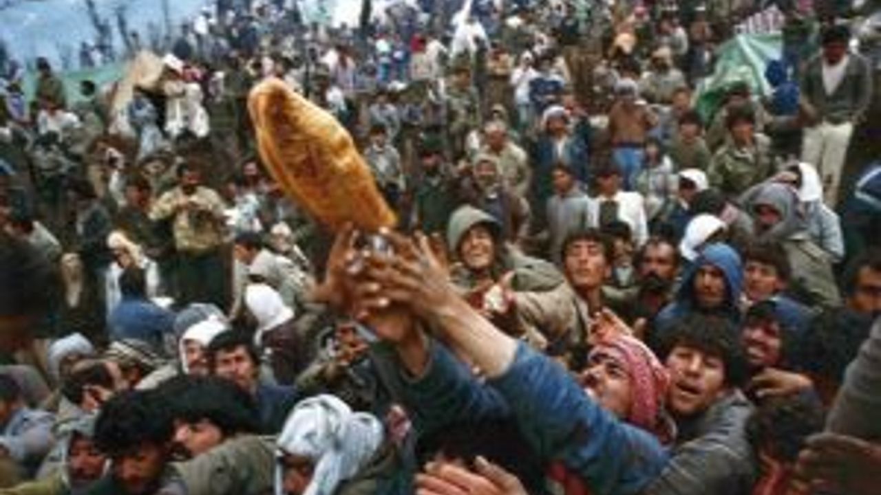 "Irak-Türkiye sınırındaki Kürt sığınmacılar insani yardım ekiplerinden ekmek yardımı almaya çalışıyor. 5 Nisan 1992 İlk Irak Savaşı sonunda 1,5 milyon Kürt Saddam rejiminden kaçarak 600 bin kişilik bir kısmı Türkiye`ye geriye kalanları ise sınırdaki dağlara sığınmıştı."