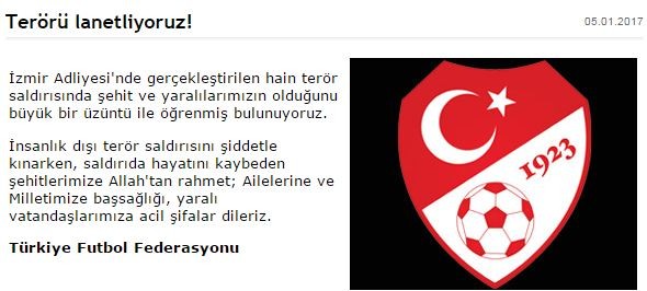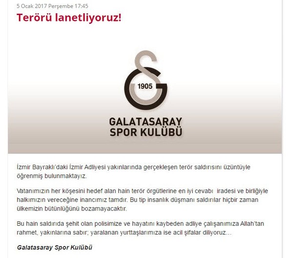 Fenerbahçe: "İzmir Adliyesi’ne bomba yüklü araçla terör saldırısı düzenlendiğini derin bir üzüntüyle öğrendik. Ülkemizde şiddet ve kaos iklimini kalıcı hale getirme hedefi taşıyan tüm örgütleri ve oluşumları lanetliyor, şehitlerimize Allah'tan rahmet, kederli ailelerine ve ülkemize başsağlığı, yaralı vatandaşlarımıza ise acil şifalar diliyoruz."