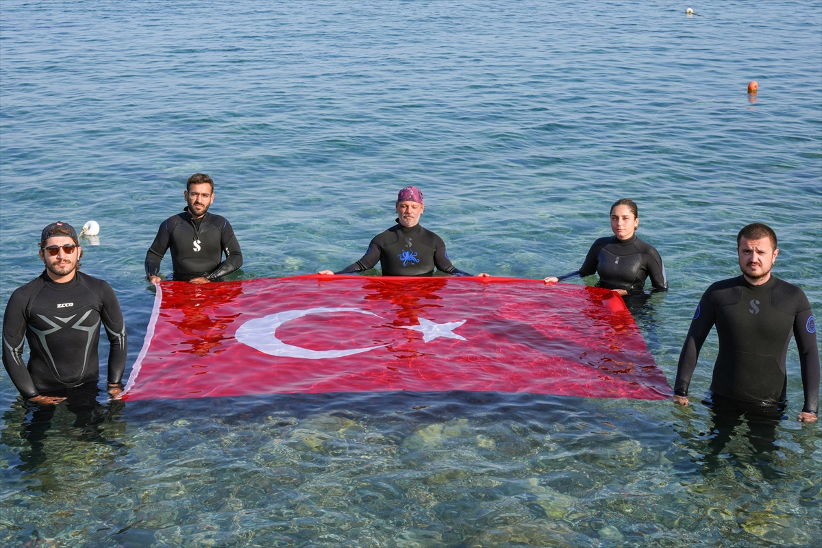 Önemli dalış noktalarından İzmir'in Karaburun ilçesinde, dalgıçlar kentin düşman işgalinden kurtuluşunun 102'nci yıl dönümünü su altında Türk bayrağı açarak kutladı.