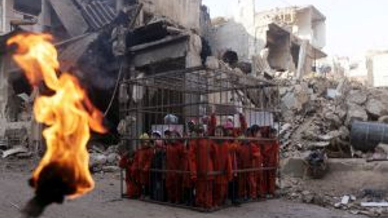 "Rakka sessizce katlediliyor" isimli muhalif grup, Esad rejimine bağlı savaş uçakları tarafından atılan varil bombalarıyla yüzlerce çocuğun yanarak can verdiğine dikkat çekmek amacıyla, bir grup çocuk ve kadına turuncu tulumlar giydirerek bir kafese kilitledi.
