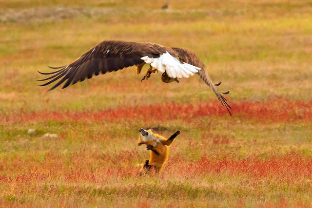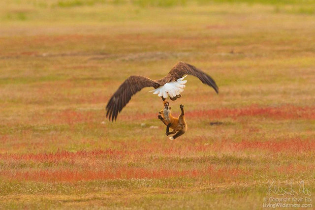 Aynı zamanda, fırsatını bulduklarında başkalarından yiyecek çalma konusunda da oldukça ustadırlar. Fotoğrafçı Kevin Ebi de, Kartal Yılı adlı kitabında kel kartalın, tilkinin ve tavşanın savaşına yer vererek kıran kırana mücadeyi kayıt altına aldı.