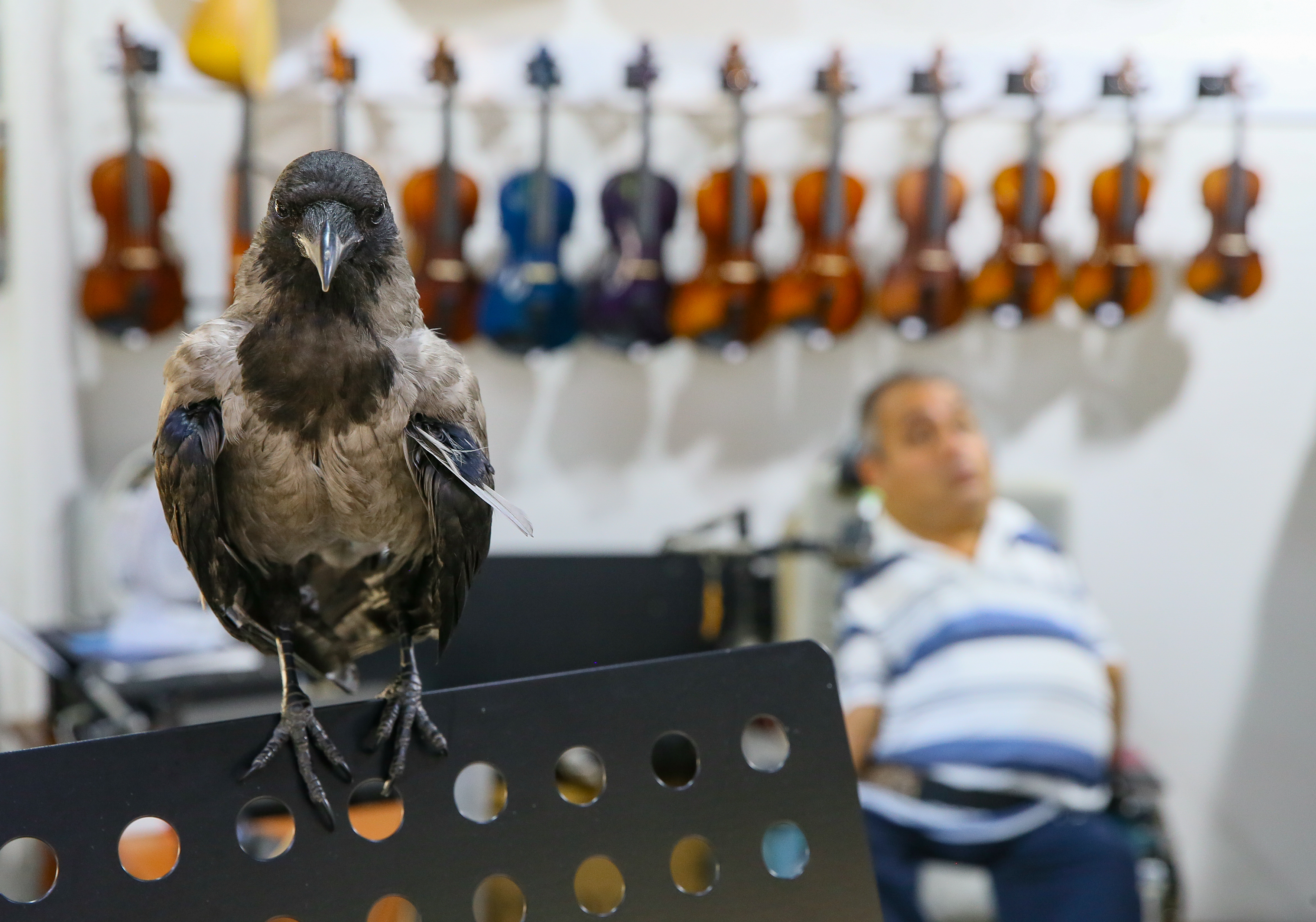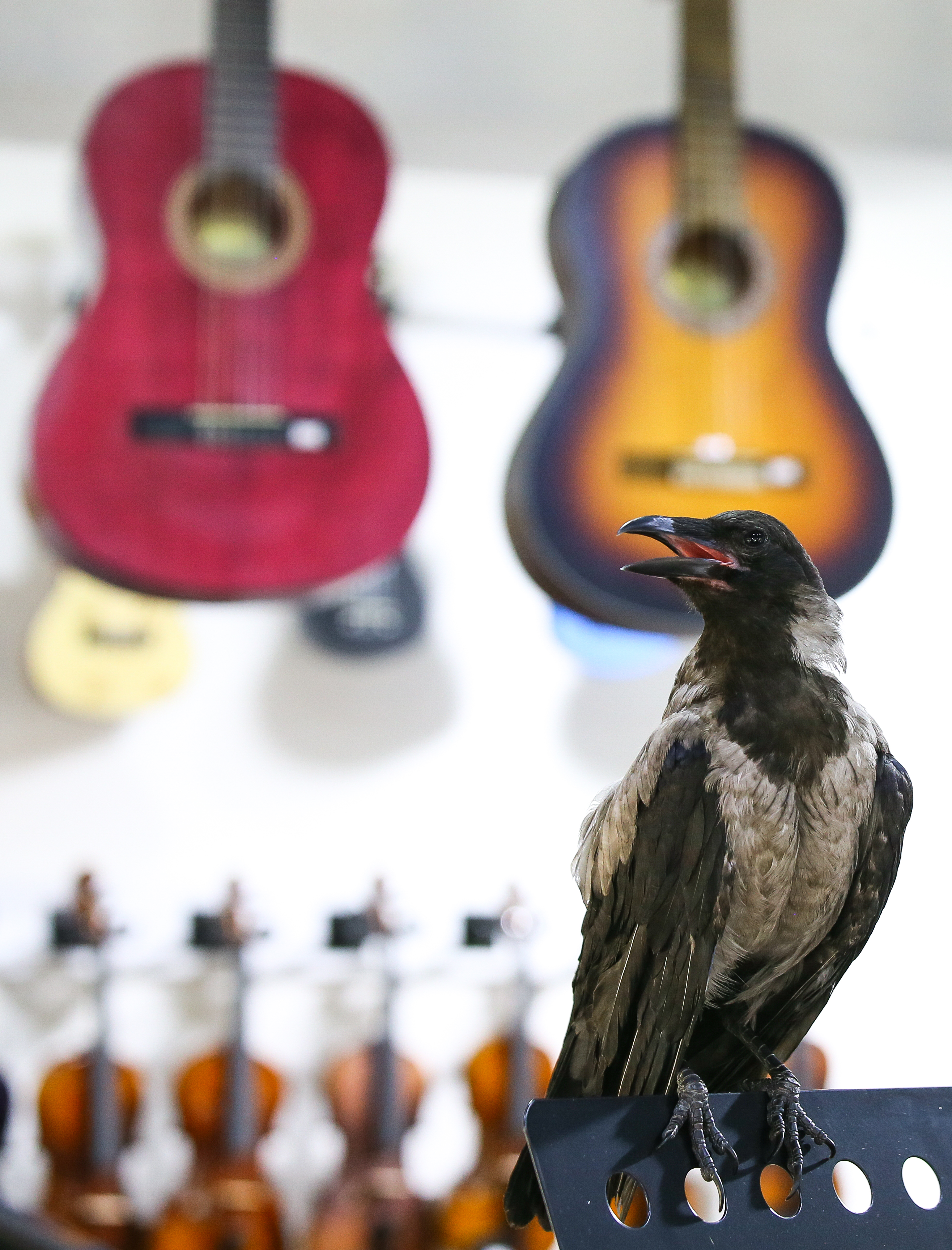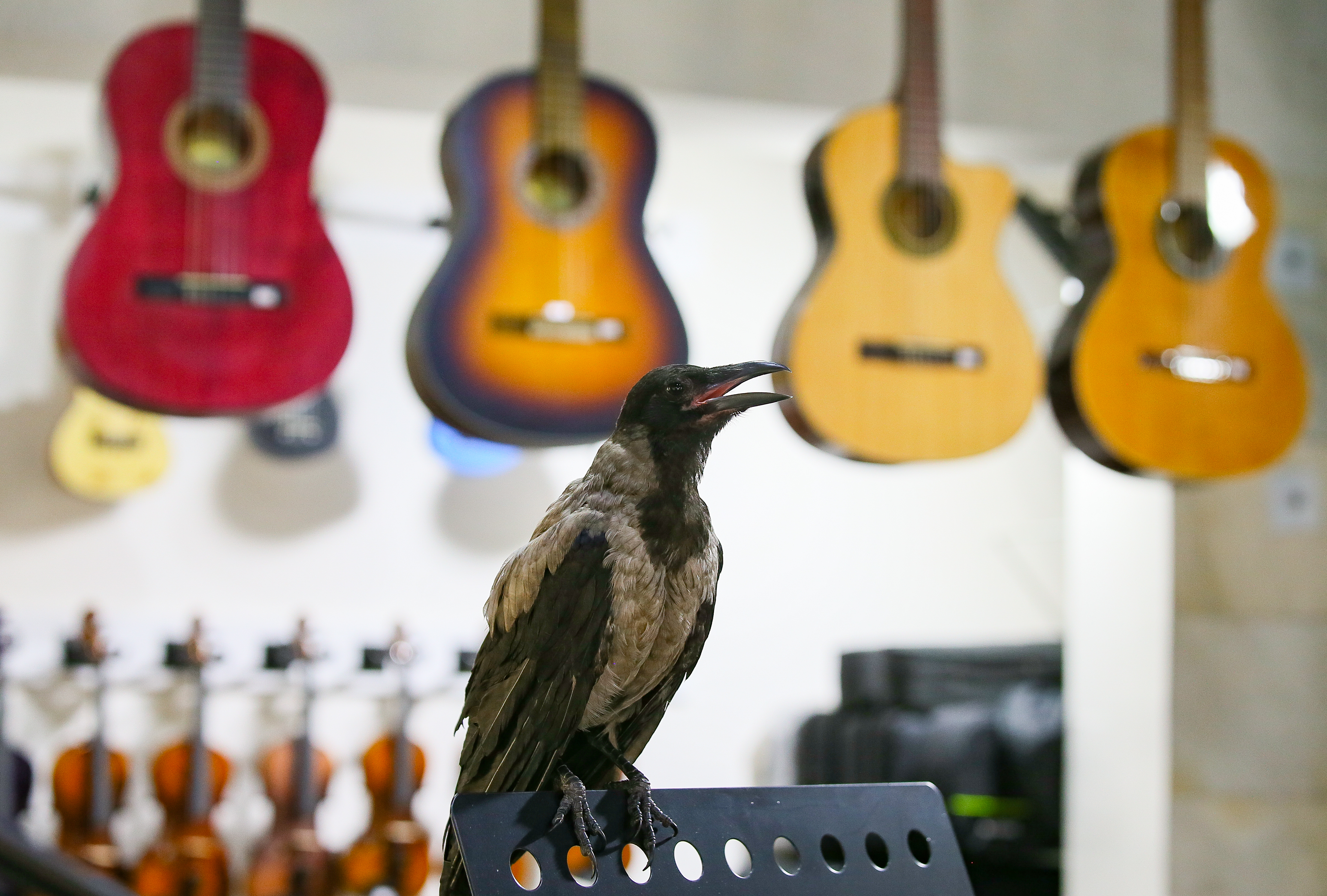 Duran, Bostanlı semtinde 21 yıldır işlettiği müzik merkezi yakınlarında, 3 ay önce yolda sürünen yaralı karga yavrusu gördü.