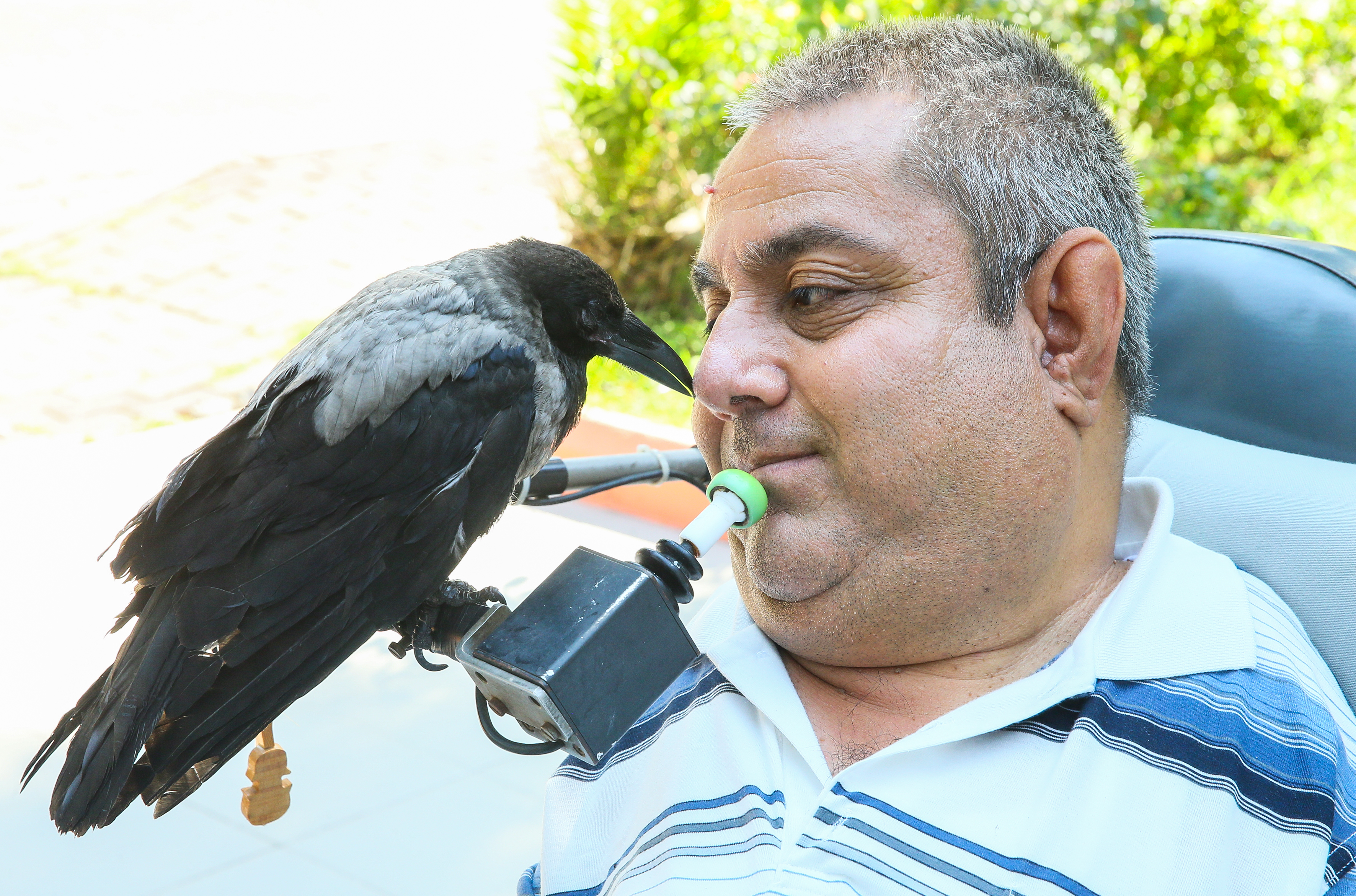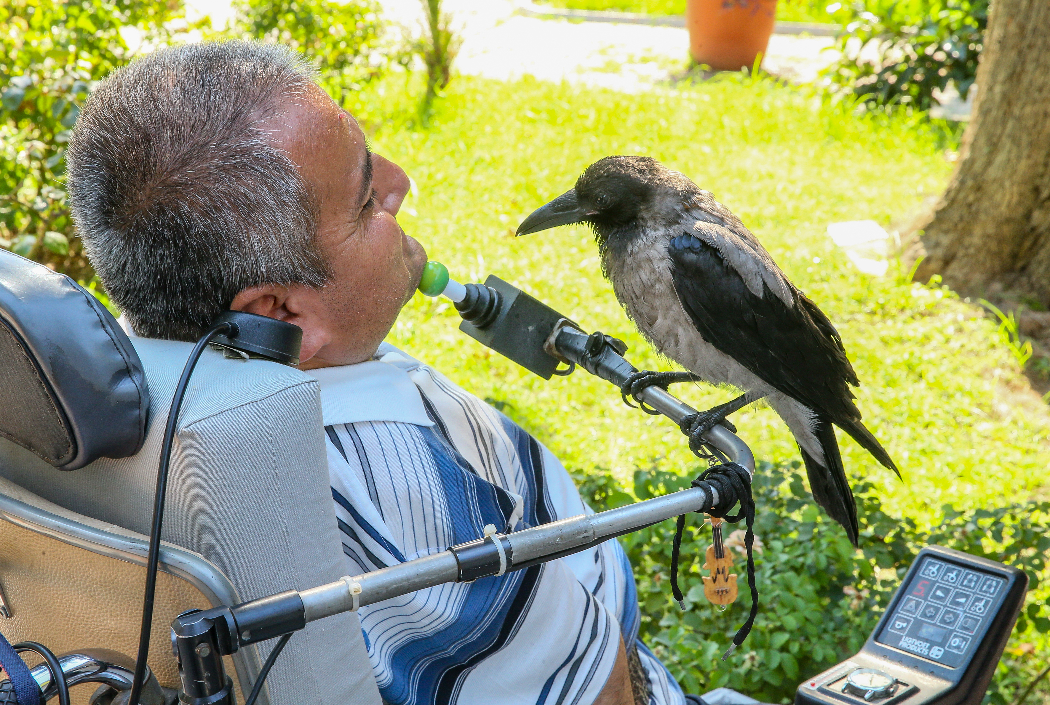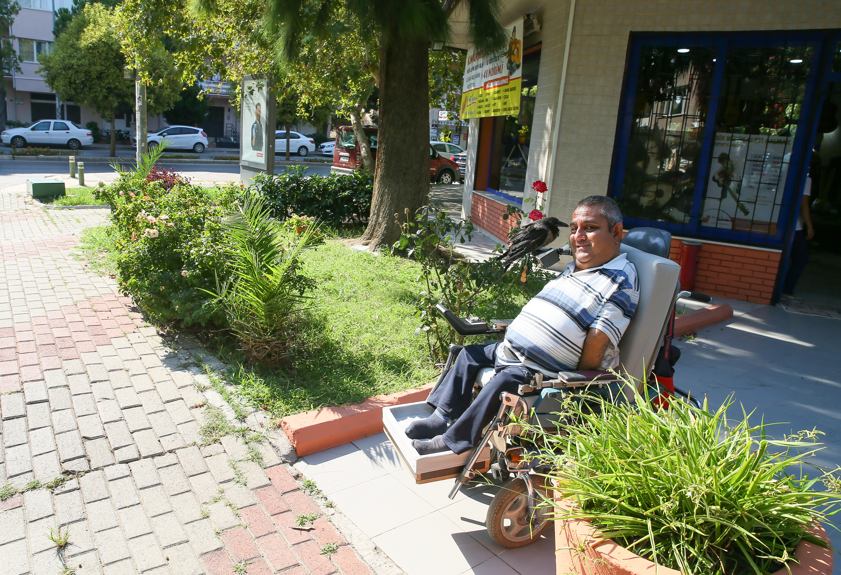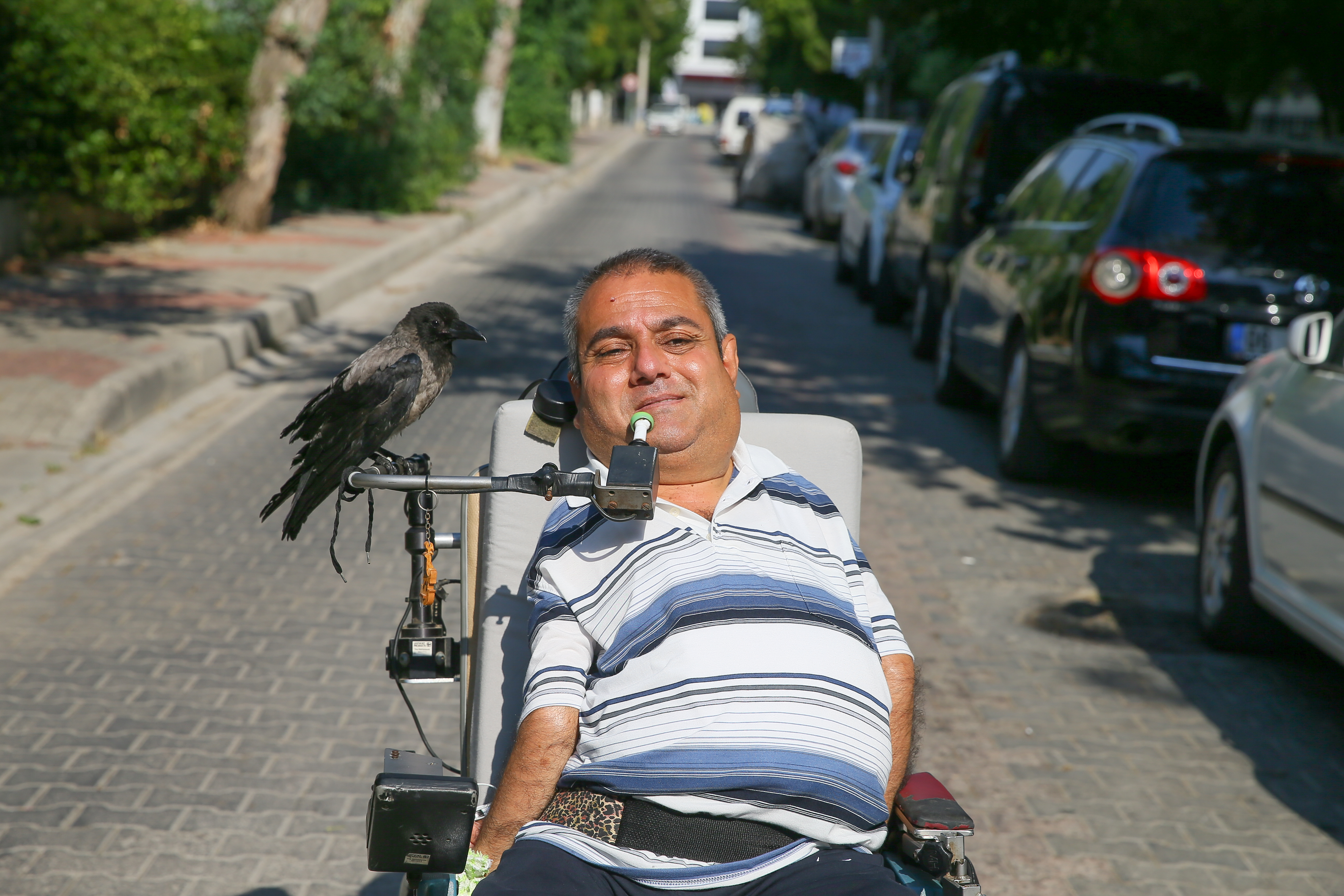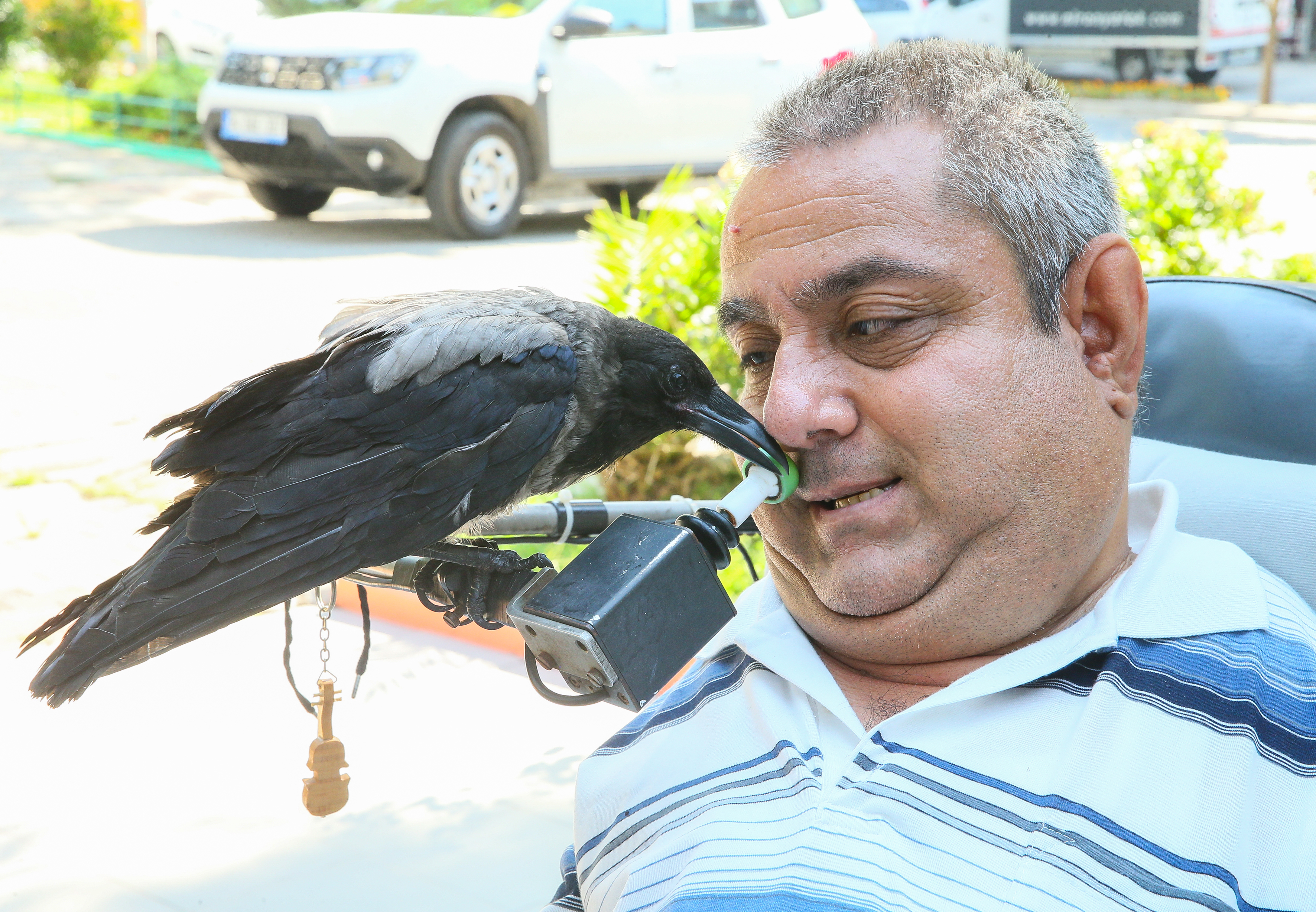 İzmir'de oturan 50 yaşındaki doğuştan bedensel engelli Murat Duran'ın, yaralı bulup tedavi ettikten sonra omzundan ayrılmayan kargayla "arkadaşlığı" dikkati çekiyor.