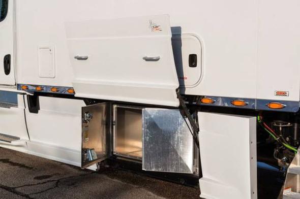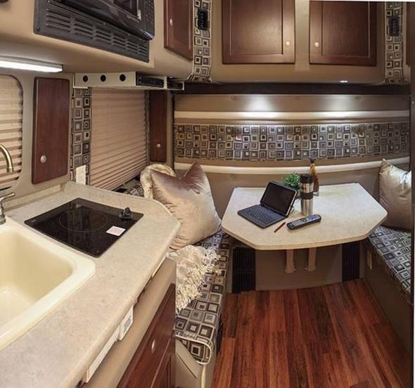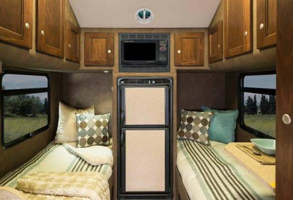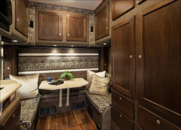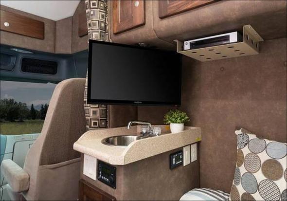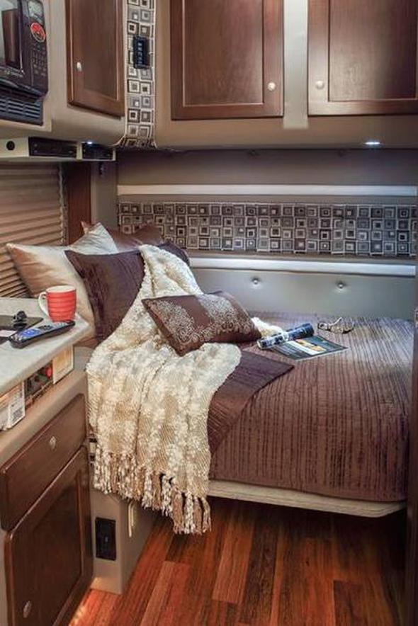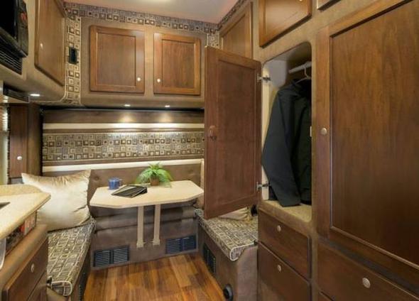 Tırın içi o kadar işlevsel kullanılmış ki içinde televizyon ve kıyafetleri koyabilecek dolaplar bile var.