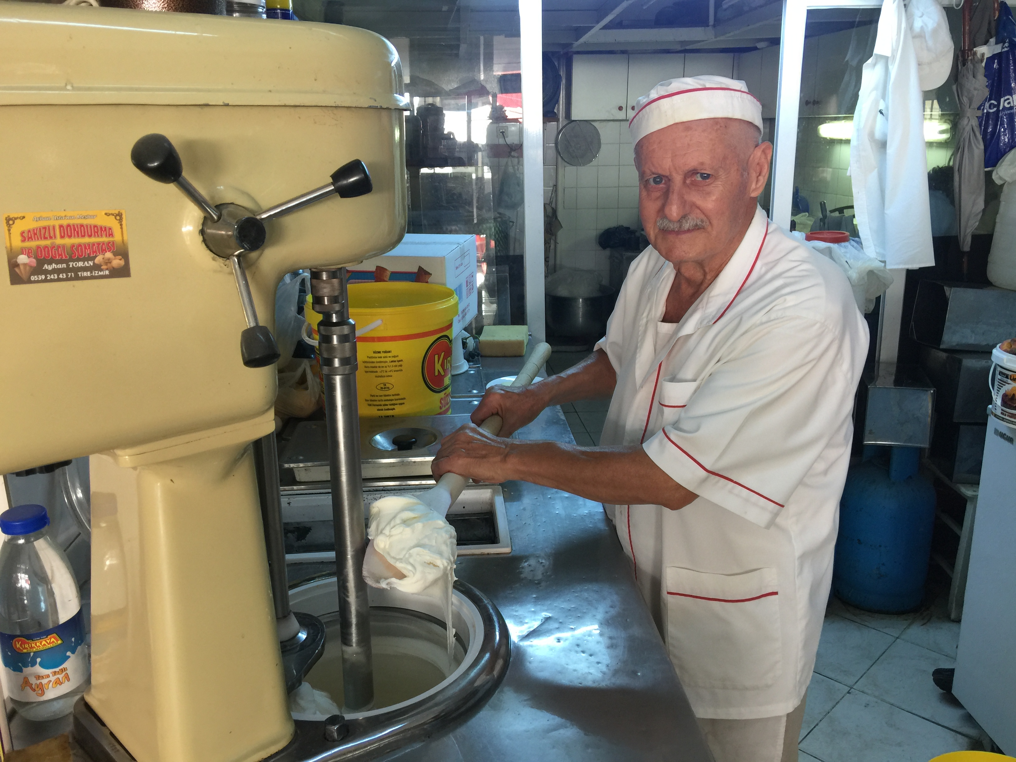 İzmir'in Tire ilçesinde yaşayan 73 yaşındaki Ayhan Toran, 61 yıldır dondurma yapıyor.
