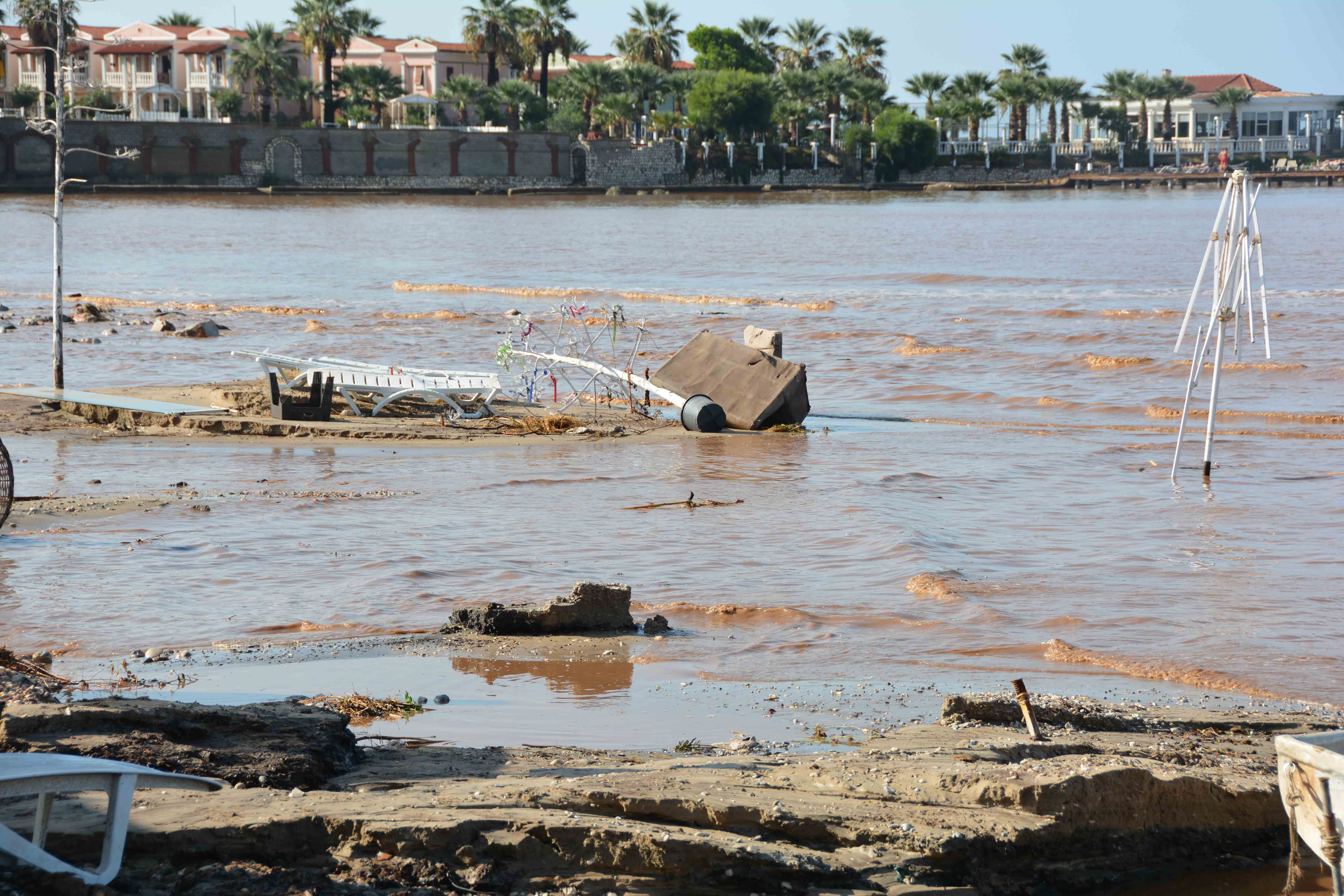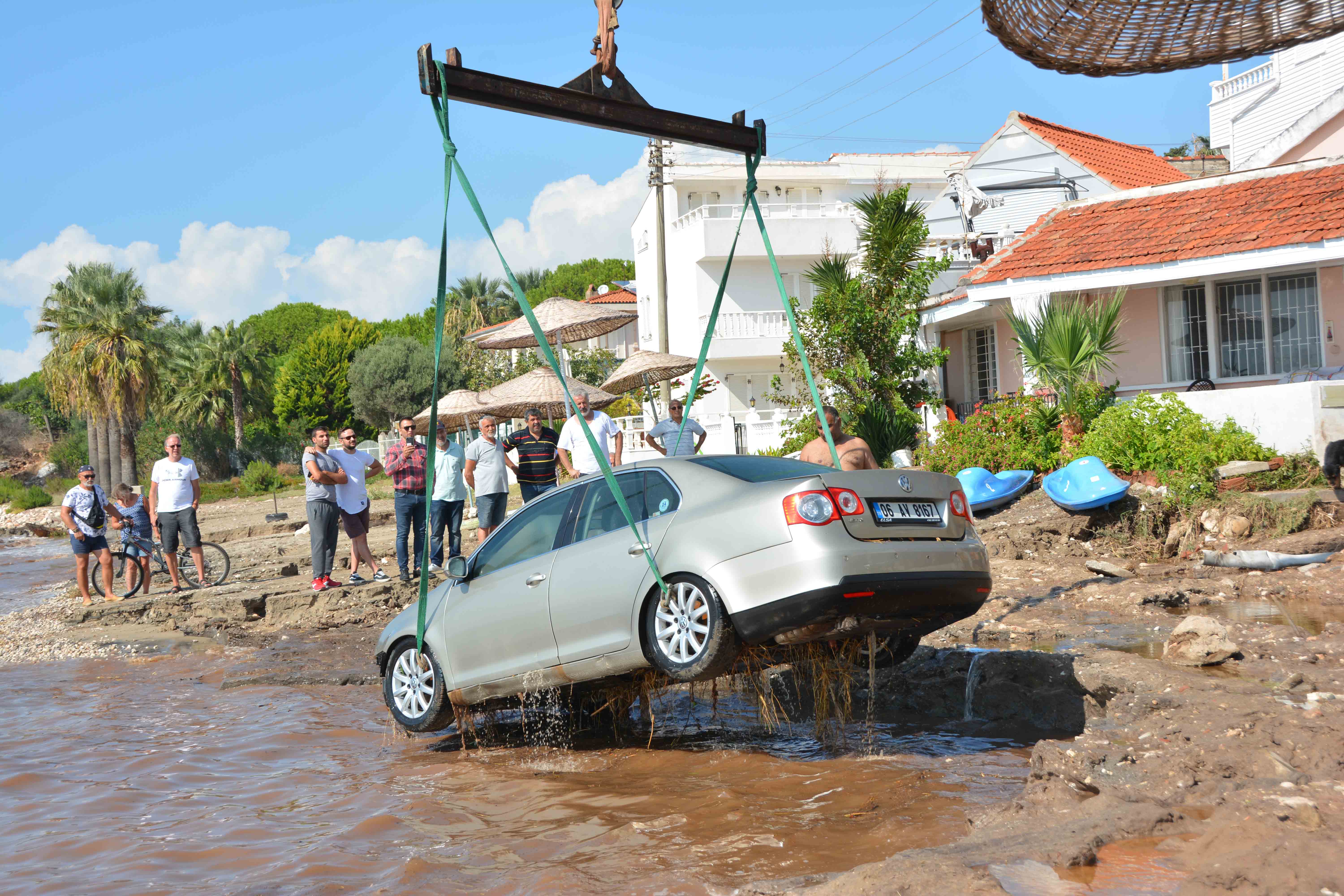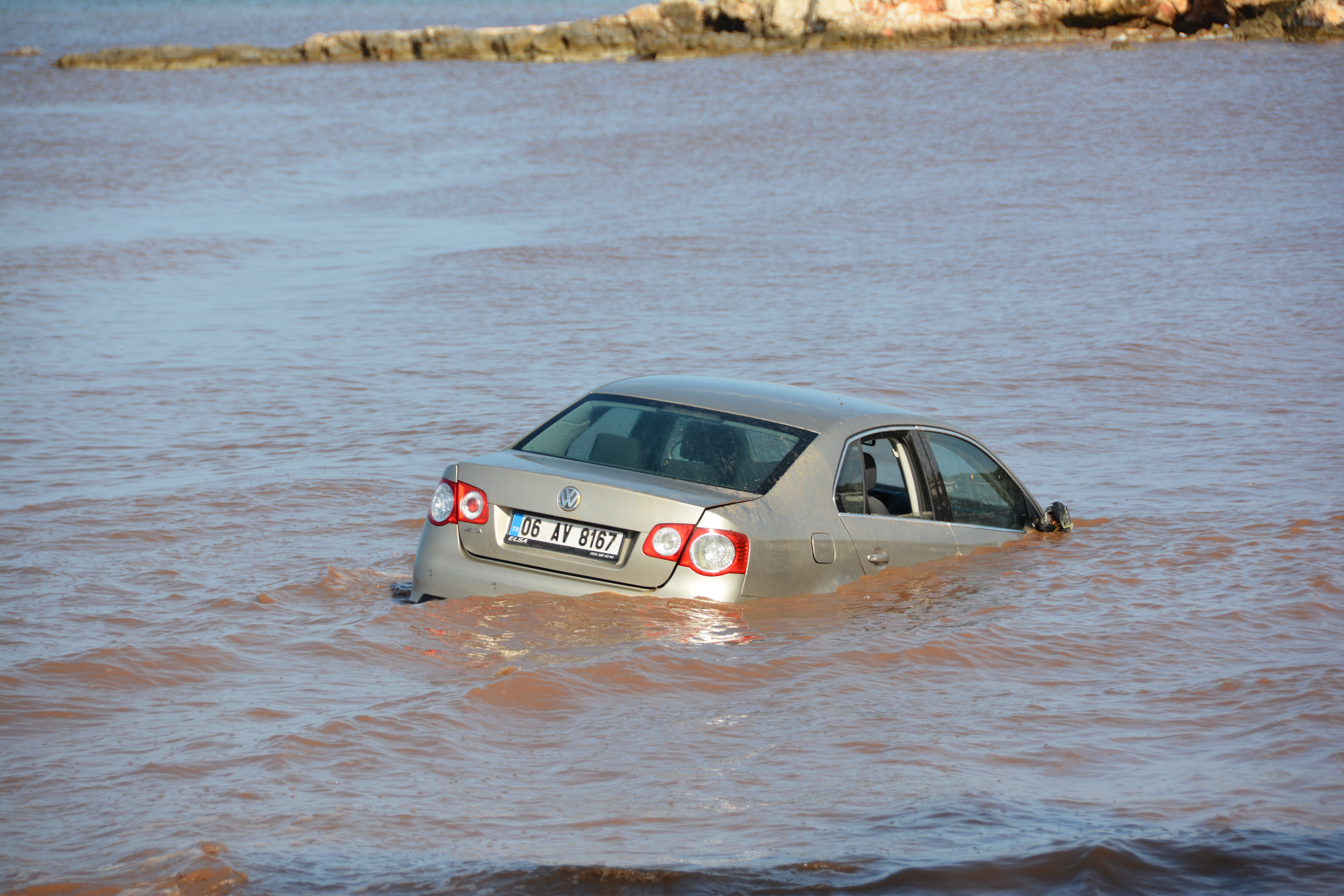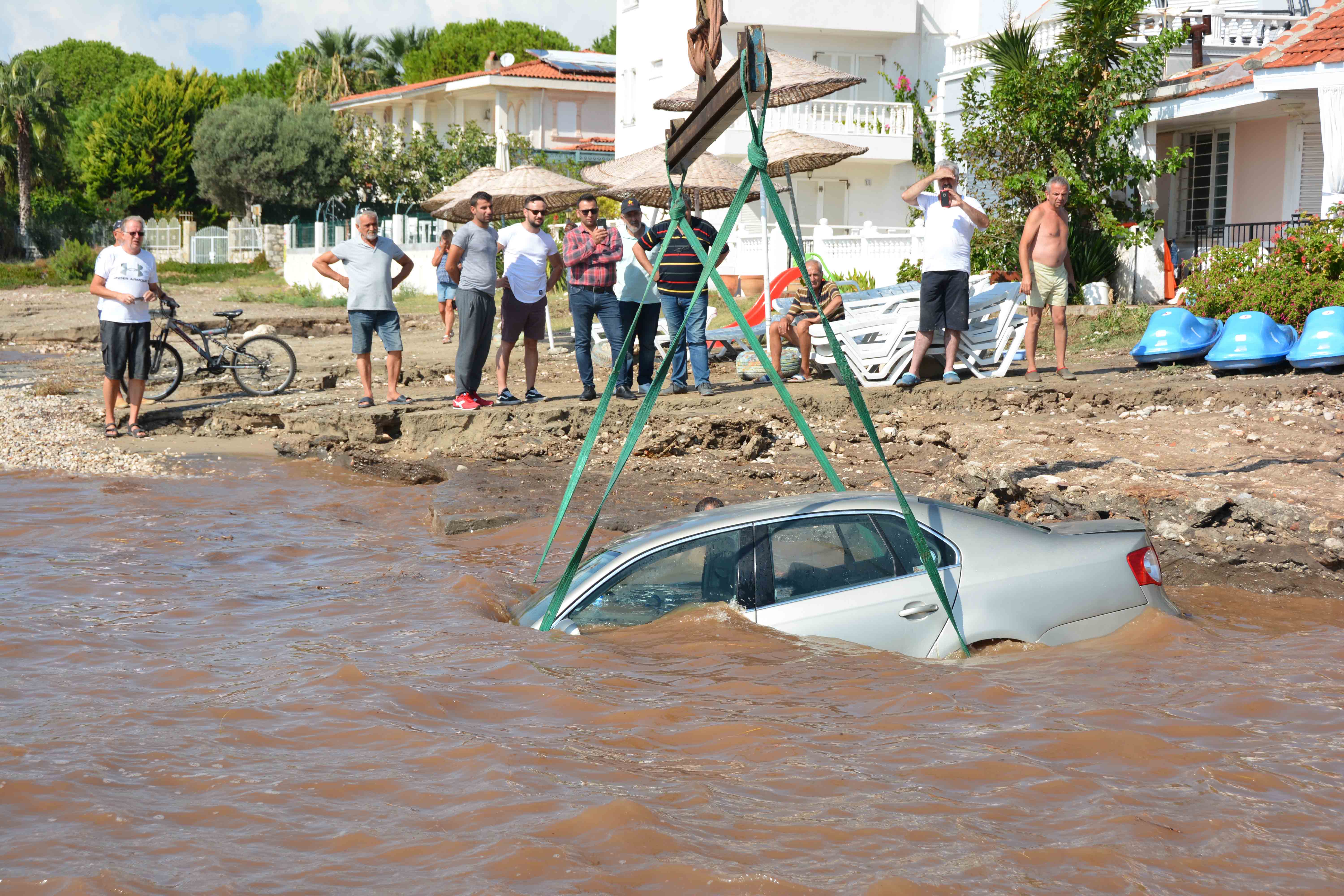 Sağanak sonrası oluşan taşkın nedeniyle Orman Kampı mevkisinde park halindeki bir otomobil denize sürüklendi.