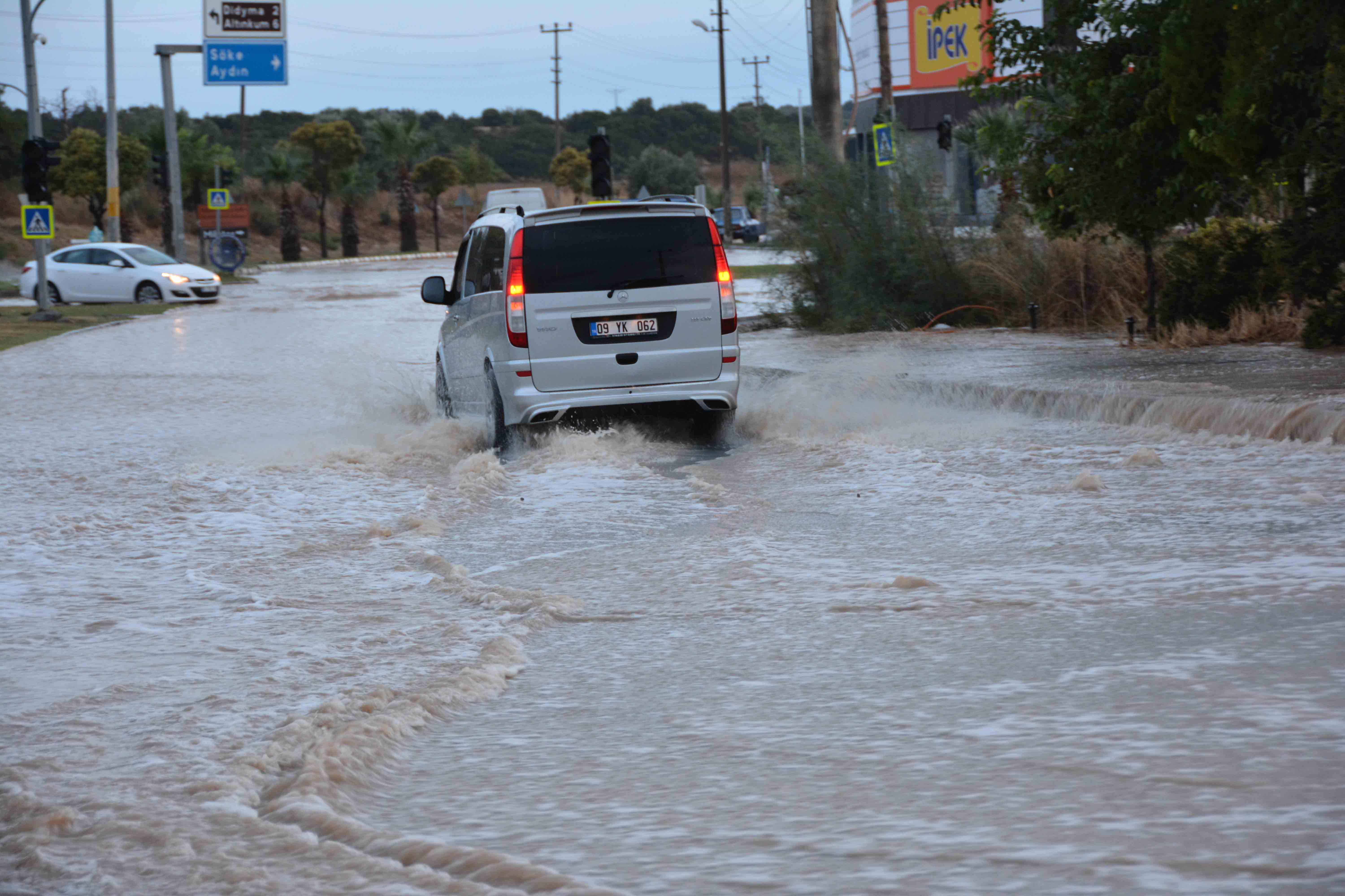 Aydın'ın Didim ilçesinde etkili olan sağanak nedeniyle bazı ev ve iş yerlerini su bastı, bir otomobil denize sürüklendi.