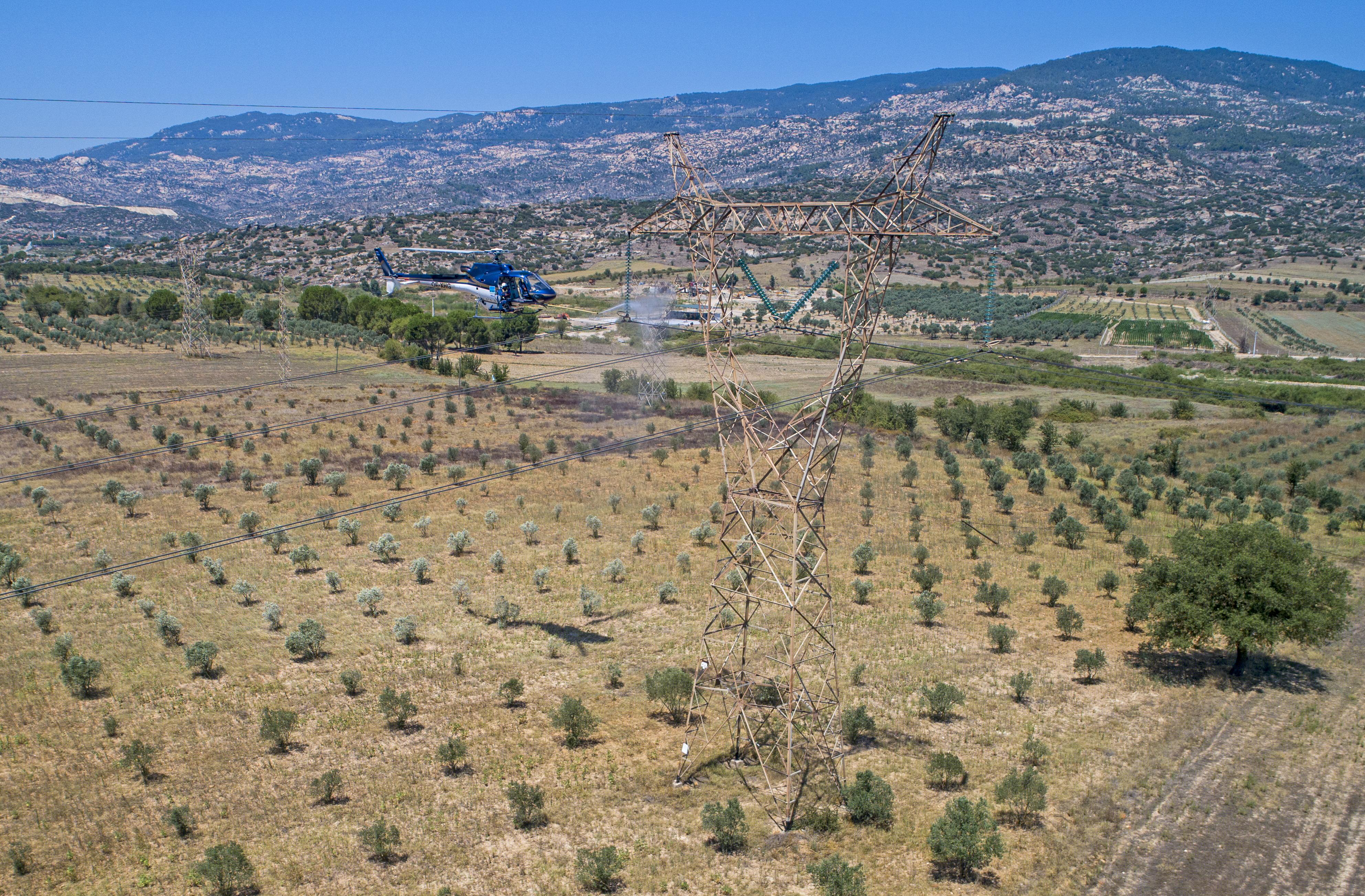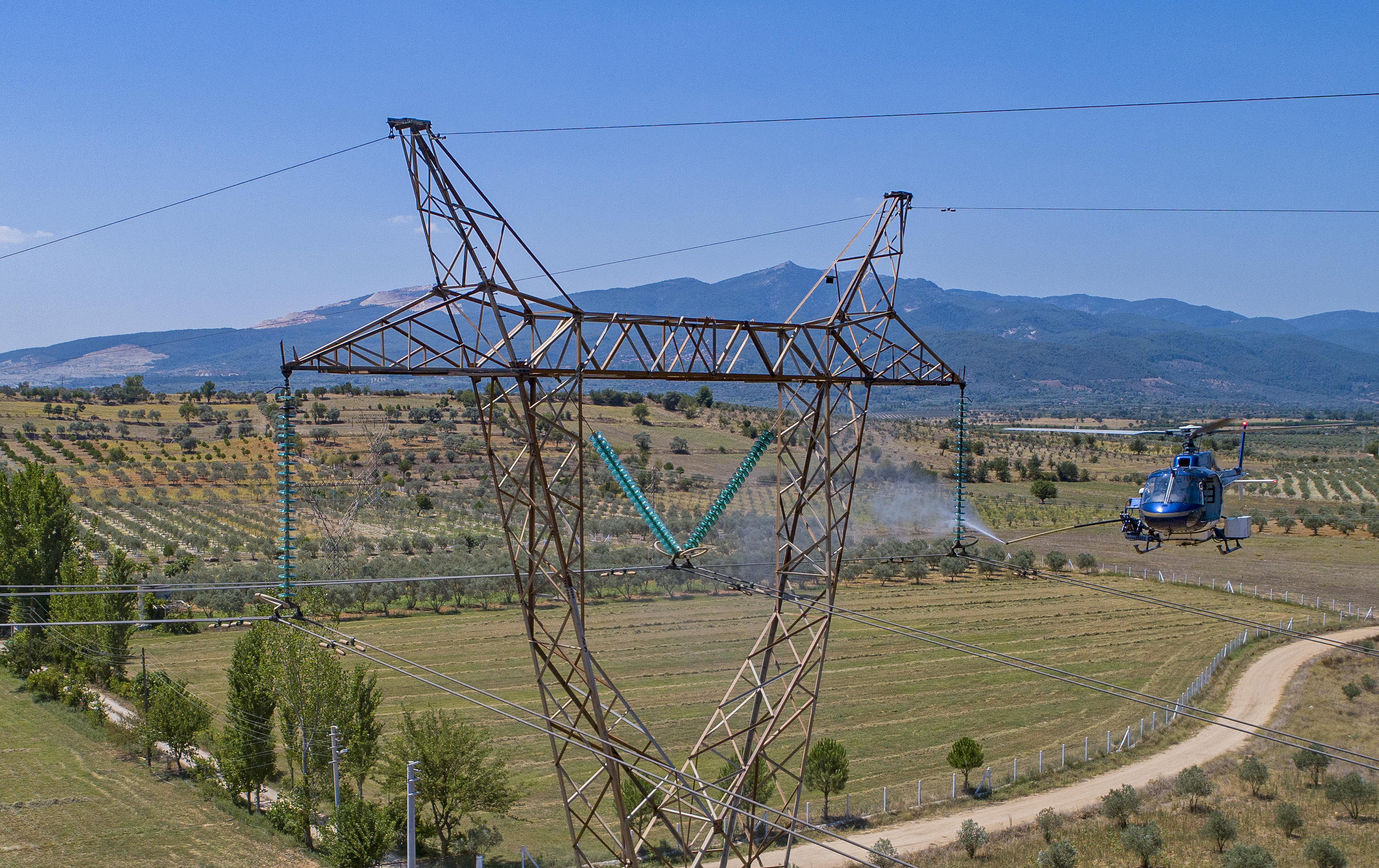 Geçen sürede toz, kum, kimyasal atıklar, tarımsal ilaçlar, deniz tuzu gibi nedenlerle kirlenen ve iletim sisteminin performansını azaltan izolatörlerin temizliği, helikopterden sıkılan saflaştırılmış suyla yapılıyor.